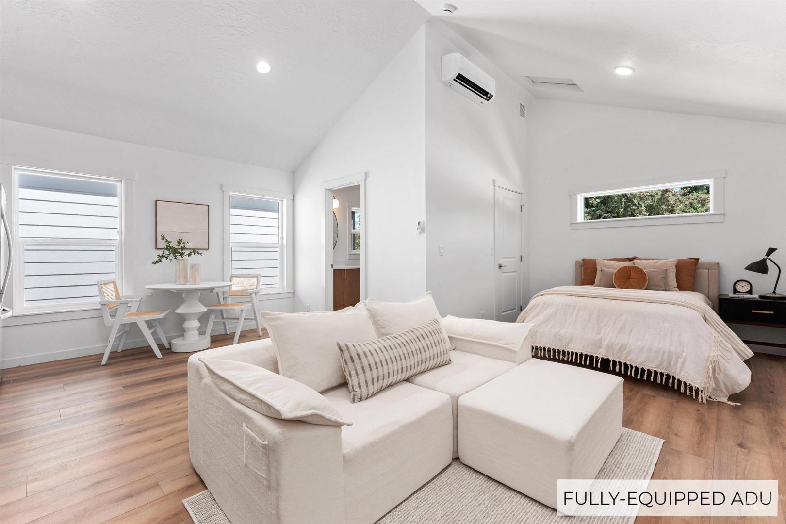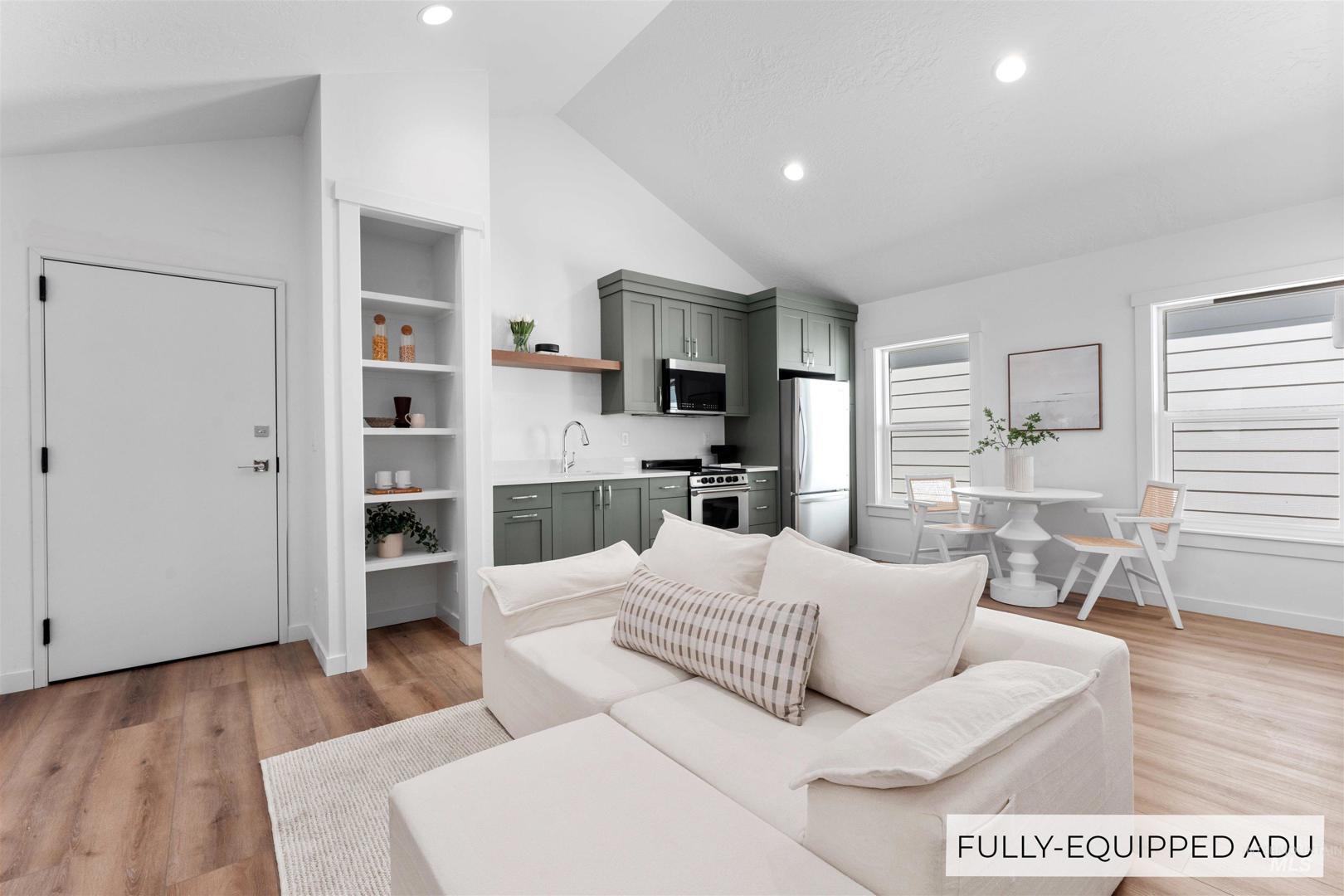 Step into effortless living in Northwest Boise, where modern design meets everyday flexibility in this newly built home by Iron Haven Homes. This property is ideal for those seeking a carefree lifestyle with the added value of an income-producing ADU or private guest suite. The open-concept layout creates a welcoming space for relaxing or entertaining, highlighted by wide-plank wood floors and elevated design elements. The kitchen features a sleek quartz island, custom cabinetry, walk-in pantry, tile backsplash, and stainless steel appliances. The luxe master suite includes a spa-style bath, with dual sinks, tile flooring, and a walk-in closet. A fully registered ADU offers the ultimate versatility for short-term rental, long-term income, workspace, or private quarters for guests. With yard care managed by the HOA, you’re free to lock up and head out for travel, a weekend downtown, or time in the Boise foothills. This location places you minutes from schools, parks, trails, & DT Boise. (PHOTO SIMILAR)