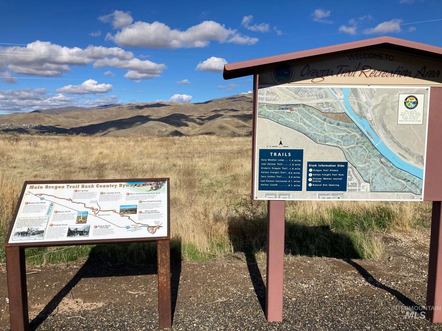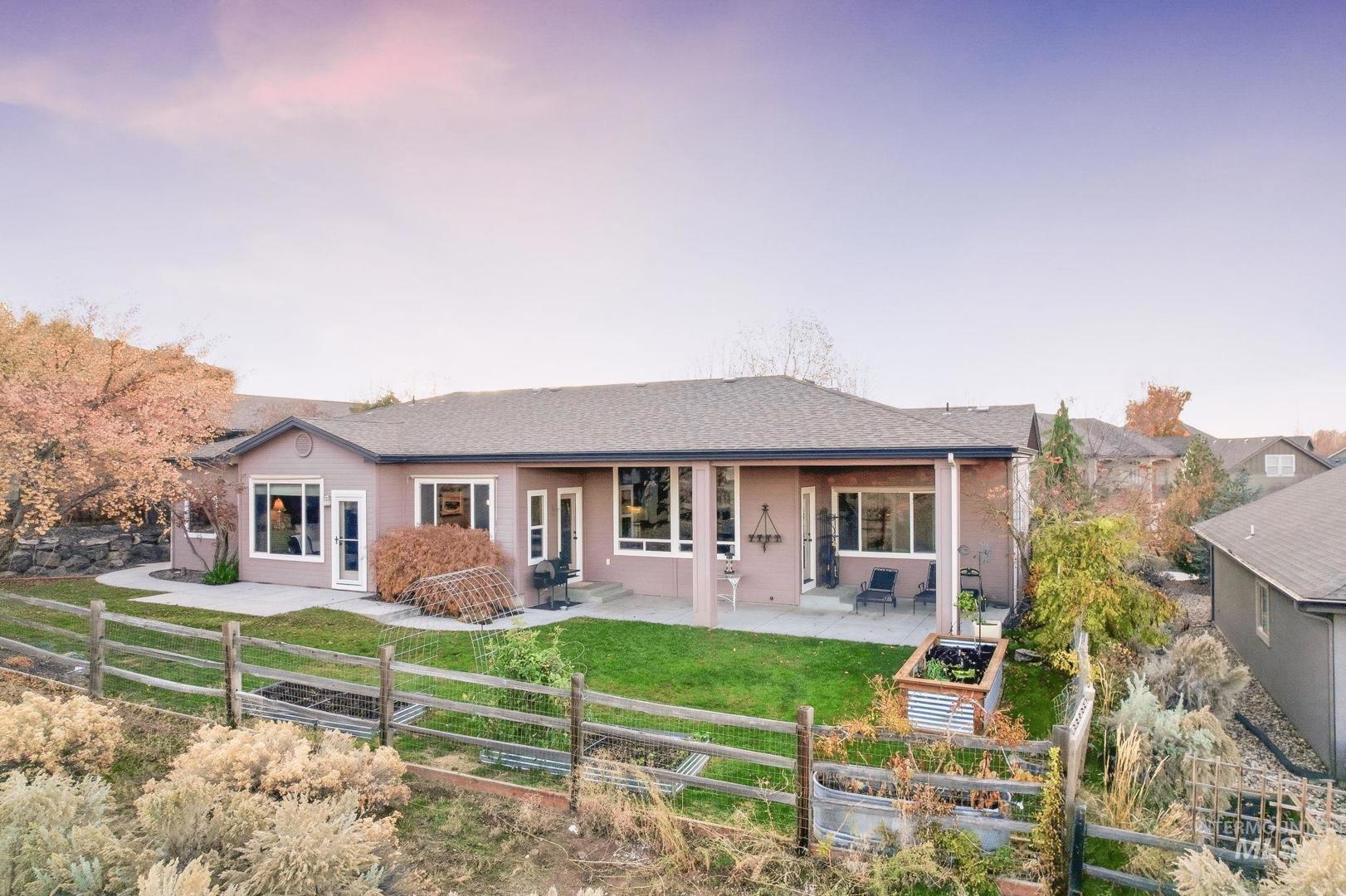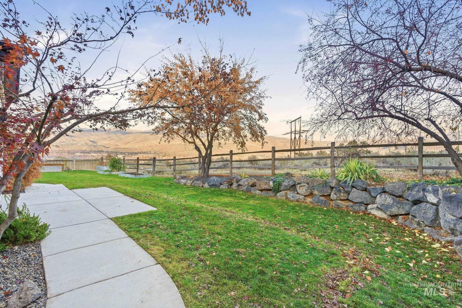 Perched on the Rim of Columbia Village this home has true unobstructed VIEWS of the foothills, Boise River & wildlife reserve & backs to protected Oregon Trail Heritage Boise City Park! Close to numerous parks, walking paths, picnic areas, Sports Complex, Rec. Center w/pools & gym, Bown Crossing, Lucky Peak, rock climbing, fishing, biking, Boise River & short distance to downtown, frwy., shopping & more. Custom built single level features; private driveway off cul-de-sac, stucco & stone accents, covered entry & perfect split bed floorplan w/picturesque windows, 10` & vaulted ceilings, gorgeous walnut hardwood flooring, utility rm. w/sink, open liv. & dining & fully finished 3 car w/mini-split heating/cooling. Kitchen features: raised breakfast bar, island, granite counters, full tile backsplash, coffee/baking center w/glass inlay cabinet doors, new kitchen appliances including gas stove, microwave, refrigerator & dishwasher, walk-in pantry, drop pendant lighting & open to 18x10 elegant dining room! 16x14 Primary suite w/views & extended patio access, inviting private bath w/deep soaker tub & huge walk-in shower w/bench, extensive tile flooring, dual vanities & giant walk-in closet! Spacious living room welcomes you w/vaulted ceiling, gas fireplace & views! Meticulous landscaping, garden boxes, mature trees/shrubs & covered & extended east facing rear patio perfect for entertaining!