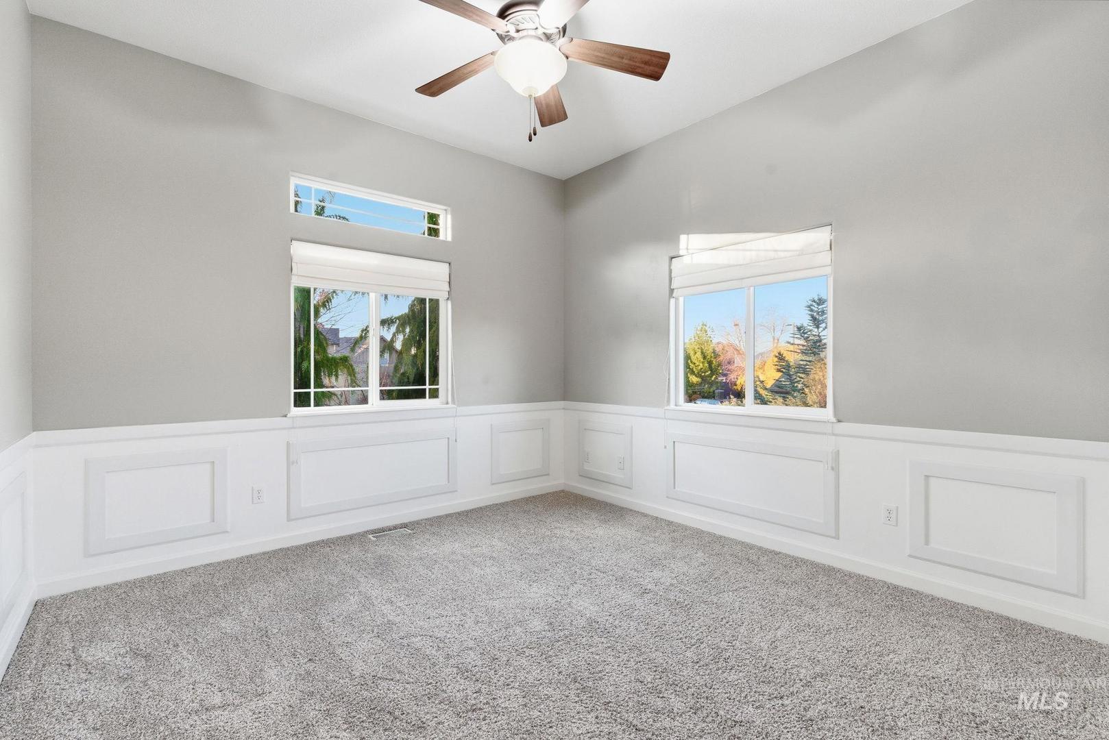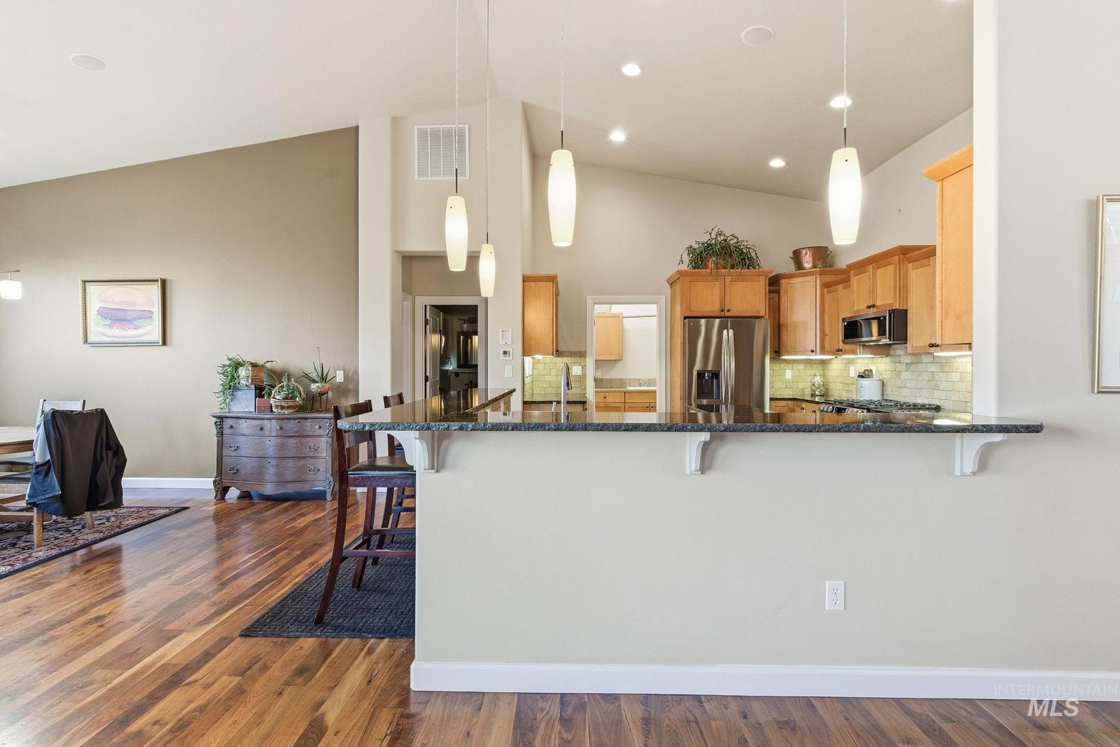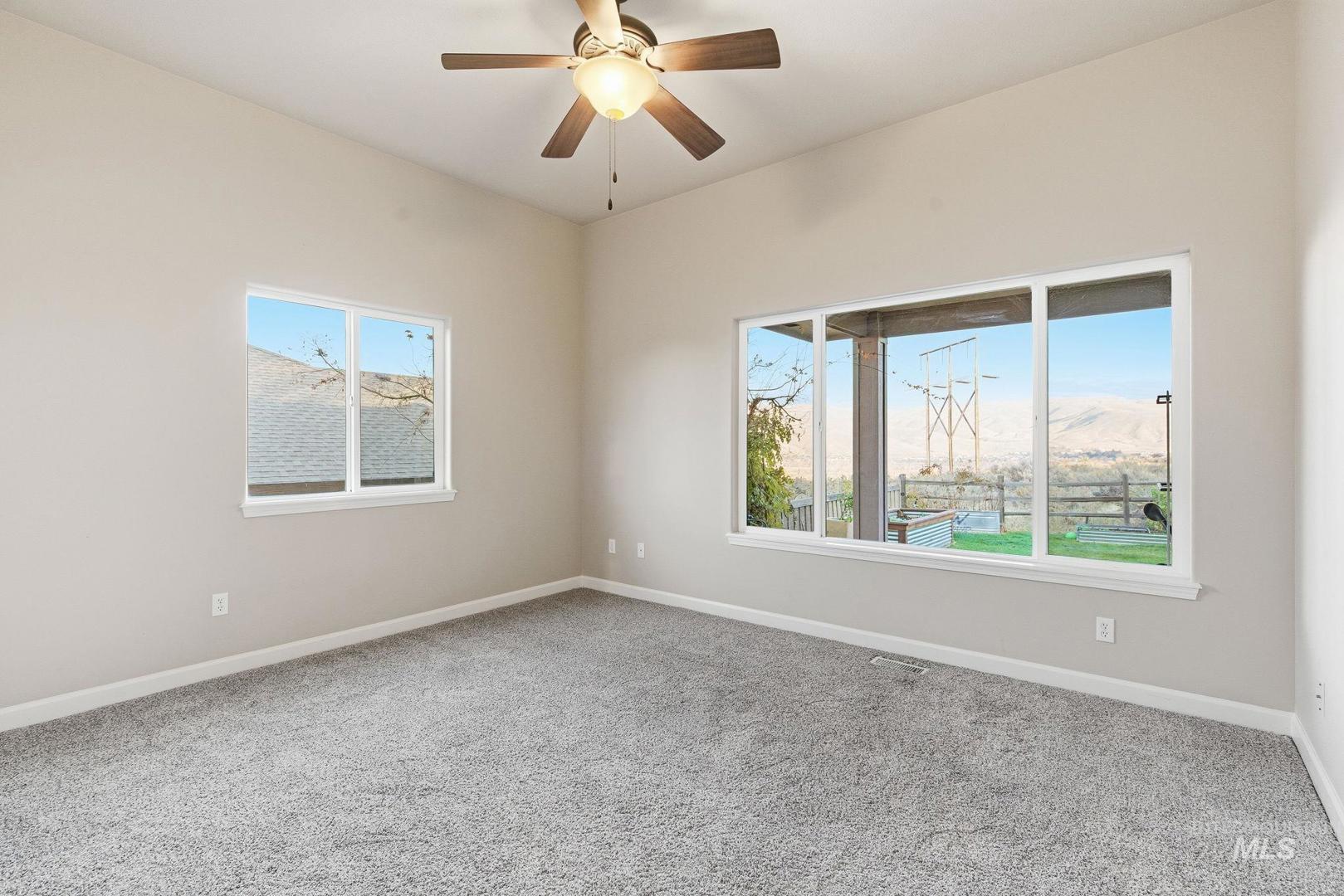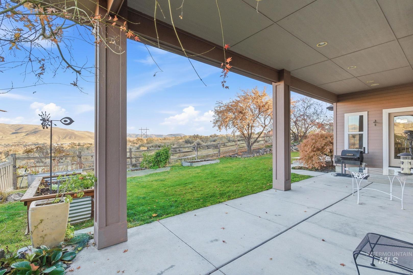 Perched on the Rim of Columbia Village this home has true unobstructed VIEWS of the foothills, Boise River & wildlife reserve & backs to protected Oregon Trail Heritage Boise City Park! Close to numerous parks, walking paths, picnic areas, Sports Complex, Rec. Center w/pools & gym, Bown Crossing, Lucky Peak, rock climbing, fishing, biking, Boise River & short distance to downtown, frwy., shopping & more. Custom built single level features; private driveway off cul-de-sac, stucco & stone accents, covered entry & perfect split bed floorplan w/picturesque windows, 10` & vaulted ceilings, gorgeous walnut hardwood flooring, utility rm. w/sink, open liv. & dining & fully finished 3 car w/mini-split heating/cooling. Kitchen features: raised breakfast bar, island, granite counters, full tile backsplash, coffee/baking center w/glass inlay cabinet doors, new kitchen appliances including gas stove, microwave, refrigerator & dishwasher, walk-in pantry, drop pendant lighting & open to 18x10 elegant dining room! 16x14 Primary suite w/views & extended patio access, inviting private bath w/deep soaker tub & huge walk-in shower w/bench, extensive tile flooring, dual vanities & giant walk-in closet! Spacious living room welcomes you w/vaulted ceiling, gas fireplace & views! Meticulous landscaping, garden boxes, mature trees/shrubs & covered & extended east facing rear patio perfect for entertaining!