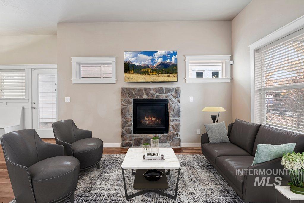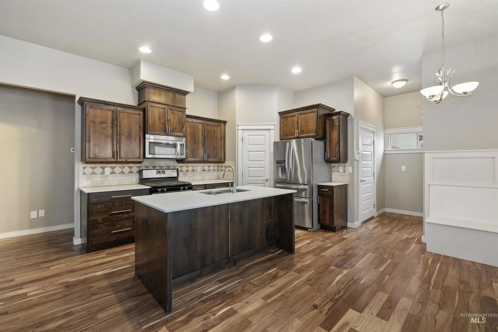 Welcome to this inviting 3-bedroom home with a flexible loft and a bright, open-concept layout. The main-floor primary suite offers convenience and comfort, while the kitchen features stainless steel appliances, a spacious island, and a walk-in pantry for extra storage. A built-in bench adds charm to the dining nook, and a cozy gas fireplace enhances the living area. Upstairs includes two additional bedrooms, a full bath, and a versatile loft. Enjoy a fully fenced, low-maintenance yard and an alley-access 2-car garage. Ideally located in the Hazelwood Village near restaurants, grocery options, coffee shops, and more. Community amenities include, pool, club house and common areas!