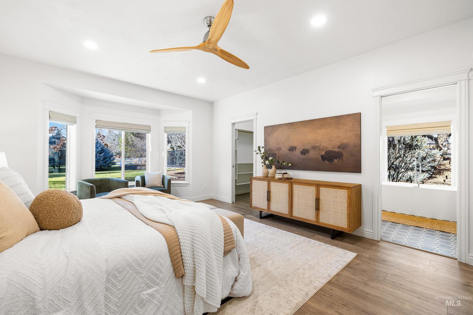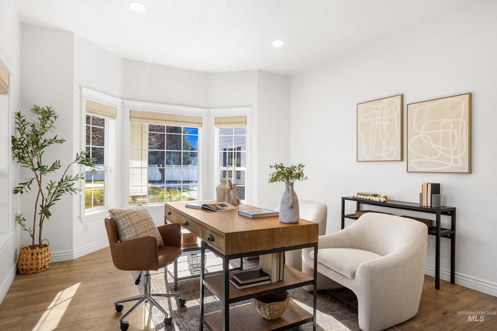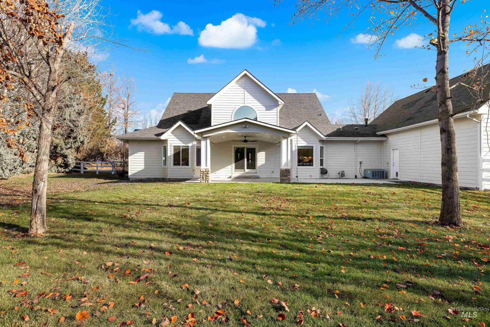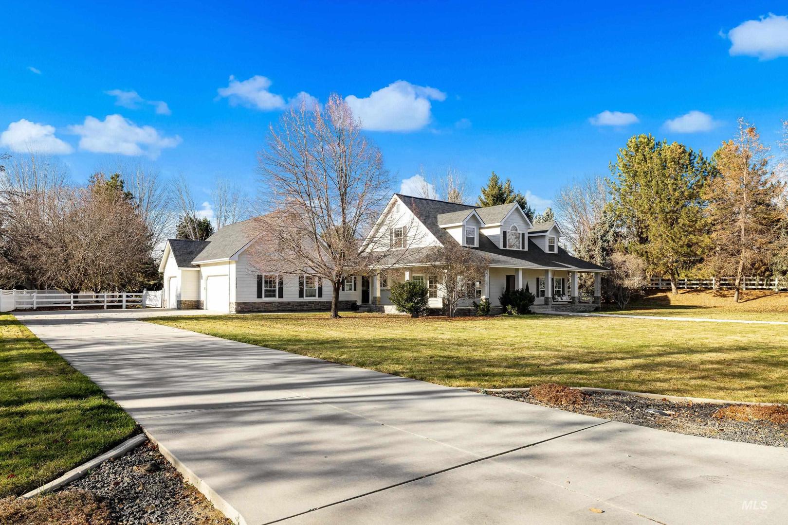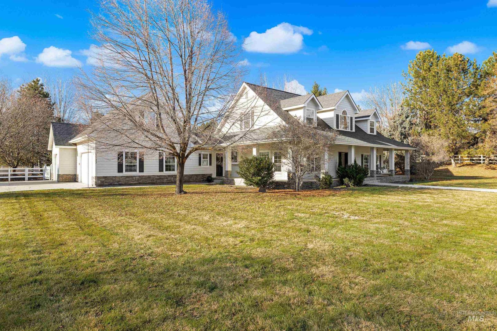 Welcome to this warm and thoughtfully updated custom home on a rare full acre lot in Eagle’s sought-after community, The Colony. Designed for cozy living & effortless gathering, the home features 4 bedrooms, 3.5 baths, plus a dedicated office, & spacious separate-entrance bonus room above the 3-car extended bay garage—perfect for a studio, gym, or multigenerational space. Fall in love with the beautiful wrap around porch & attractive entry walkway. Inside, natural light pours through the new front window, capturing the dramatic height of vaulted ceilings. The main level holds an oversized primary suite that feels like a peaceful getaway with serene views of the estate-sized backyard from both the bay windows & private ensuite, including a new spa-like soaker tub. A secondary guest suite with full bath, plus private office & half bath allow for ideal accommodations. Upstairs 2 additional bedrooms serviced by a full bath & attractive railing overlook the main living below. Modern updates include interior/exterior paint, new carpet, quartz counters & tile finishes while charming architectural details make this home truly one-of-a-kind. Outdoors, the large covered patio & expansive one-acre corner lot delivers room to add to your property. Enjoy mature landscaping, spacious lawns, & the kind of privacy that’s hard to find in the heart of Eagle, Idaho.