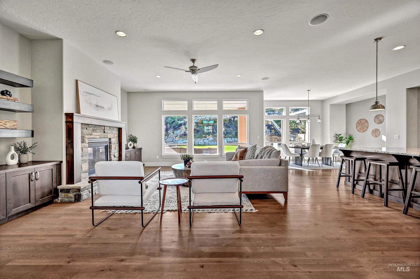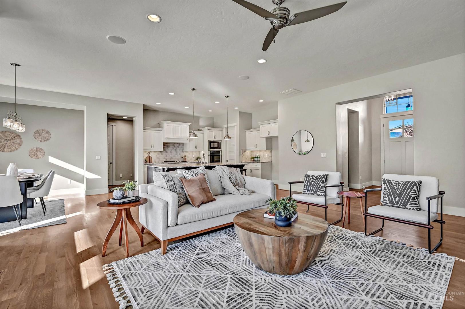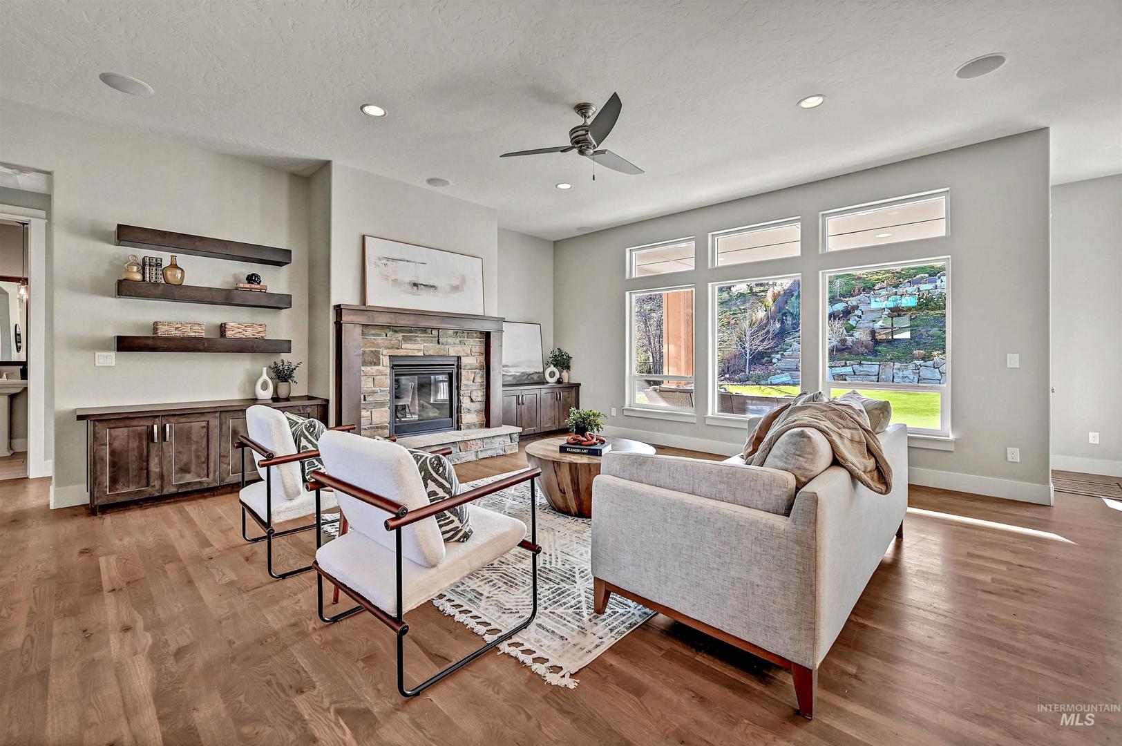 An amazing opportunity to live in sought after Sky Mesa. This home has over 3000 sq ft on a single level with bonus room, oversized three plus car garage, and a half acre lot with room for soccer, gardening, and patio living overlooking the Boise foothills. The home and grounds are special and unique to the neighborhood, something to see. Landscaped to take advantage of the views, walk the beautiful stone stairs to a resort-like patio setting overlooking the valley and Boise front. The patio is plumbed with electric and water for evenings by the fire and enjoying the beautiful valley. Interior offers a great room concept, amazing kitchen and pantry, soaring ceilings, built-in TV cabinets and fireplace, office/den, separate laundry and mud rooms, and split living bedroom plan. This home has it all and then some. Minutes to Discovery Park and walking distance to schools, restaurants, and shopping.