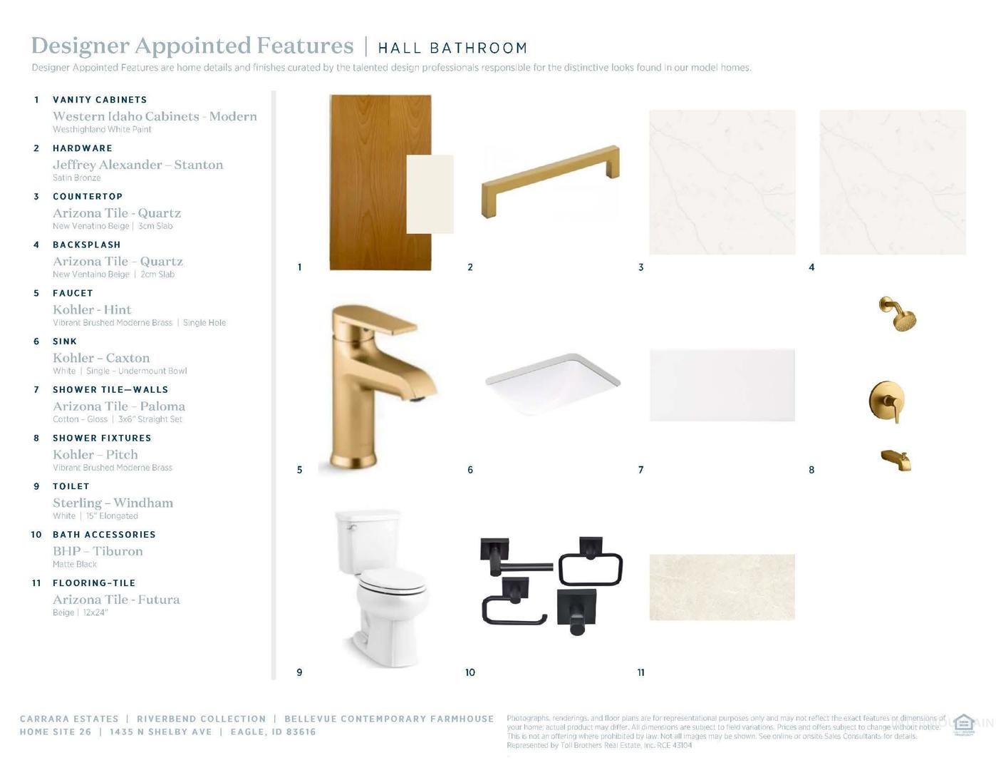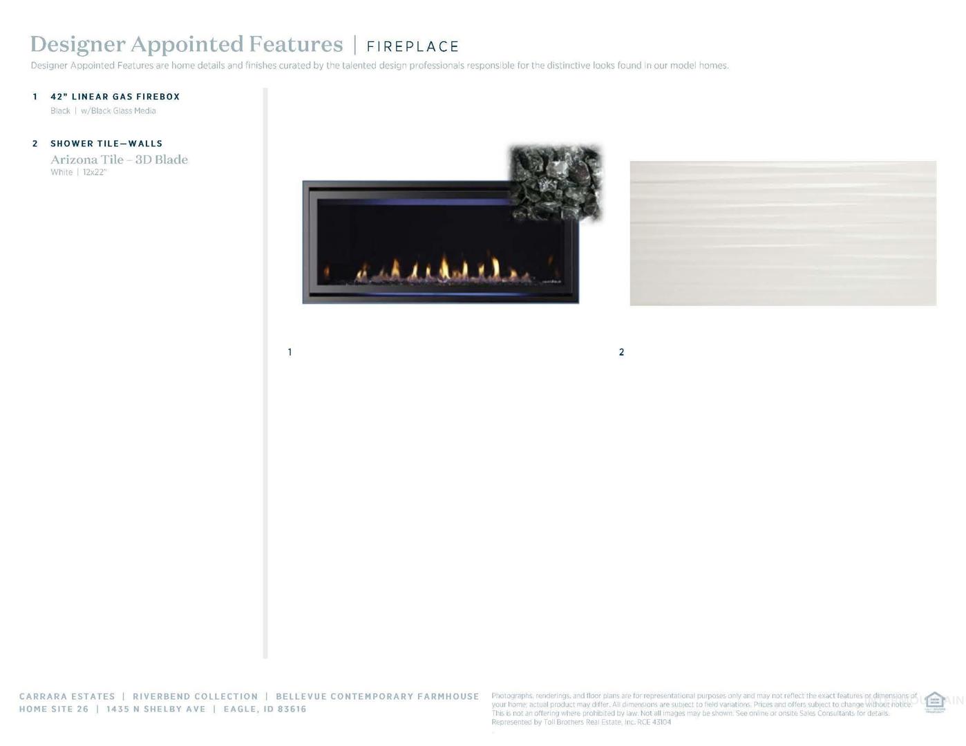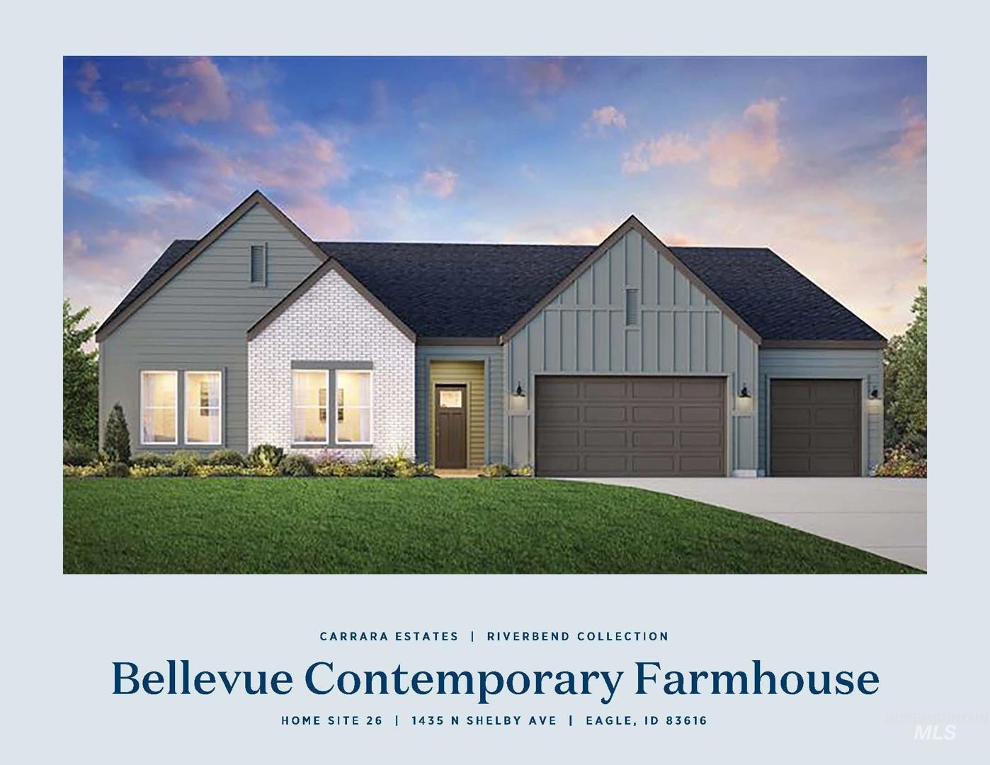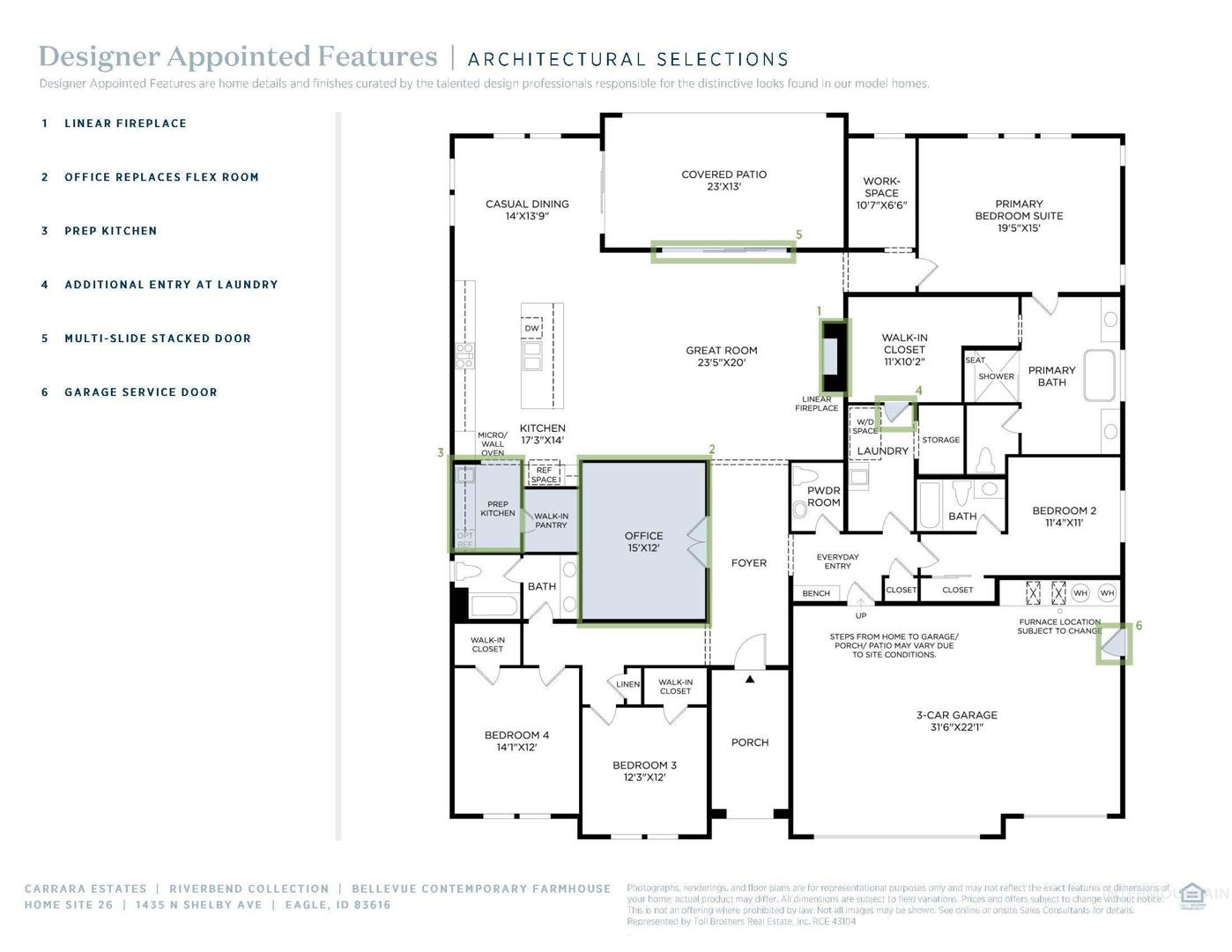 The Bellevue Contemporary Farmhouse blends comfort with elegant design in a spacious single-level floor plan. From the foyer, an open-floor layout connects the great room with cozy fireplace, casual dining area, and kitchen with a center island and walk-in pantry. Just beyond through a multi panel glass door, a generous covered patio offers effortless outdoor living. The primary bedroom suite features a spacious walk-in closet and a spa-inspired bath with dual vanities, a large soaking tub, a shower with seat, and a private water closet. Three secondary bedrooms—one with a private bath and two with a shared hall bath—offer comfort and privacy for family or guests. A flex room and rear workspace add versatility, while the laundry area, powder room, everyday entry, and smart storage enhance daily convenience. Toll Brothers homesite #26. BTVAI