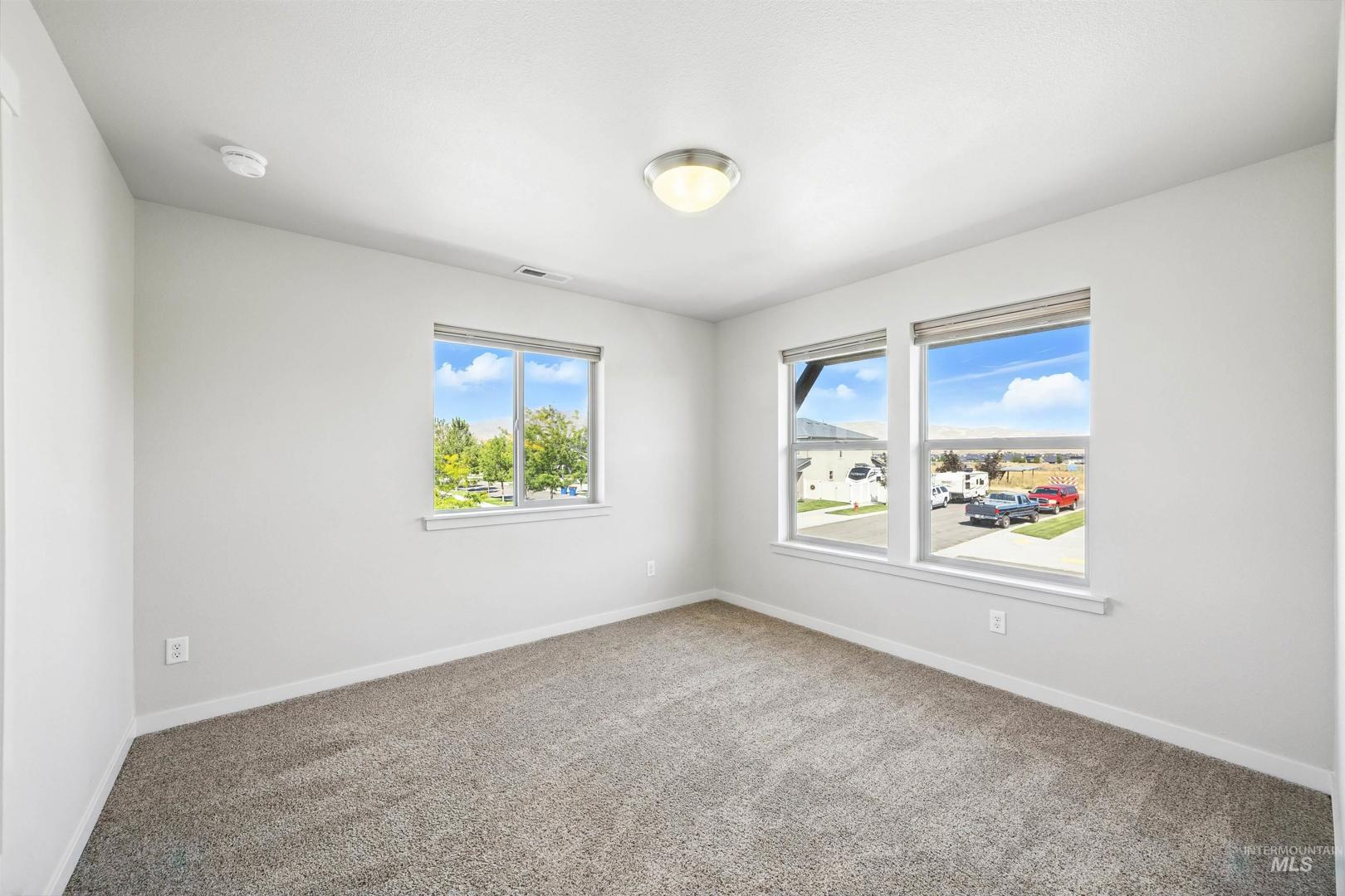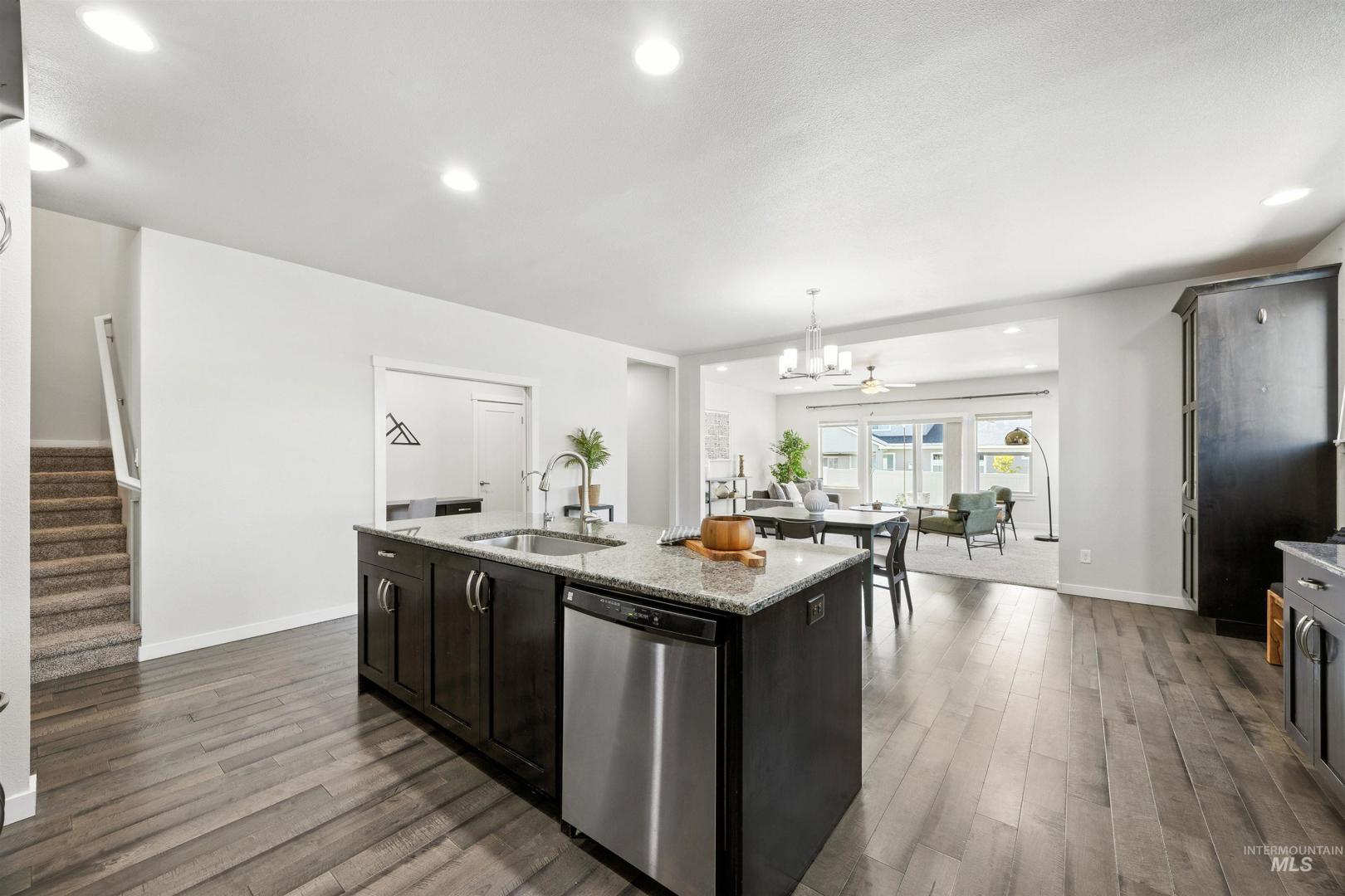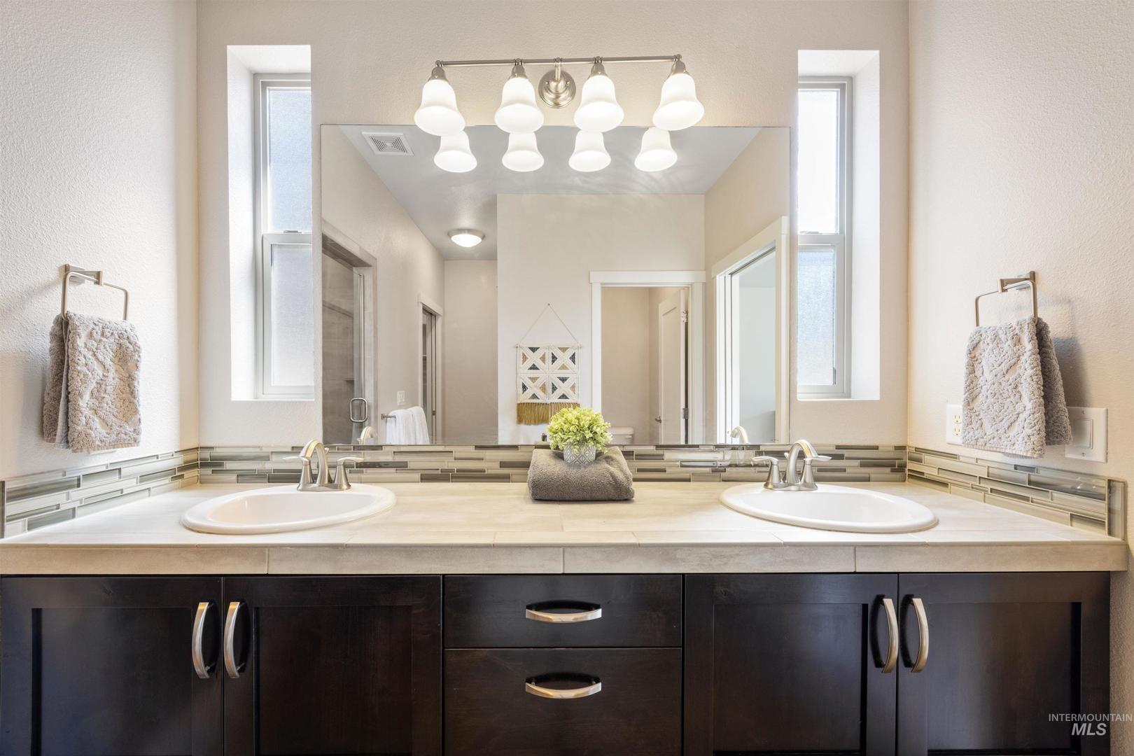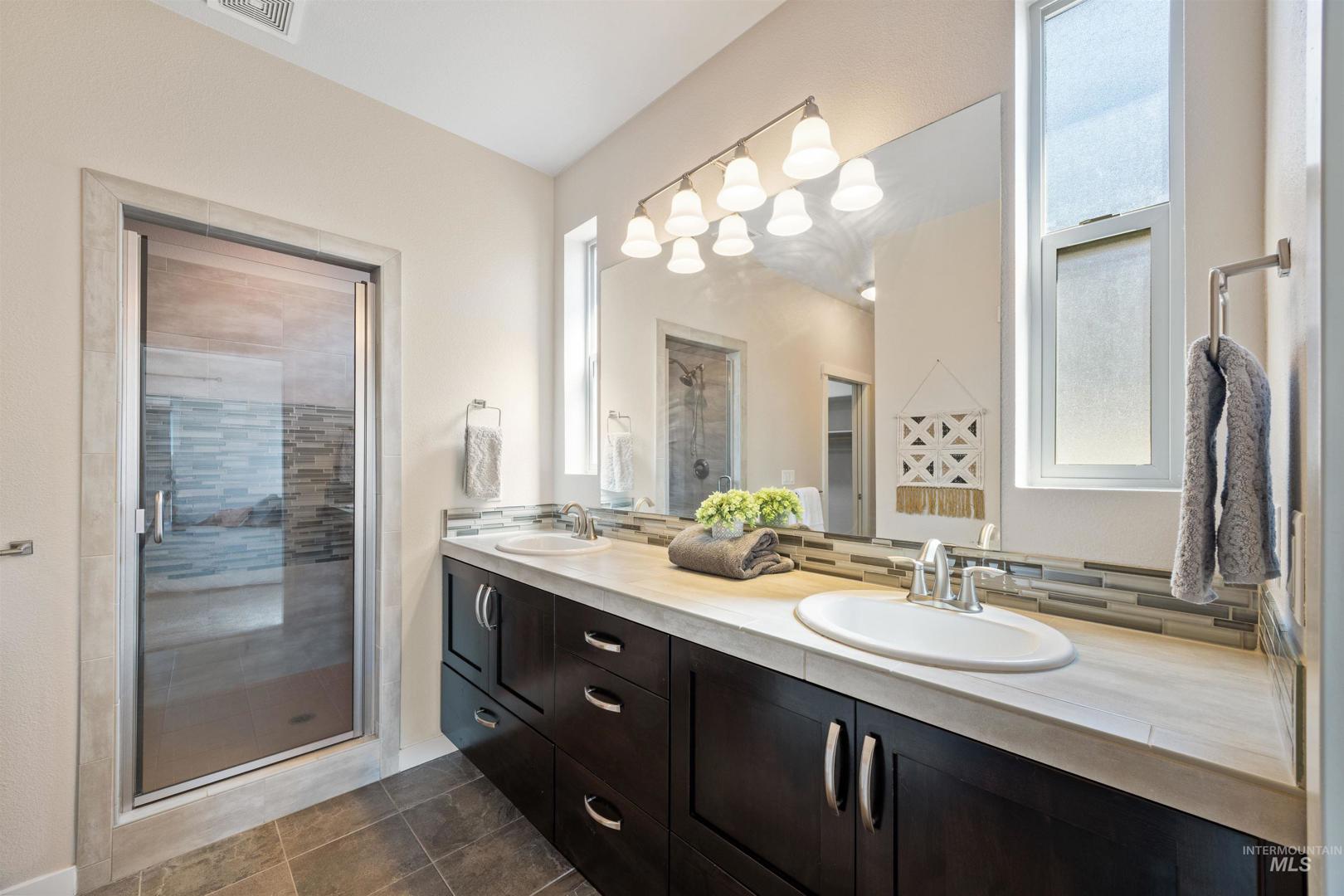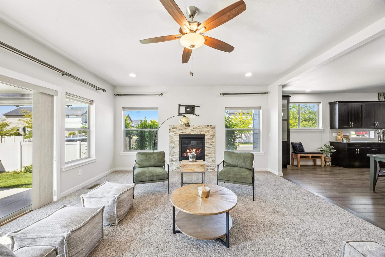 Welcome to this beautiful home, boasting an open floor plan w/ seamless living spaces & high-end finishes. The inviting living room features a cozy gas fireplace. The heart of the home, the kitchen, is a chef’s dream, with a spacious island, breakfast bar, quartz countertops, SS appliances, gas range, and pantry. The main level is home to the luxurious primary suite, offering privacy and comfort with a private patio walk-out, spa-like tile shower, and a generous walk-in closet. A guest suite is also on the main floor, complete with its own full bathroom—ideal for visitors or multi-generational living. A tech room/office provides the perfect space for working from home or organizing your life. Upstairs, you`ll find two more spacious bedrooms and a full bathroom. A corner lot provides both privacy and space with full vinyl fencing, covered patio and permanent holiday lights. The garage is equipped with epoxy flooring, EV charger & water softener. There is also a RO System. Access to a community pool and park!