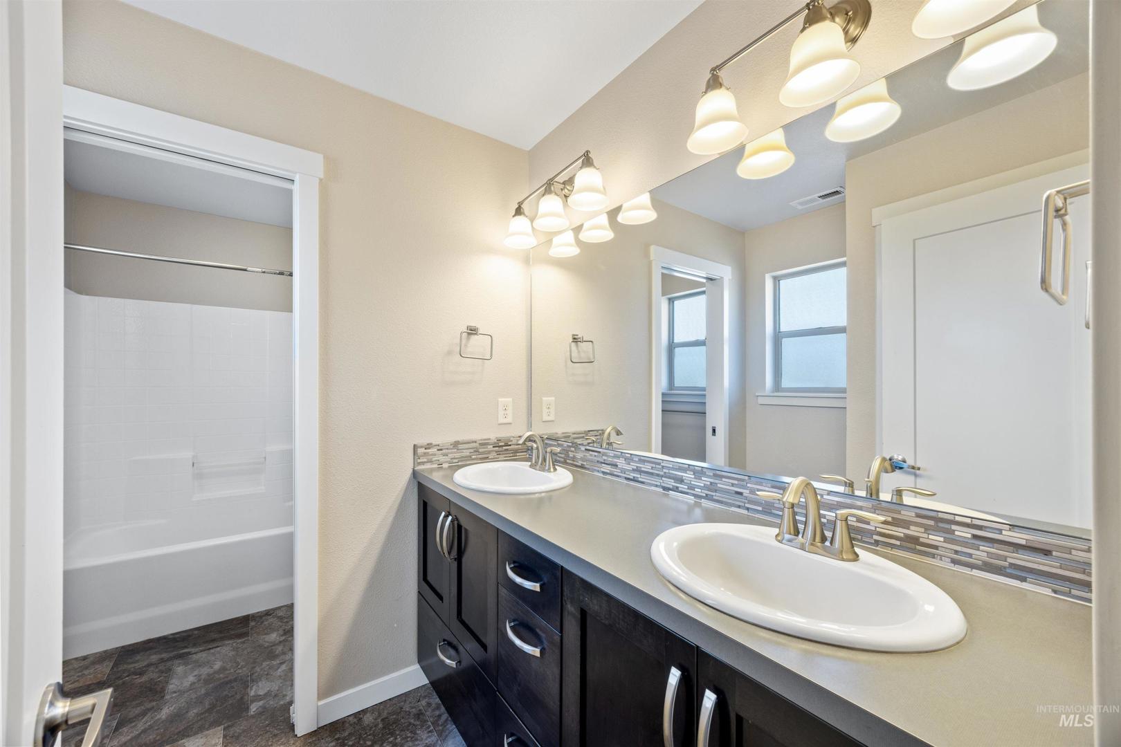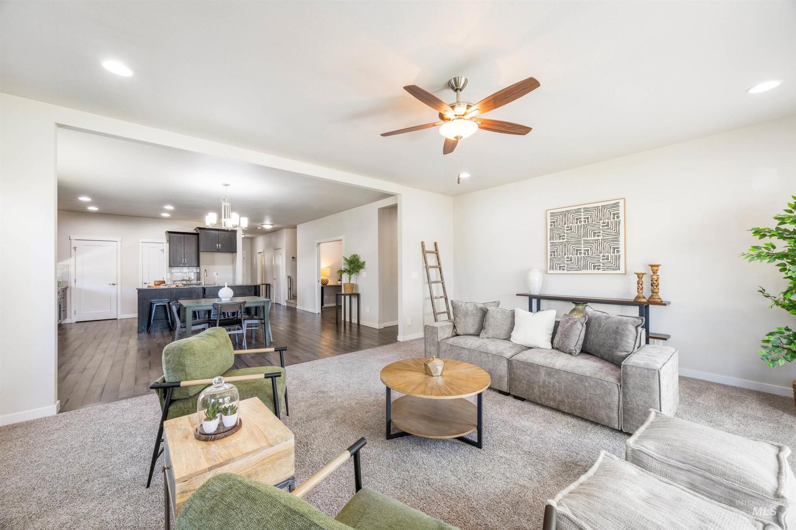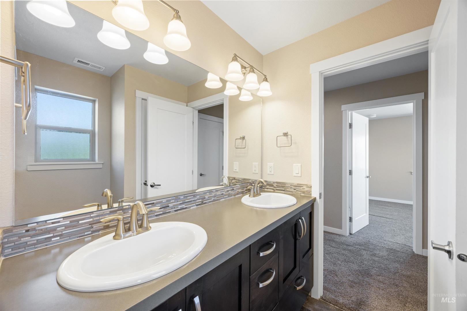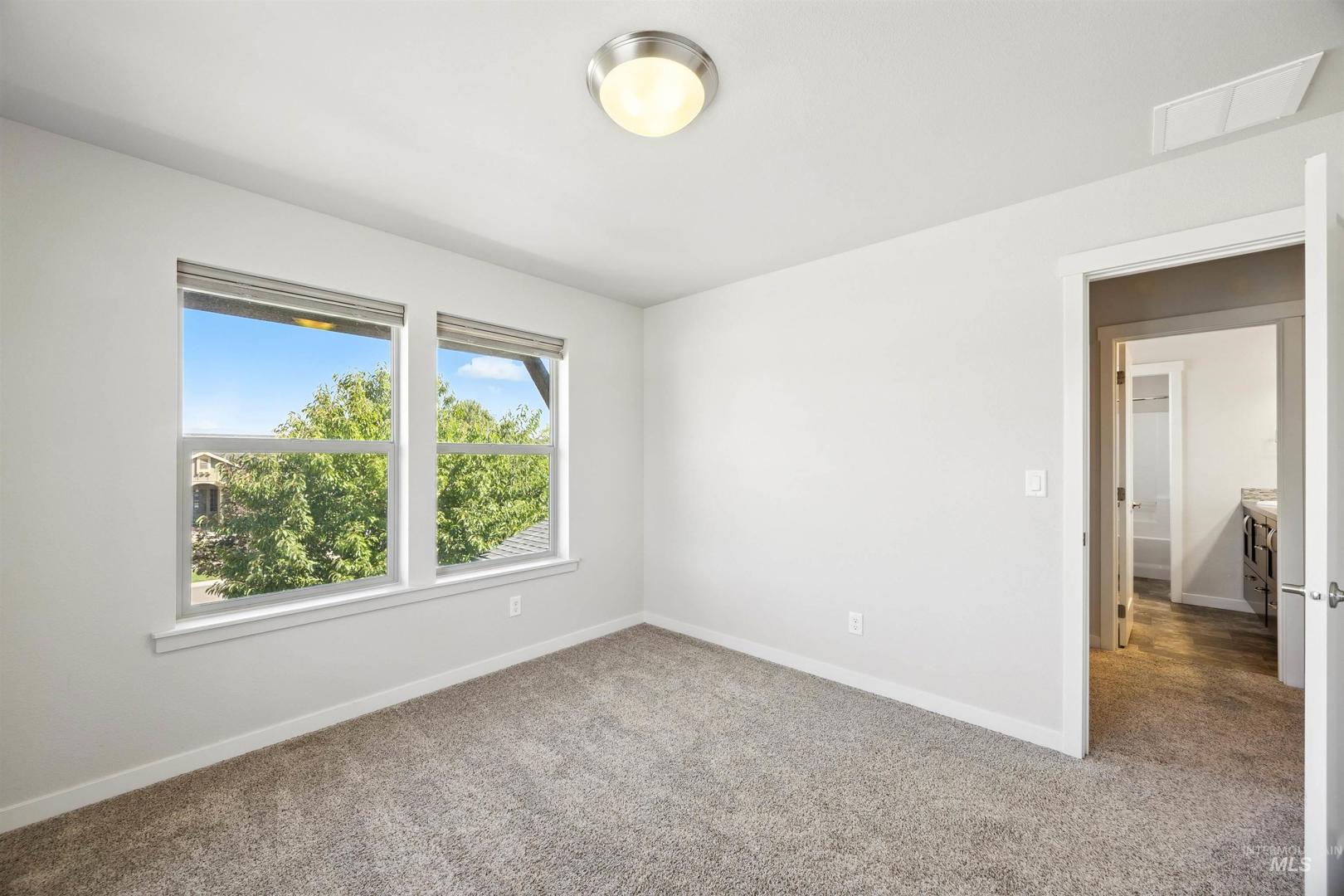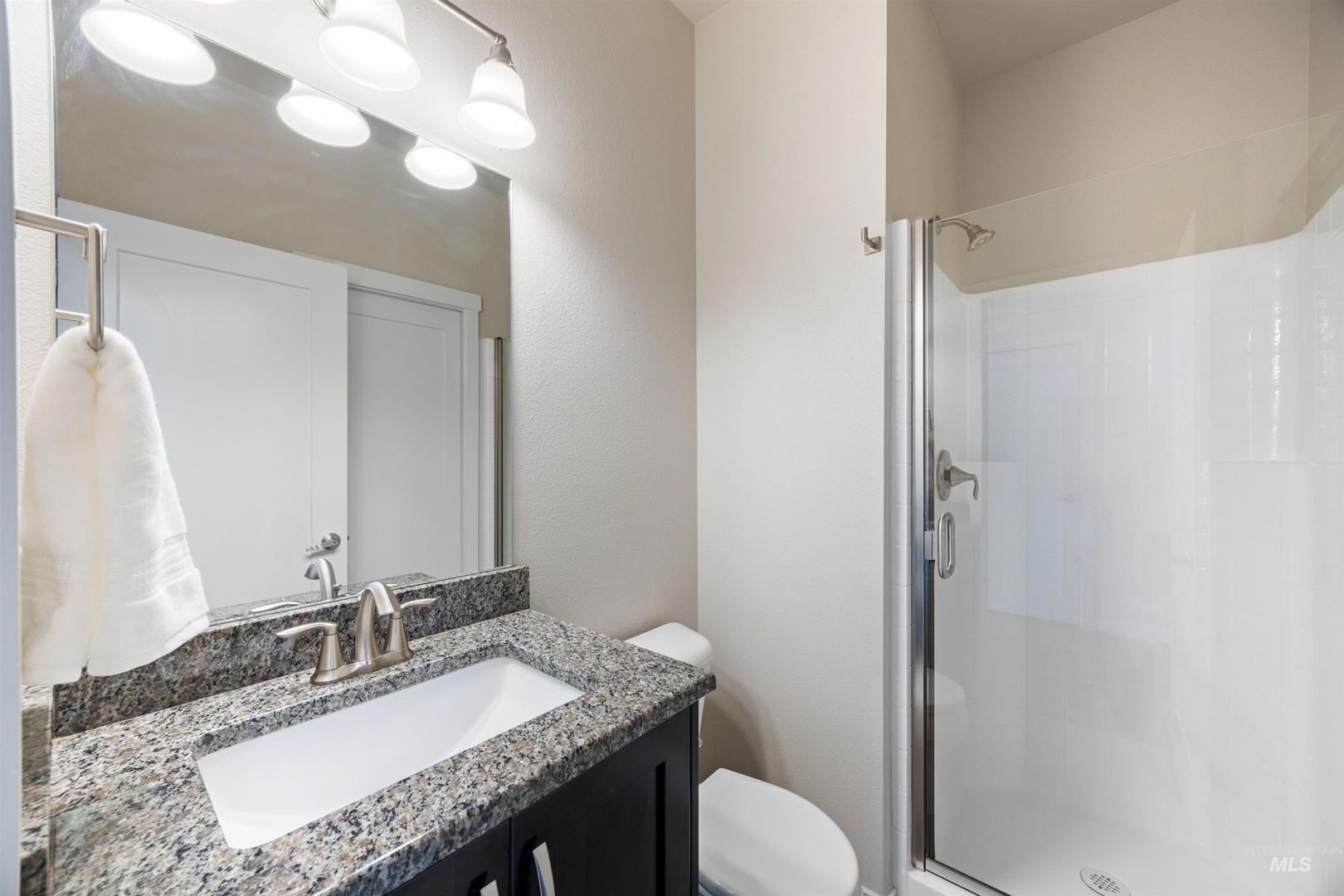 Welcome to this beautiful home, boasting an open floor plan w/ seamless living spaces & high-end finishes. The inviting living room features a cozy gas fireplace. The heart of the home, the kitchen, is a chef’s dream, with a spacious island, breakfast bar, quartz countertops, SS appliances, gas range, and pantry. The main level is home to the luxurious primary suite, offering privacy and comfort with a private patio walk-out, spa-like tile shower, and a generous walk-in closet. A guest suite is also on the main floor, complete with its own full bathroom—ideal for visitors or multi-generational living. A tech room/office provides the perfect space for working from home or organizing your life. Upstairs, you`ll find two more spacious bedrooms and a full bathroom. A corner lot provides both privacy and space with full vinyl fencing, covered patio and permanent holiday lights. The garage is equipped with epoxy flooring, EV charger & water softener. There is also a RO System. Access to a community pool and park!