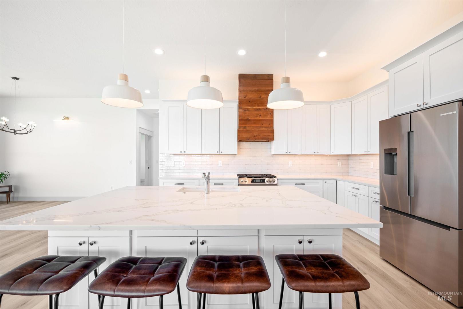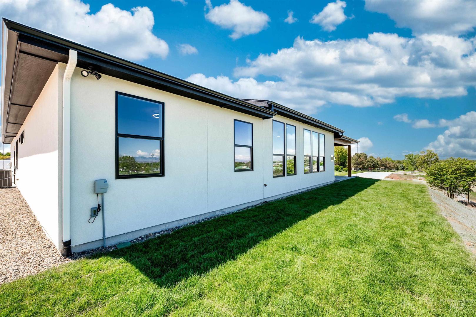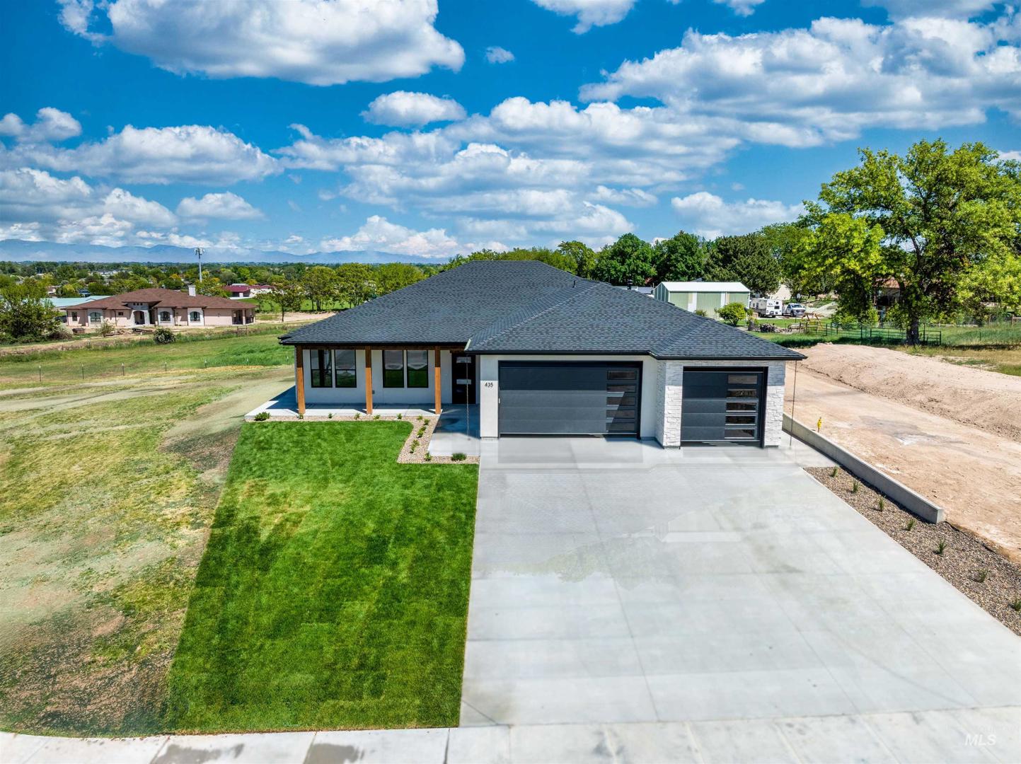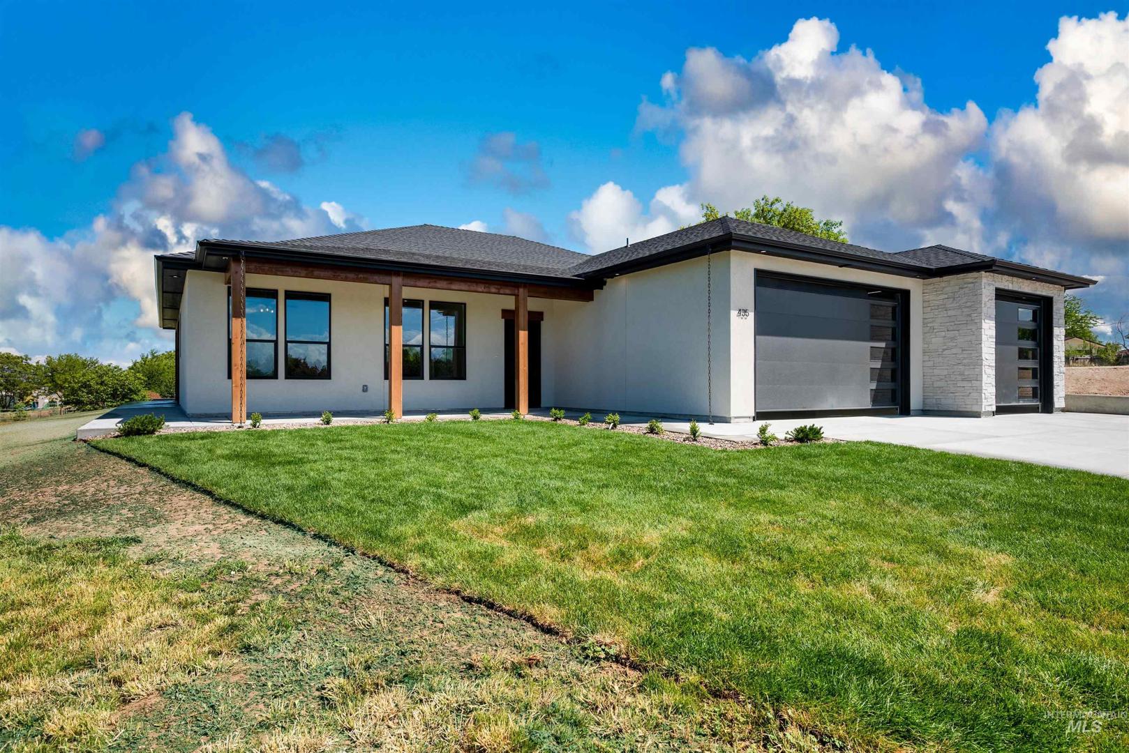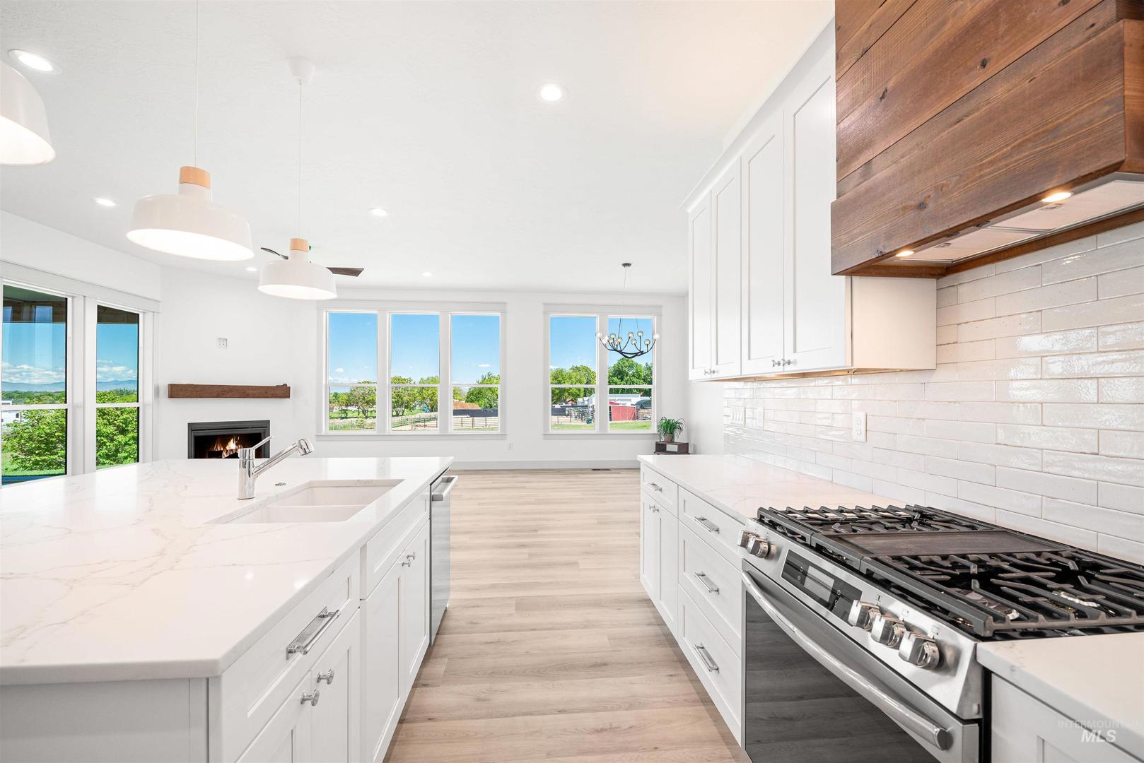 Builder offering a $10,000 buyer credit at close! This is a one-of-a-kind beautifully designed custom home built by Hannu Homes. You`ll enjoy panoramic views of Squaw Butte Mountains & Bogus Basin from your east facing back covered porch. You can also enjoy the views from inside this open floorplan w/ oversized windows. Waterproof LVP flooring throughout main living, 10` ceilings, w/ 42"gas fireplace in great room. Kitchen designed with oversized island featuring cabinets on the back side as well for extra storage, SS Bosch Appliances, tile backsplash, gas cooktop w/custom hood vent, and quartz countertops. Gorgeous butler pantry includes oven, sink, mosaic tile, beverage cooler, quartz countertops, shelving, tons of storage and again views to enjoy! Large primary suite with a private, en-suite bathroom featuring a walk in shower w/ dual shower heads, large soaker tub, and sauna for all of your wellness needs. Step out of the sauna and into a heated bathroom for cleansing. Three bedrooms, three bathrooms, plus a flex room that can be used for an office, gym, or fourth bedroom. Fully insulated garage with epoxy finish flooring, extended third bay, sink. Oversized back patio features BBQ stub, outdoor sink/washing station, with no direct back or side neighbors. This home is full of designer lighting, custom shelving, and craftsman trim package. Close to shopping, restaurants and more!