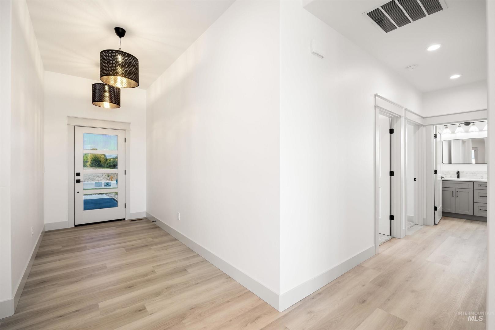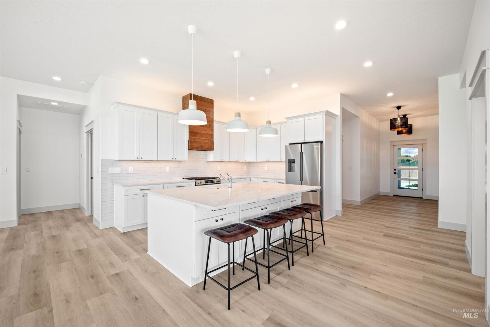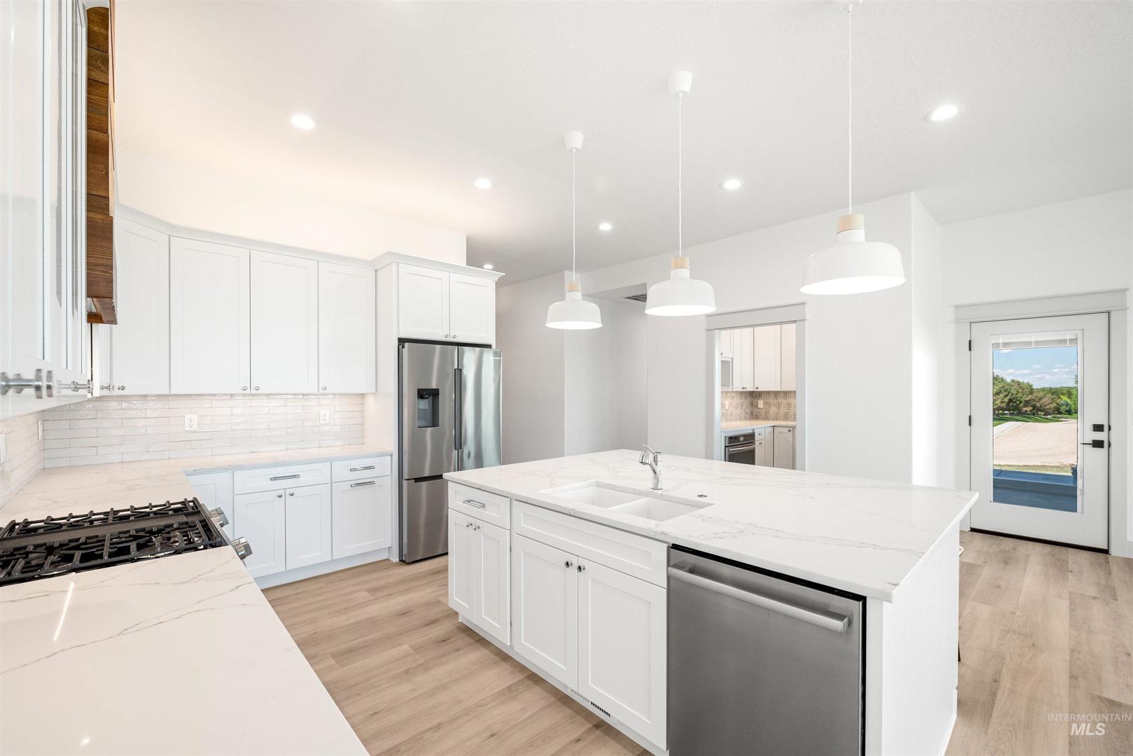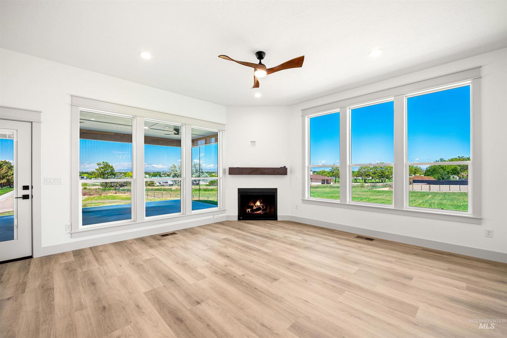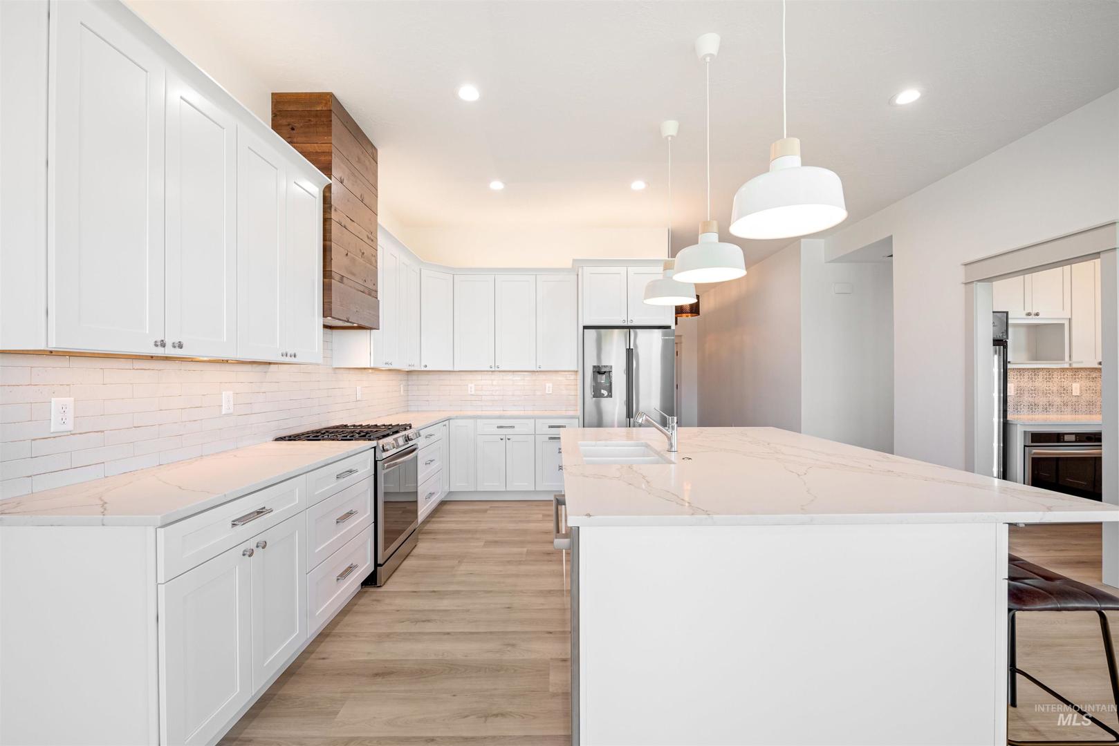 Builder offering a $10,000 buyer credit at close! This is a one-of-a-kind beautifully designed custom home built by Hannu Homes. You`ll enjoy panoramic views of Squaw Butte Mountains & Bogus Basin from your east facing back covered porch. You can also enjoy the views from inside this open floorplan w/ oversized windows. Waterproof LVP flooring throughout main living, 10` ceilings, w/ 42"gas fireplace in great room. Kitchen designed with oversized island featuring cabinets on the back side as well for extra storage, SS Bosch Appliances, tile backsplash, gas cooktop w/custom hood vent, and quartz countertops. Gorgeous butler pantry includes oven, sink, mosaic tile, beverage cooler, quartz countertops, shelving, tons of storage and again views to enjoy! Large primary suite with a private, en-suite bathroom featuring a walk in shower w/ dual shower heads, large soaker tub, and sauna for all of your wellness needs. Step out of the sauna and into a heated bathroom for cleansing. Three bedrooms, three bathrooms, plus a flex room that can be used for an office, gym, or fourth bedroom. Fully insulated garage with epoxy finish flooring, extended third bay, sink. Oversized back patio features BBQ stub, outdoor sink/washing station, with no direct back or side neighbors. This home is full of designer lighting, custom shelving, and craftsman trim package. Close to shopping, restaurants and more!