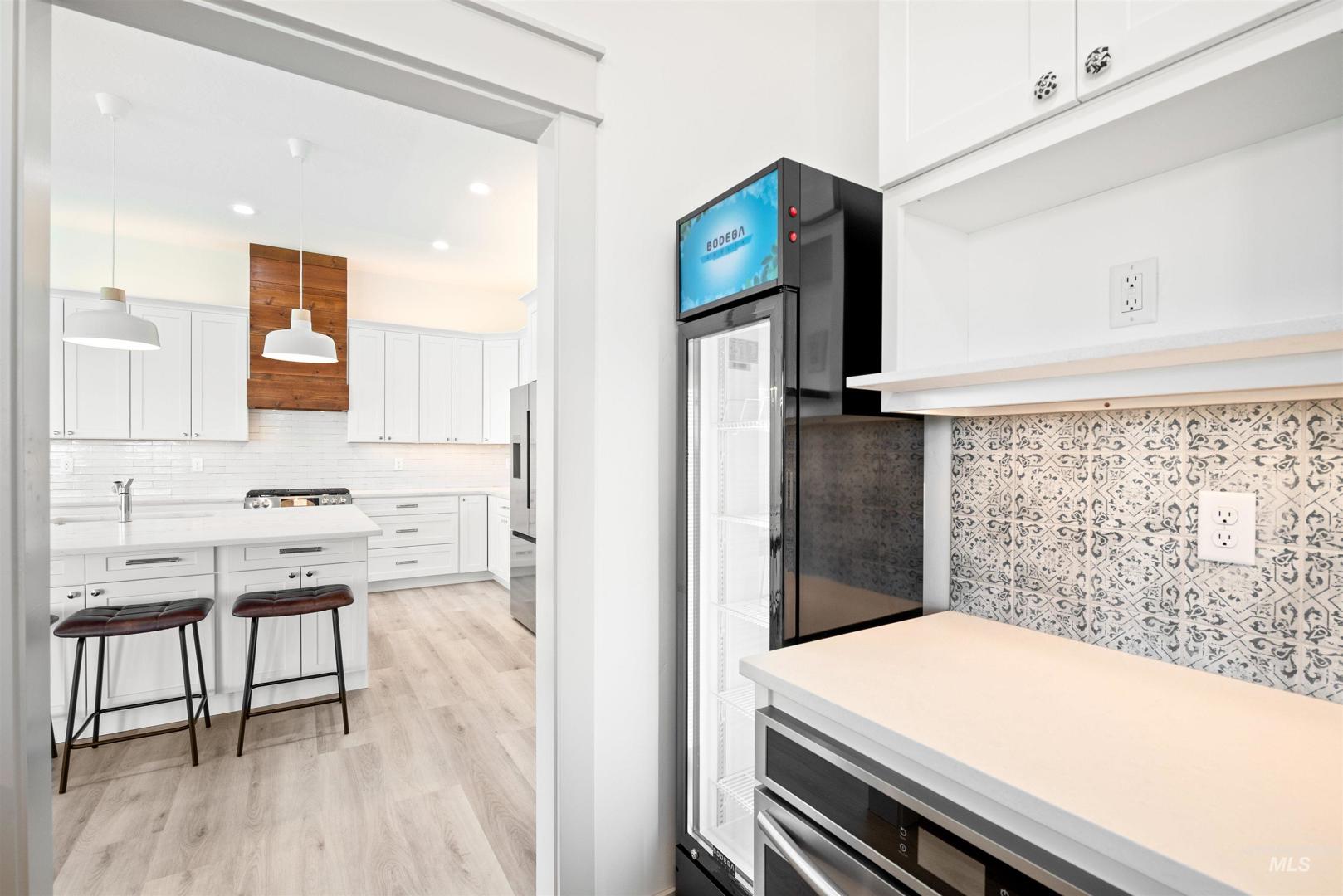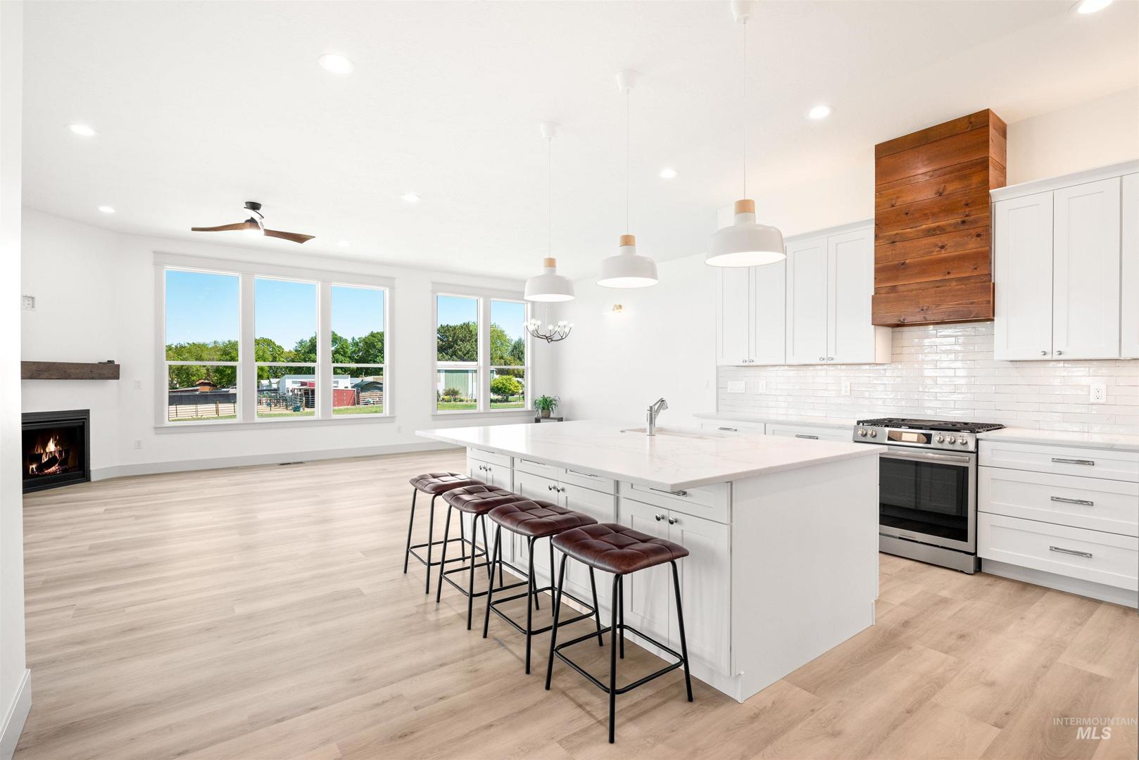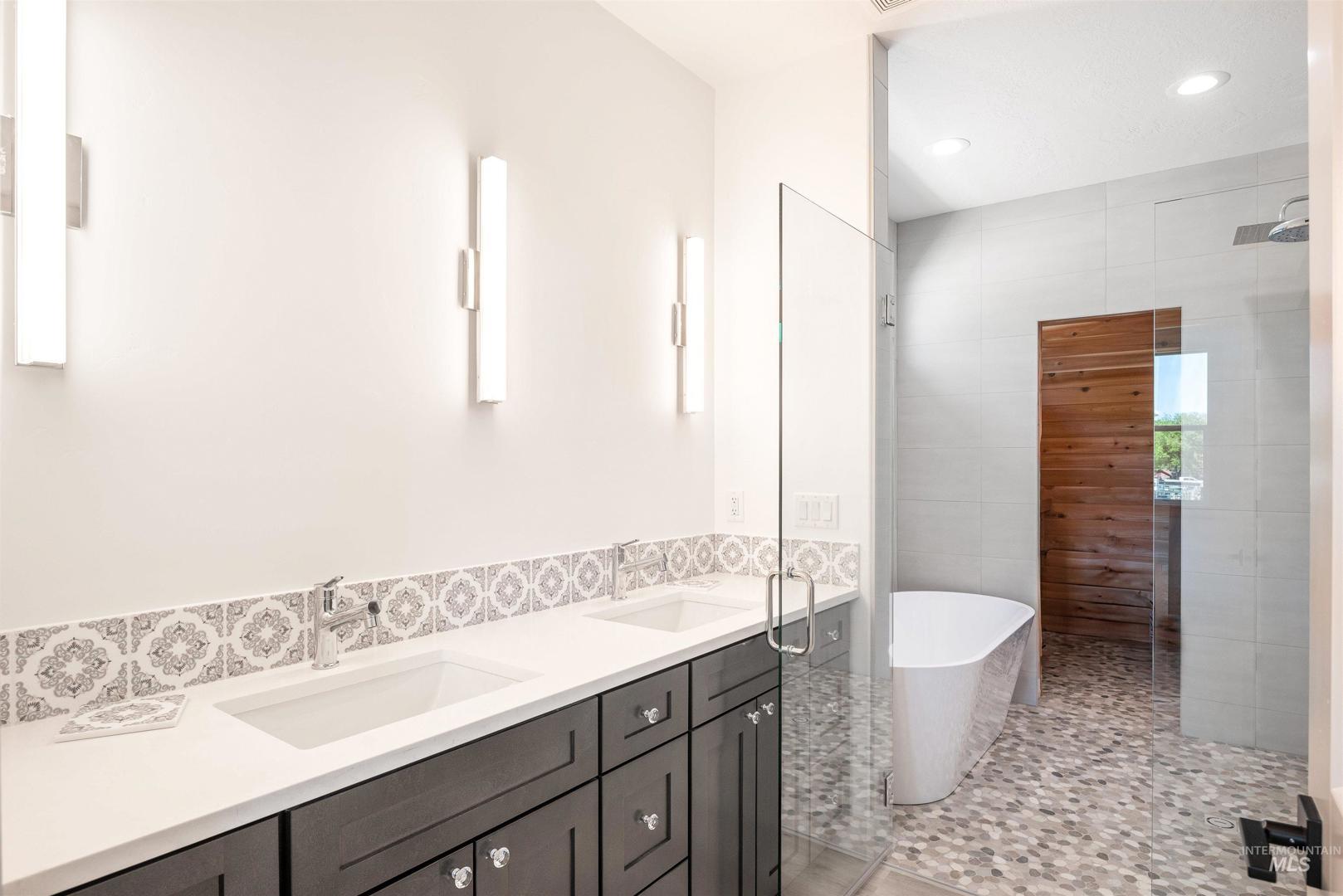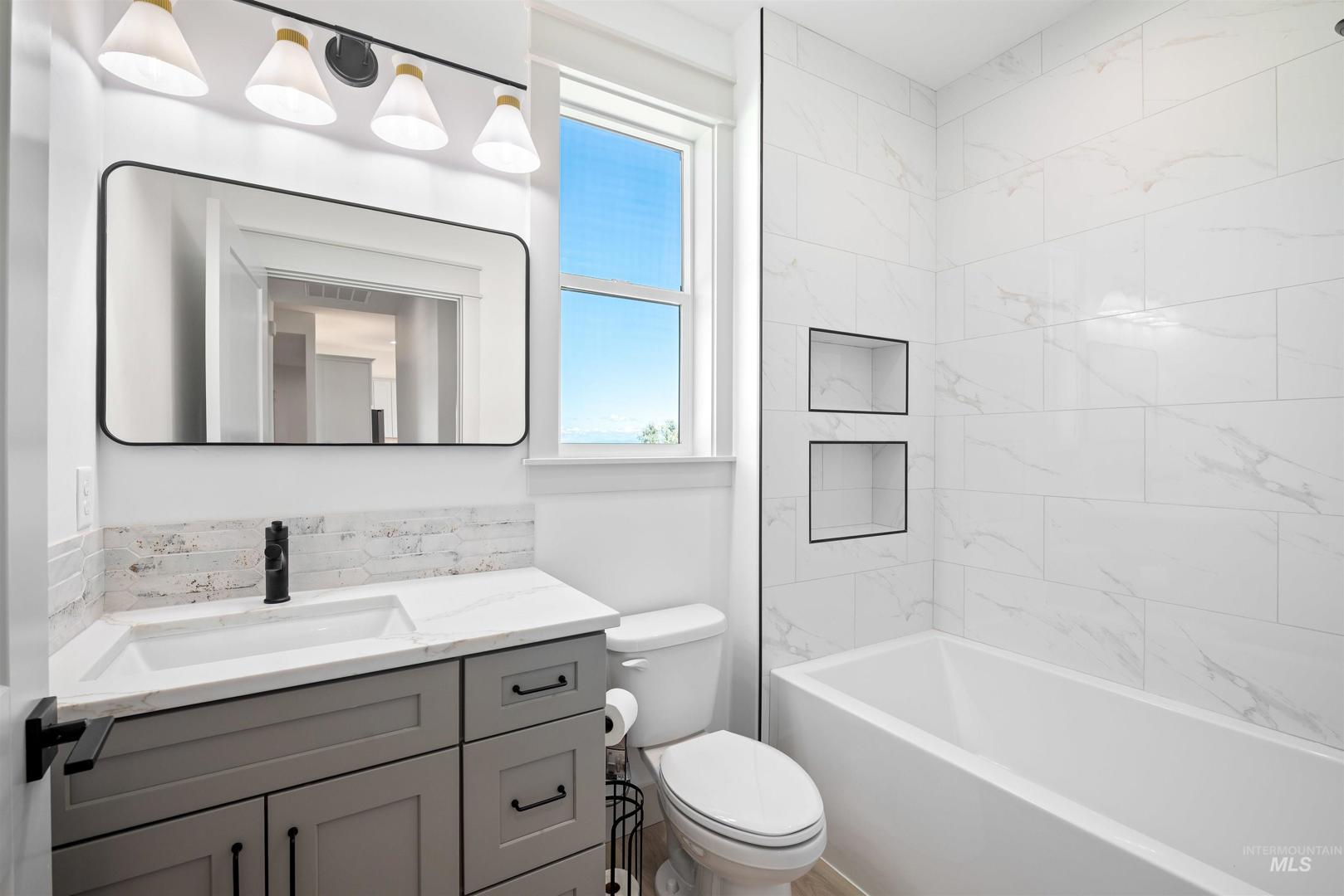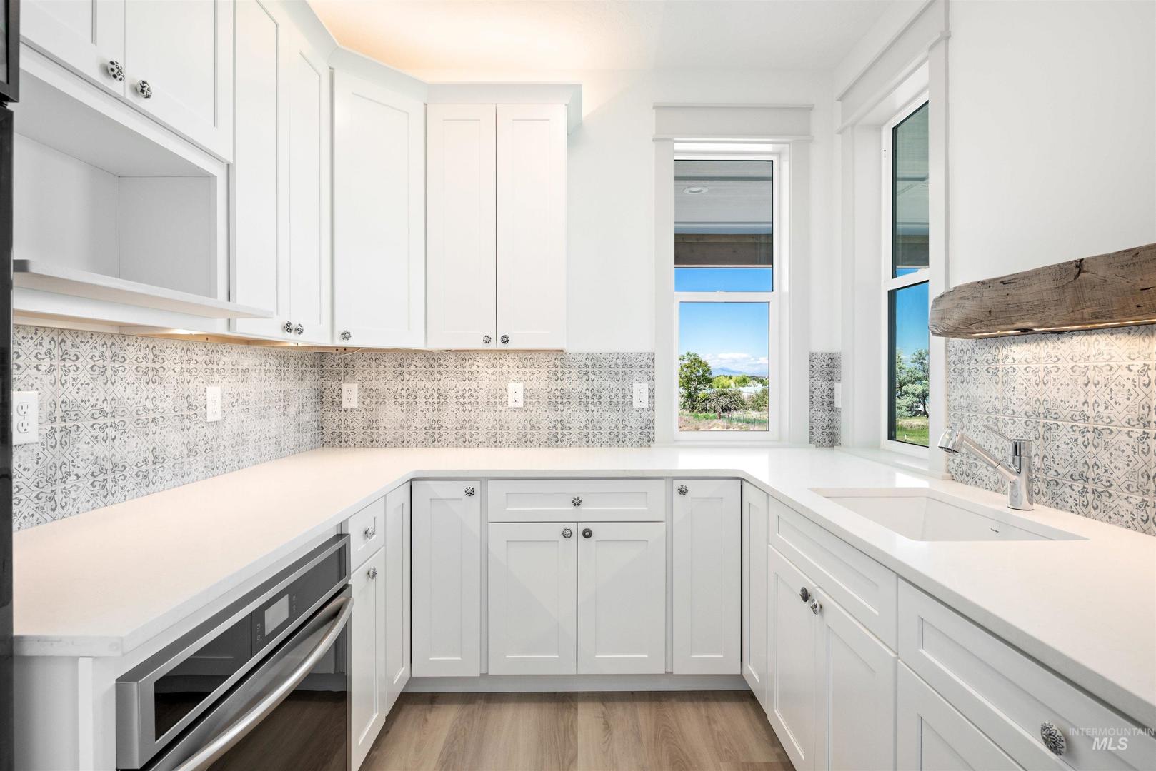 Builder offering a $10,000 buyer credit at close! This is a one-of-a-kind beautifully designed custom home built by Hannu Homes. You`ll enjoy panoramic views of Squaw Butte Mountains & Bogus Basin from your east facing back covered porch. You can also enjoy the views from inside this open floorplan w/ oversized windows. Waterproof LVP flooring throughout main living, 10` ceilings, w/ 42"gas fireplace in great room. Kitchen designed with oversized island featuring cabinets on the back side as well for extra storage, SS Bosch Appliances, tile backsplash, gas cooktop w/custom hood vent, and quartz countertops. Gorgeous butler pantry includes oven, sink, mosaic tile, beverage cooler, quartz countertops, shelving, tons of storage and again views to enjoy! Large primary suite with a private, en-suite bathroom featuring a walk in shower w/ dual shower heads, large soaker tub, and sauna for all of your wellness needs. Step out of the sauna and into a heated bathroom for cleansing. Three bedrooms, three bathrooms, plus a flex room that can be used for an office, gym, or fourth bedroom. Fully insulated garage with epoxy finish flooring, extended third bay, sink. Oversized back patio features BBQ stub, outdoor sink/washing station, with no direct back or side neighbors. This home is full of designer lighting, custom shelving, and craftsman trim package. Close to shopping, restaurants and more!