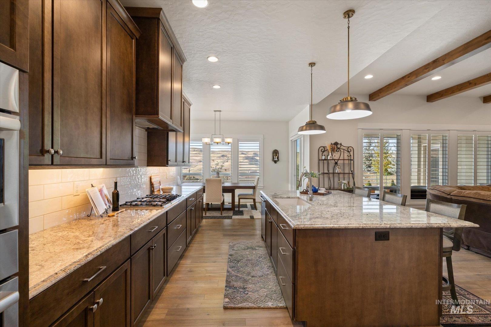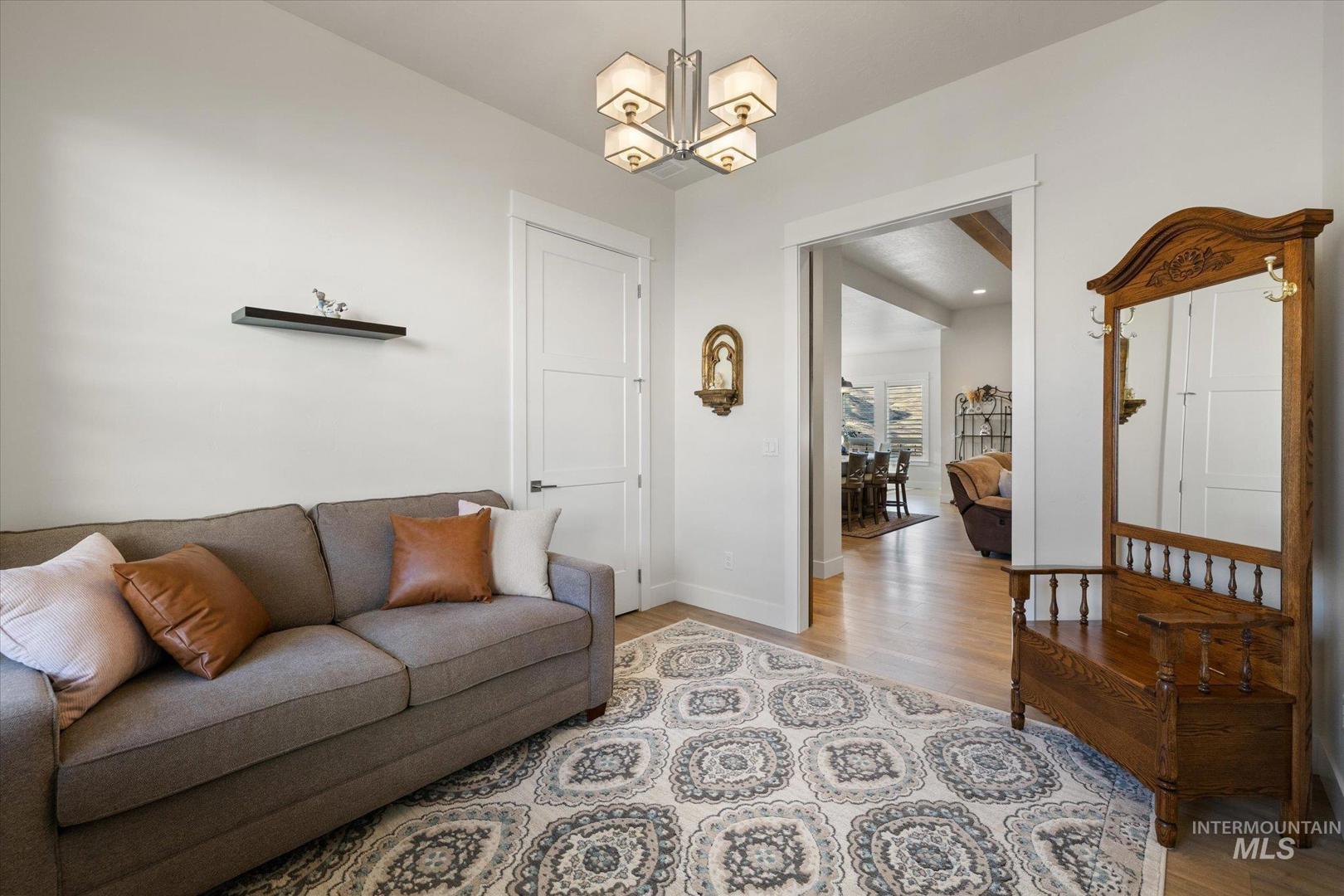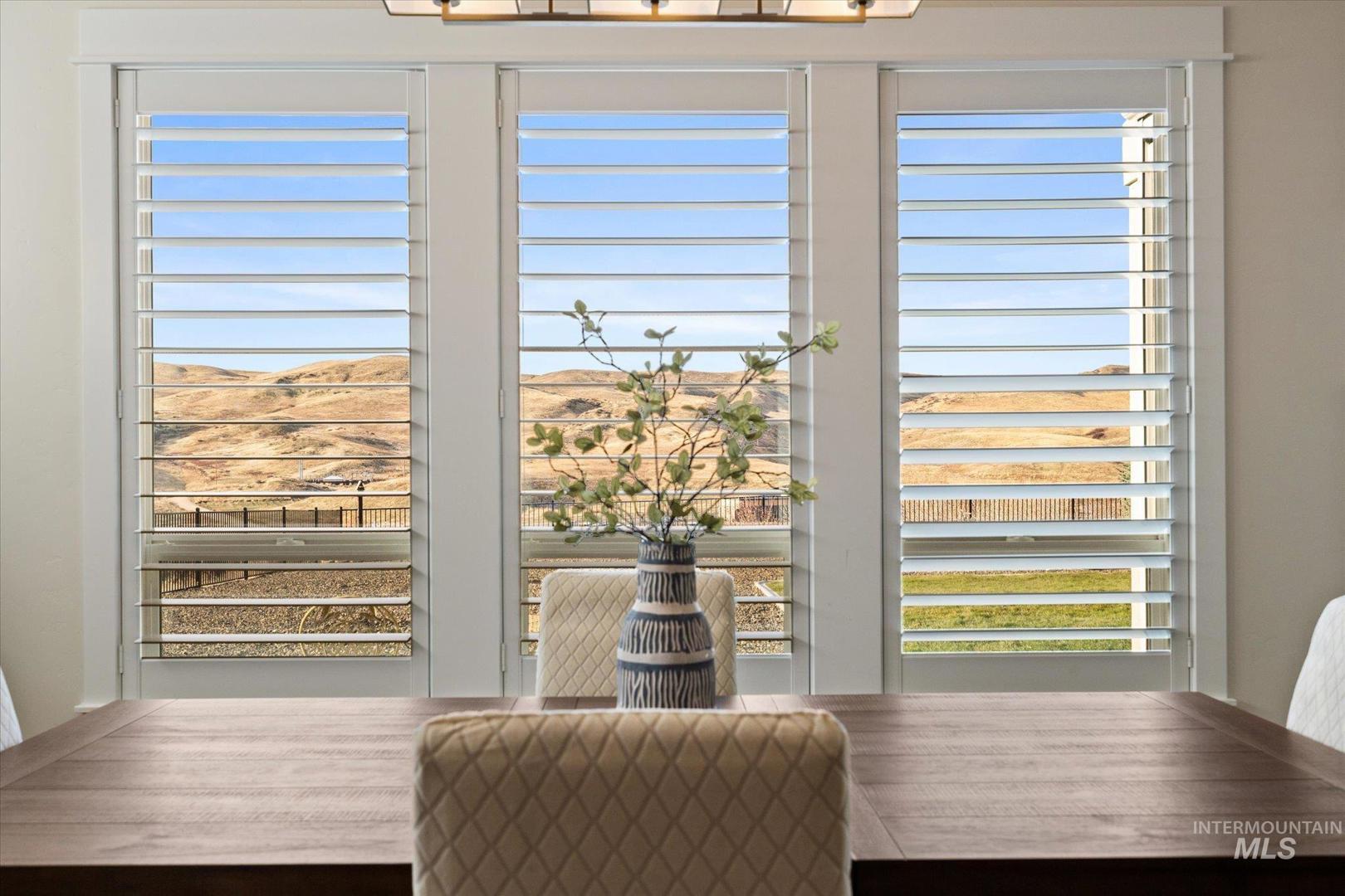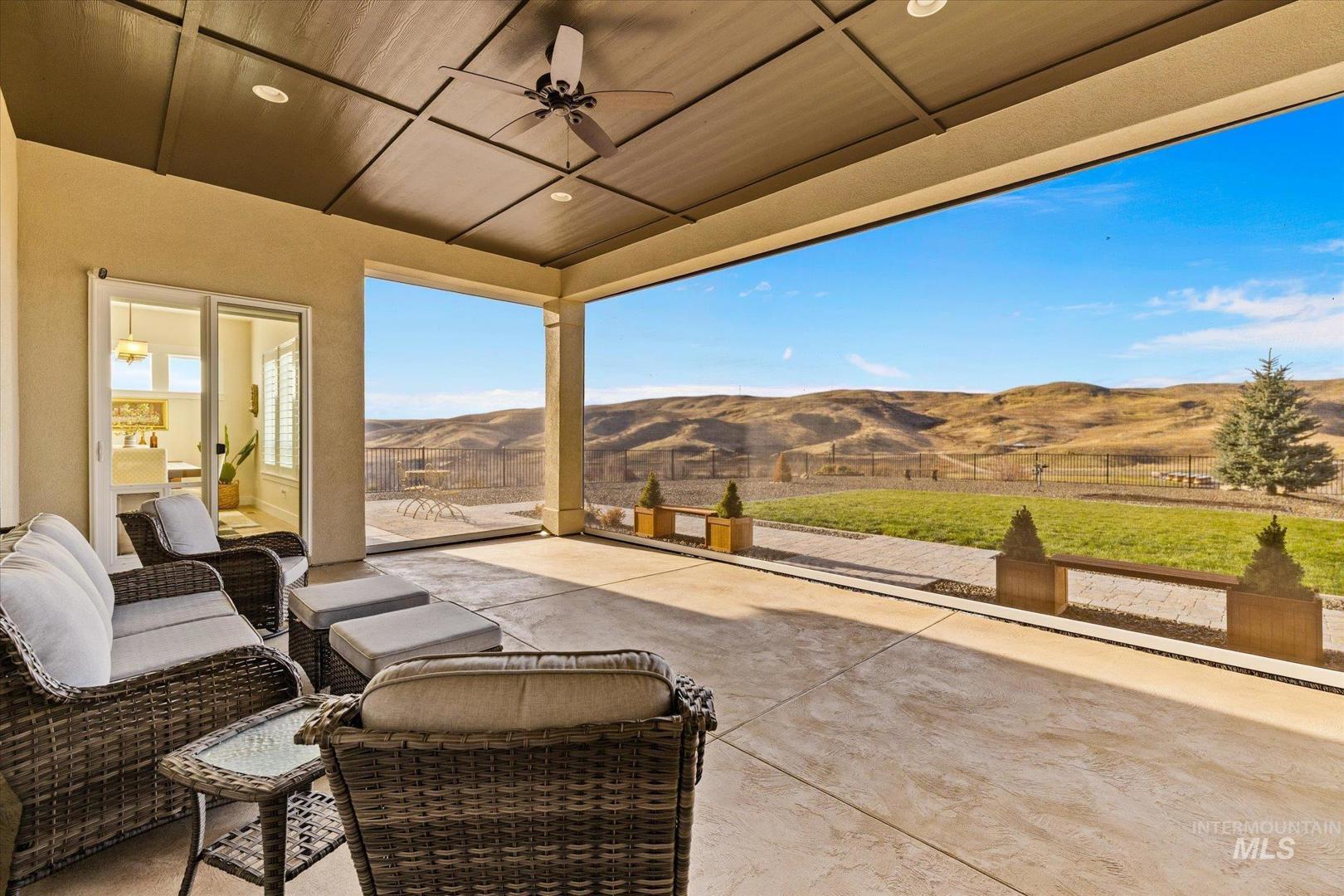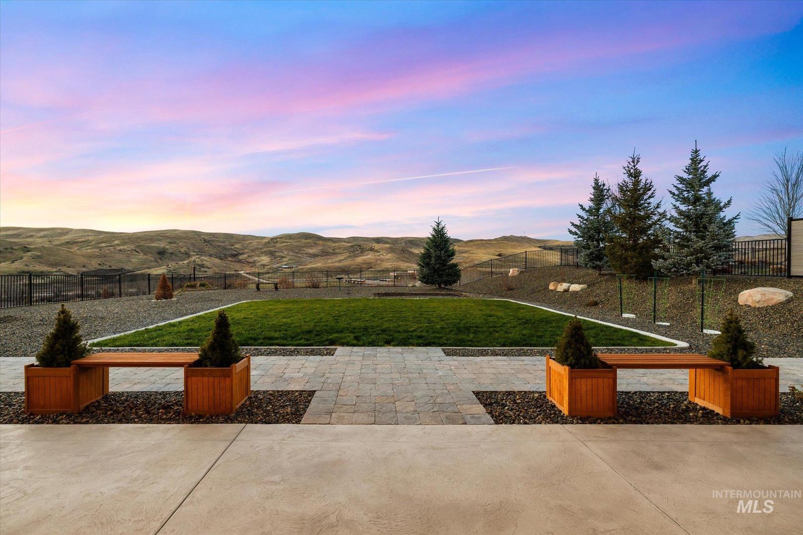 Built by Boise`s award winning, custom-only builder, Tradewinds, this single level home sits on .47 of an acre, with 360 views is the needle in the haystack you have been waiting for. A private separate suite with a dedicated door provides the perfect space for a guest quarters, hobby area, or quiet family room offering exceptional flexibility for multigenerational living or remote work. An inviting great room exudes timeless elegance with a brick fireplace accented with an Alderwood mantel, exposed beams spanning the space, & a designer solid core front door. The craftsmanship continues throughout, from the gourmet kitchen with upgraded granite counters, under-cabinet lighting, stainless appliances, & oversized pantry. Bathrooms feature full-height tiled showers, & a spacious primary suite includes direct patio access. Outdoor living shines with an extended back patio, state-of-the-art automatic porch screens that filter only the sun, not the view. The stamped front patio, walkway, rear porch accent the wrought iron fenced yard, & a full stucco exterior enhance both durability & curb appeal. Every detail of this home reflects thoughtful upgrades including a whole house surge protector, inlet for generator, water purifier & softener, garage epoxy, lighting & shelving. Enjoy endless trails for uncrowded E-biking & hiking, 2 community pools & center with pickleball & tennis courts.