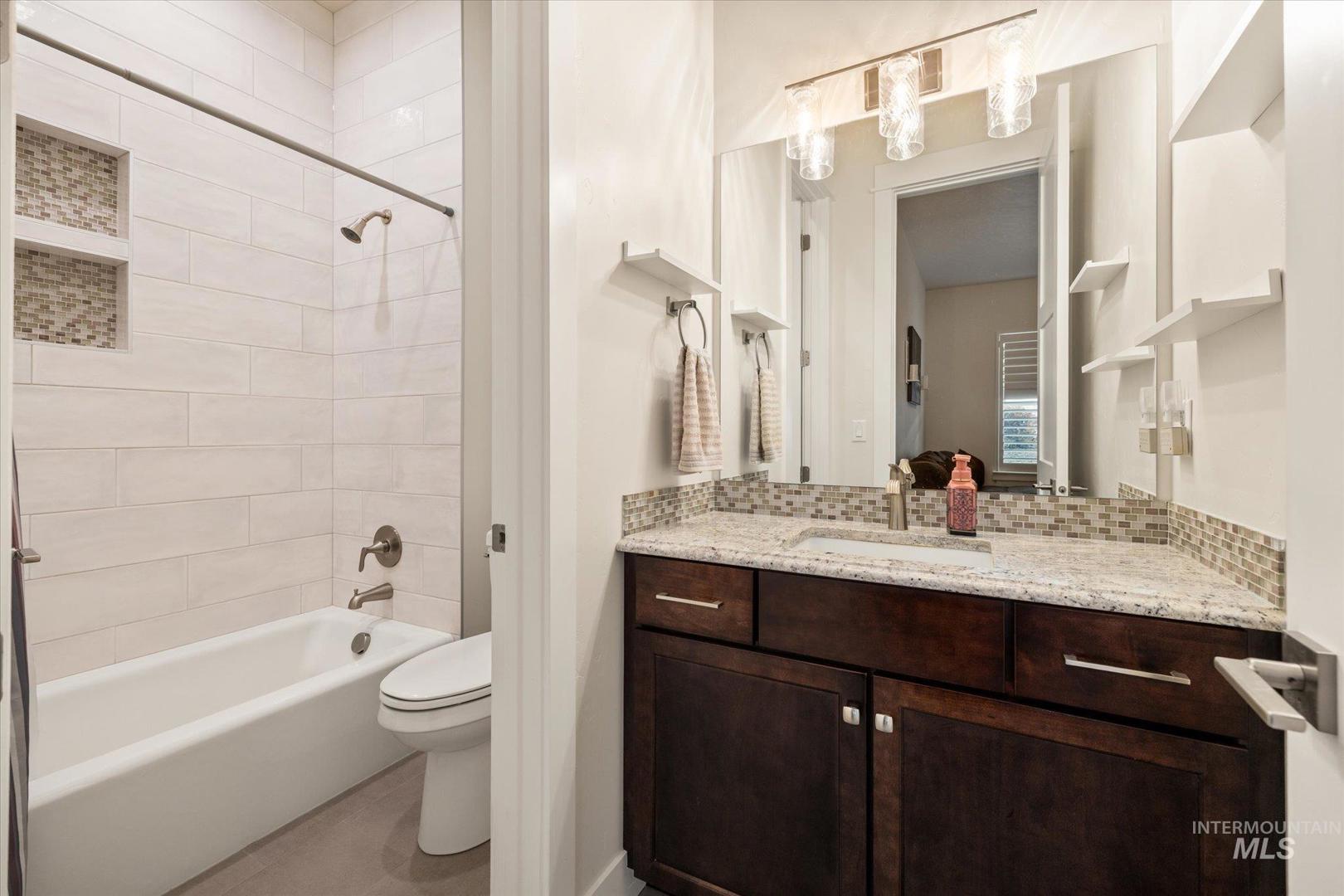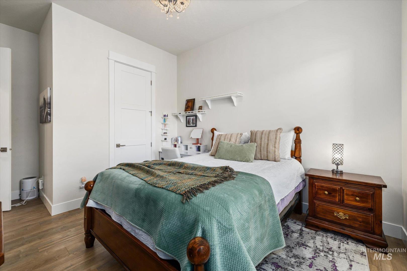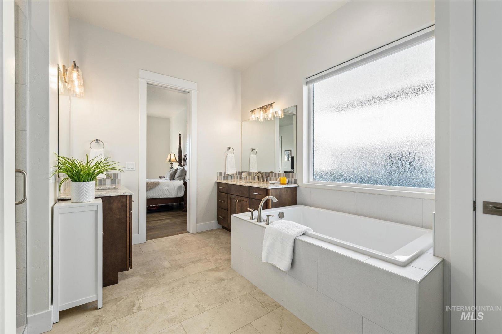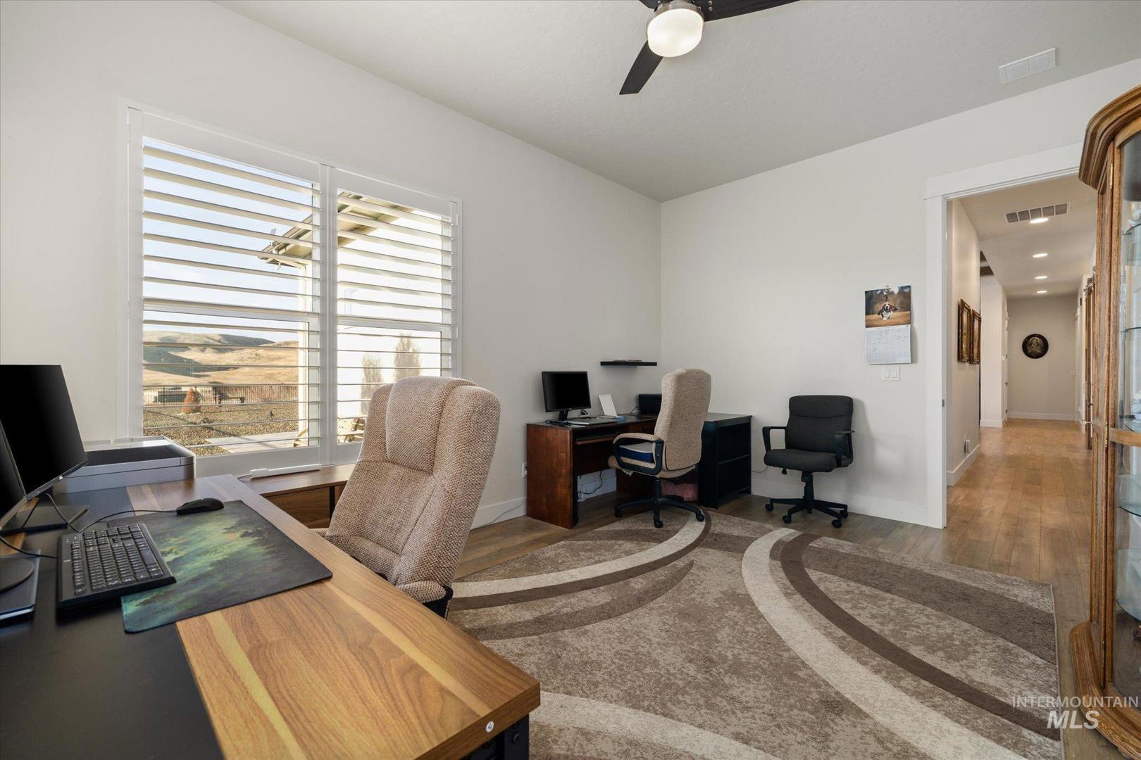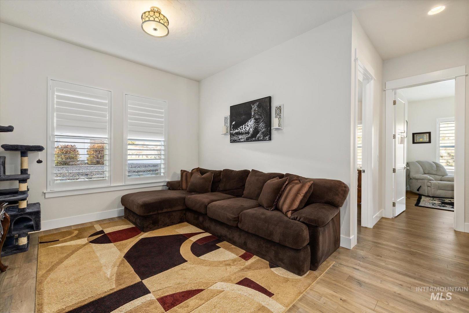 Built by Boise`s award winning, custom-only builder, Tradewinds, this single level home sits on .47 of an acre, with 360 views is the needle in the haystack you have been waiting for. A private separate suite with a dedicated door provides the perfect space for a guest quarters, hobby area, or quiet family room offering exceptional flexibility for multigenerational living or remote work. An inviting great room exudes timeless elegance with a brick fireplace accented with an Alderwood mantel, exposed beams spanning the space, & a designer solid core front door. The craftsmanship continues throughout, from the gourmet kitchen with upgraded granite counters, under-cabinet lighting, stainless appliances, & oversized pantry. Bathrooms feature full-height tiled showers, & a spacious primary suite includes direct patio access. Outdoor living shines with an extended back patio, state-of-the-art automatic porch screens that filter only the sun, not the view. The stamped front patio, walkway, rear porch accent the wrought iron fenced yard, & a full stucco exterior enhance both durability & curb appeal. Every detail of this home reflects thoughtful upgrades including a whole house surge protector, inlet for generator, water purifier & softener, garage epoxy, lighting & shelving. Enjoy endless trails for uncrowded E-biking & hiking, 2 community pools & center with pickleball & tennis courts.