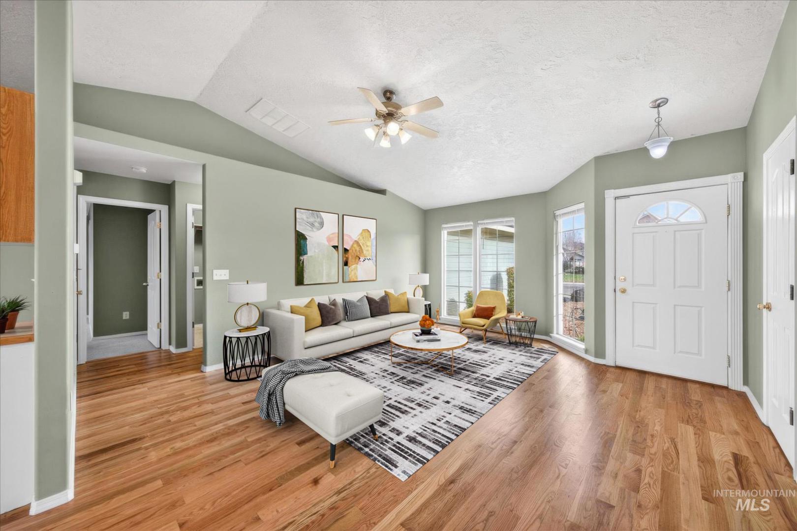 Well maintained single level home that features a 3 bedroom split floor plan for privacy, 2 baths and a separate family room and great room. Vaulted ceilings. Lots of upgrades, new carpeting, paint, hardwood floors refinished. New HVAC spring 2025 Mature landscaping. Irrigation water included with the HOA dues. Located just minutes from the Optimist complex, shopping, and the ridge to rivers trail system. Move in ready...just waiting for you!!