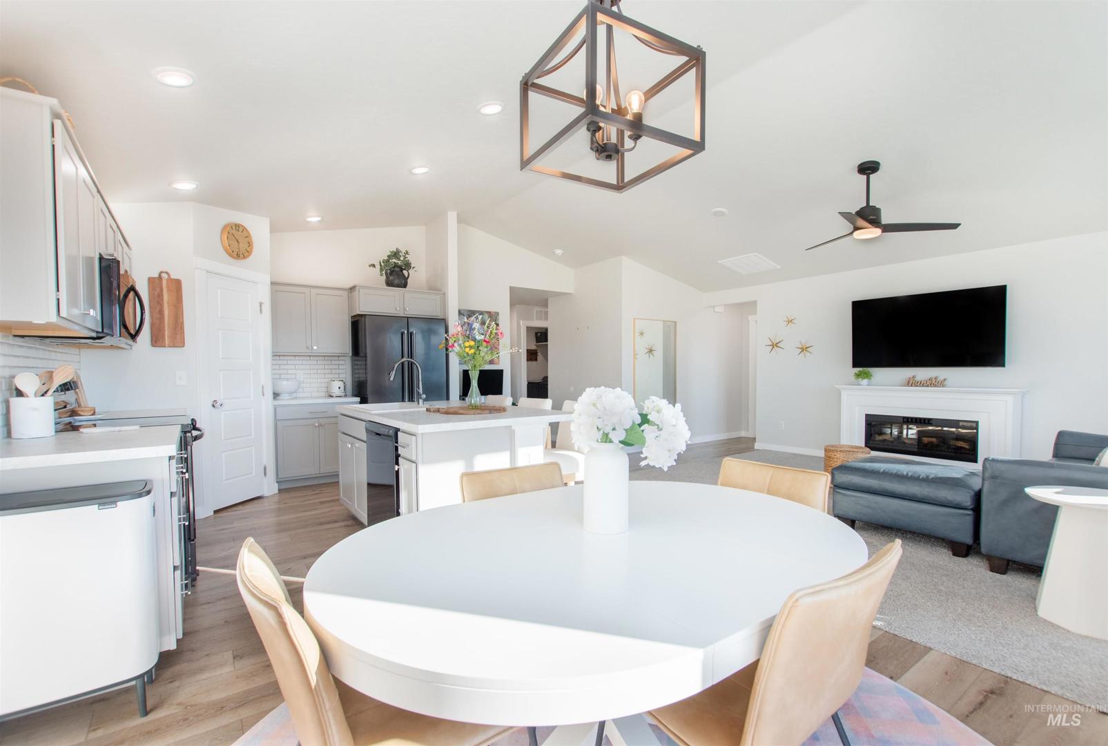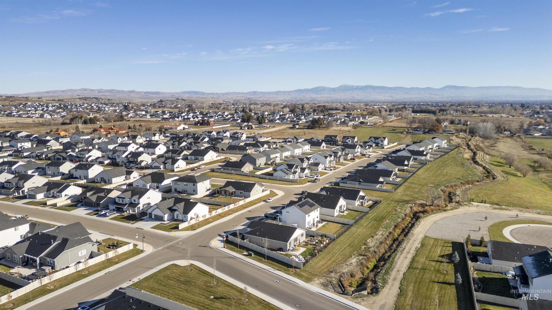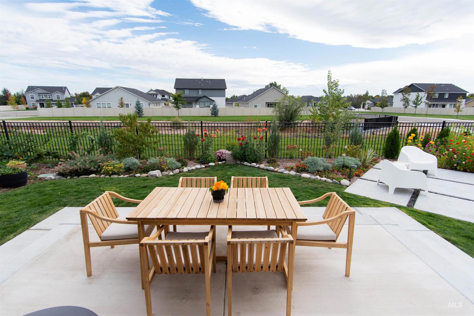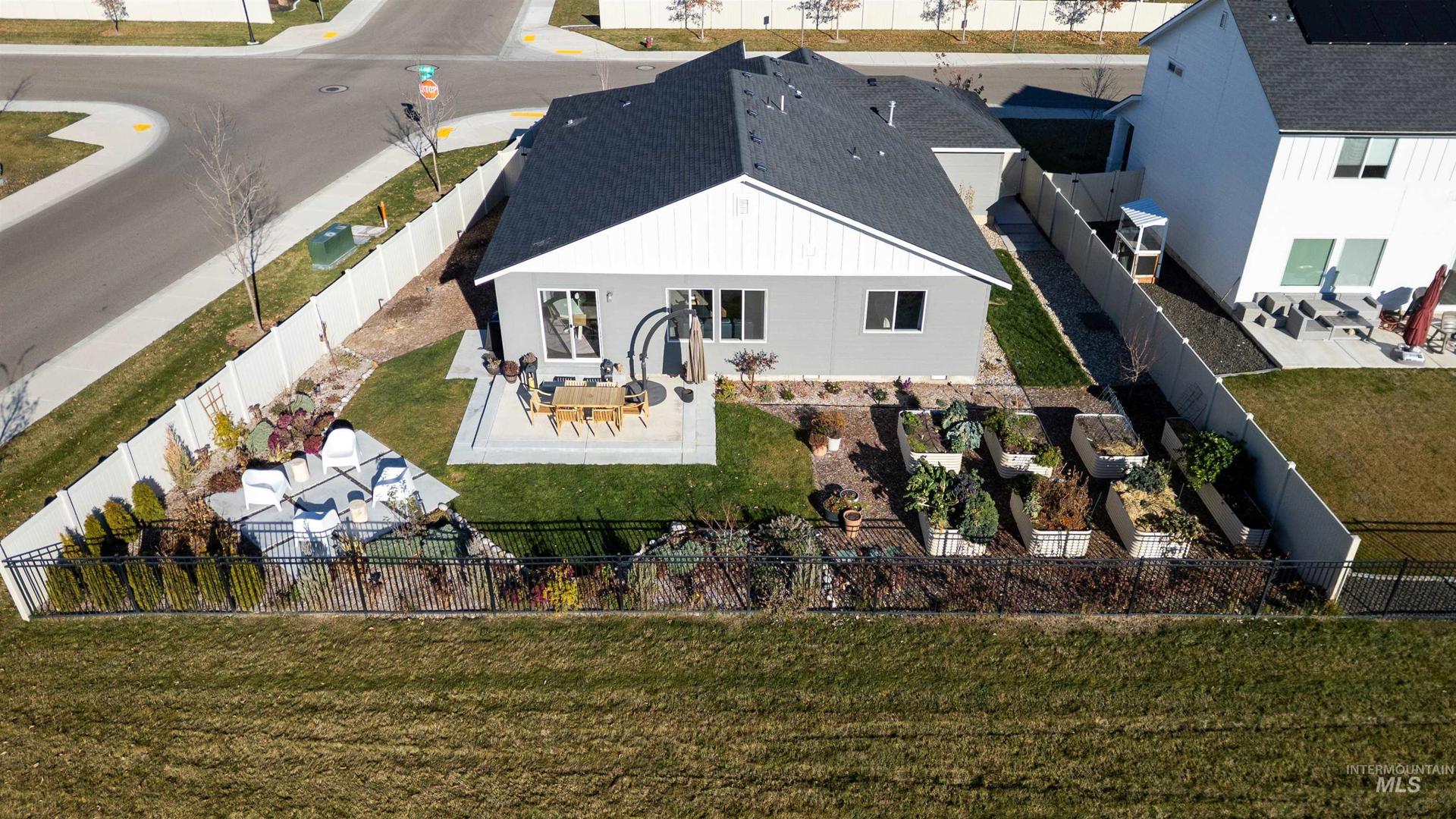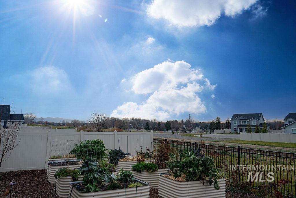 RARE FIND!! Set on a premium corner lot with no rear neighbors, this only 2 year old, single-level home is already fully fenced, fully landscaped, and extensively upgraded. The south-facing backyard is a standout feature! The professionally designed outdoor space includes seven large raised metal garden beds, with drip irrigation and organic soil, and producing fruit trees along with blackberries and raspberries. A custom fire-pit patio creates the perfect backdrop for relaxing Idaho evenings and sunset views! The home sits with a common area behind and a pasture to the southeast creating an open, expansive feeling, with unobstructed foothill views and frequent sightings of cows in pasture! Inside, the home’s open concept design and spacious kitchen island is perfect for both relaxation and entertaining, with large windows filling the space with natural light. The primary suite is set apart from the additional bedrooms, creating a true retreat, and the fourth flex room provides an ideal space for work, hobbies, play, or quiet relaxation. Just minutes to the Boise River, Freedom Park, schools, shopping and restaurants. Don`t miss your chance to make this move in ready property yours!