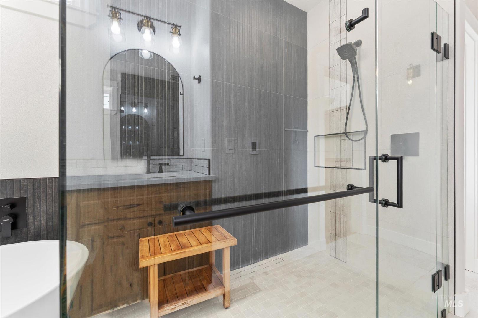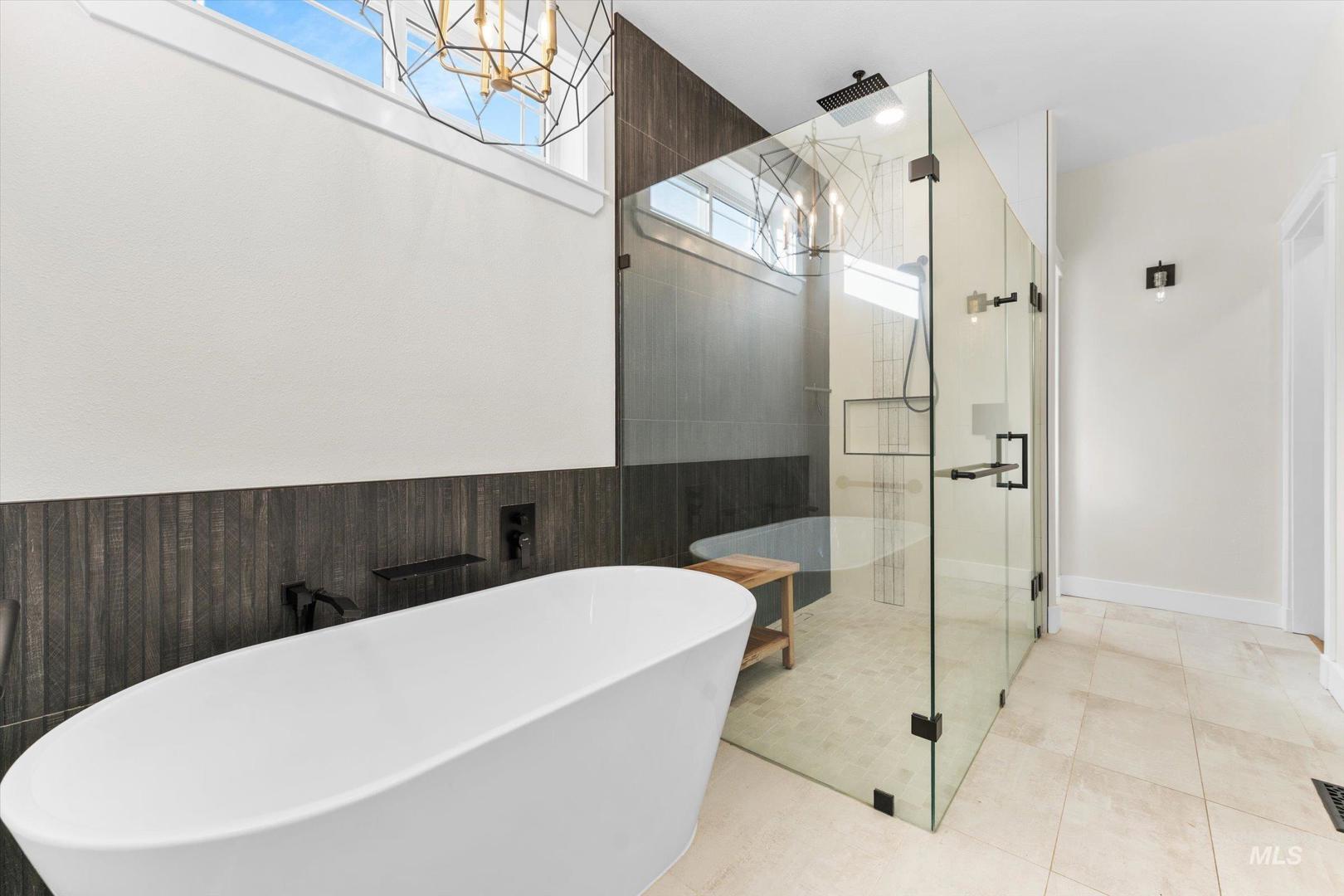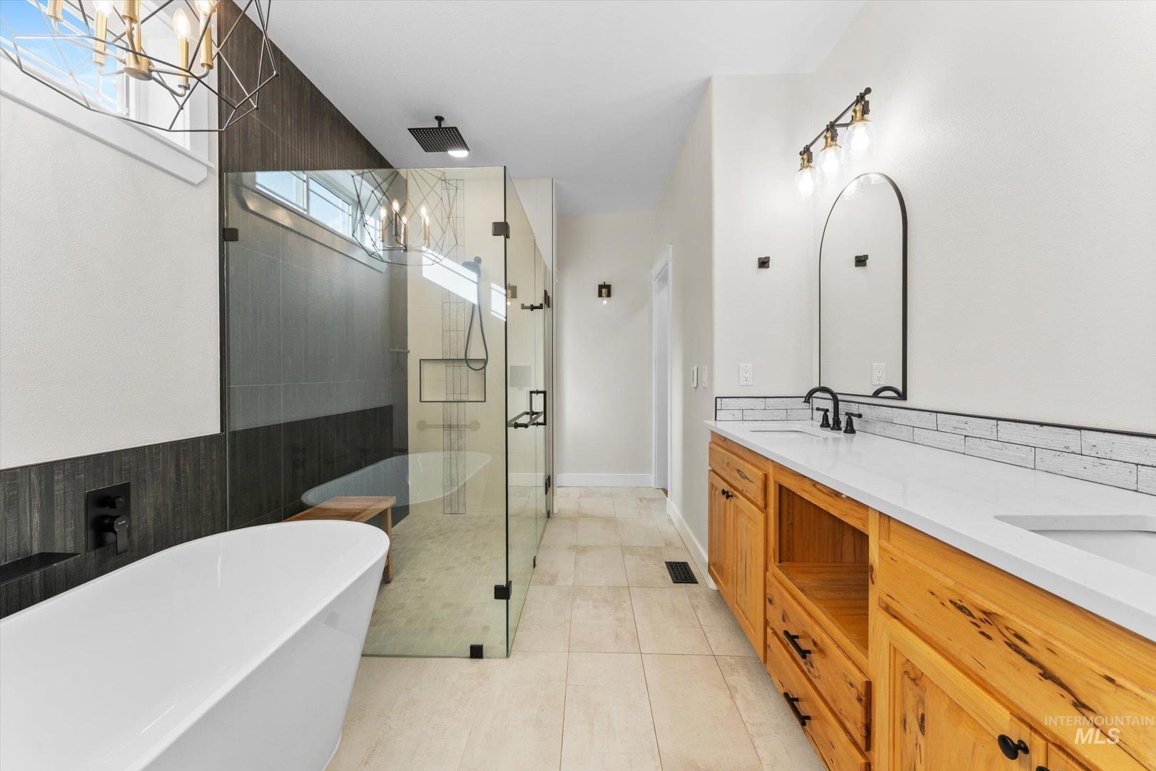 Located just minutes from The Village and conveniently off Eagle Road, this 2701 sq ft turn-key home offers an open floor plan with vaulted ceilings and expansive windows that fill the space with natural light. Granite kitchen counter tops, free standing oven/stove. Property includes a central vac, equip & plumbed. The main-level primary suite features a spacious layout, custom bathroom with a soaker tub, separate shower, dual vanities, heated floors, and a walk-in closet. Upstairs, a second master suite occupies the entire level, complete with its own large bathroom and walk-in closet. The beautifully landscaped yard with irrigation that feels like a private retreat, showcasing a tranquil stone water feature, covered seating area, built-in BBQ, raised garden beds, and two storage sheds. This home has a circular driveway and an oversized 4-car garage, including a high-amp setup in the extended 2-car bay, and 220 volt shop. Location is 5 minutes from freeway, 6.9 miles from airport, 1.6 miles from St Lukes.