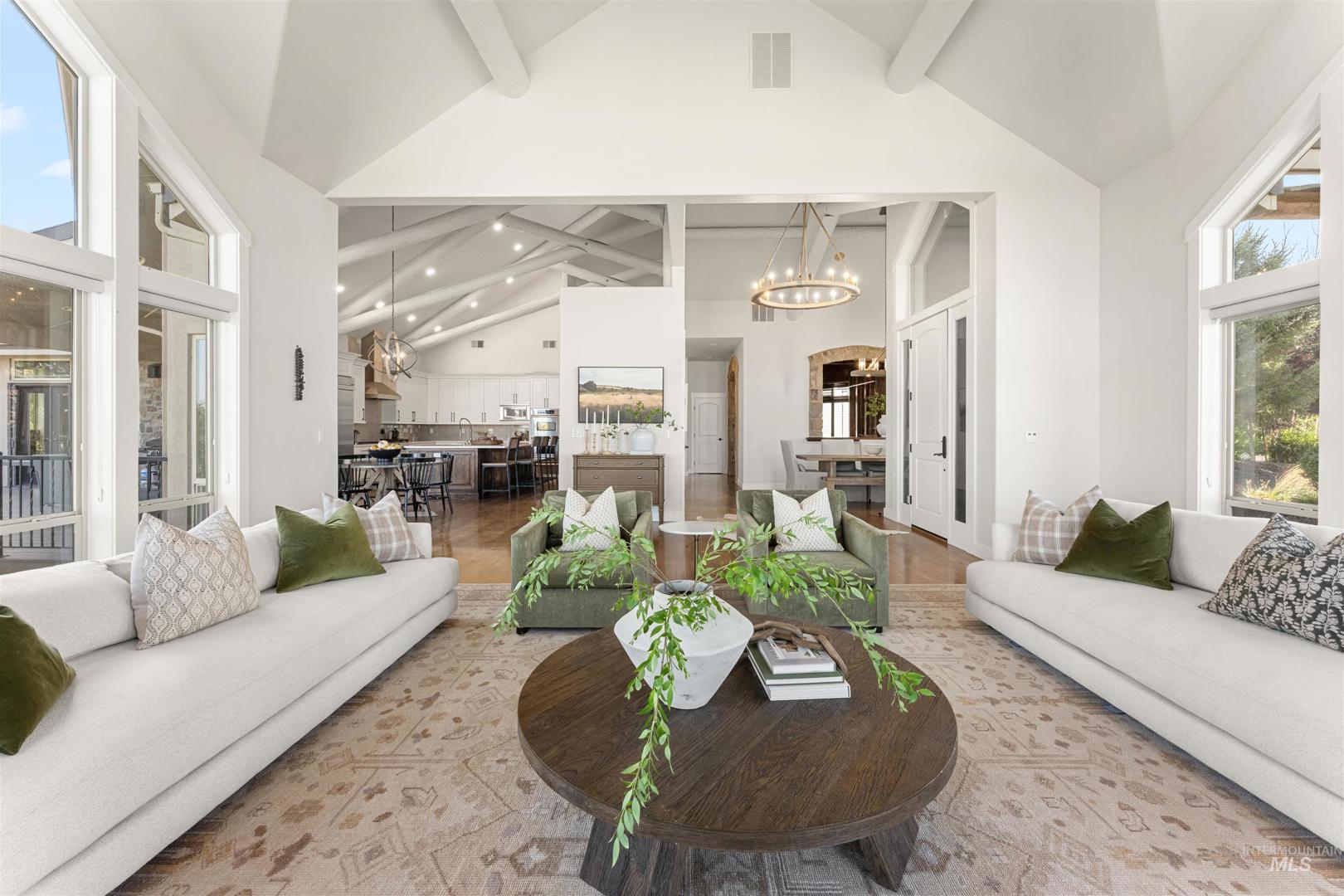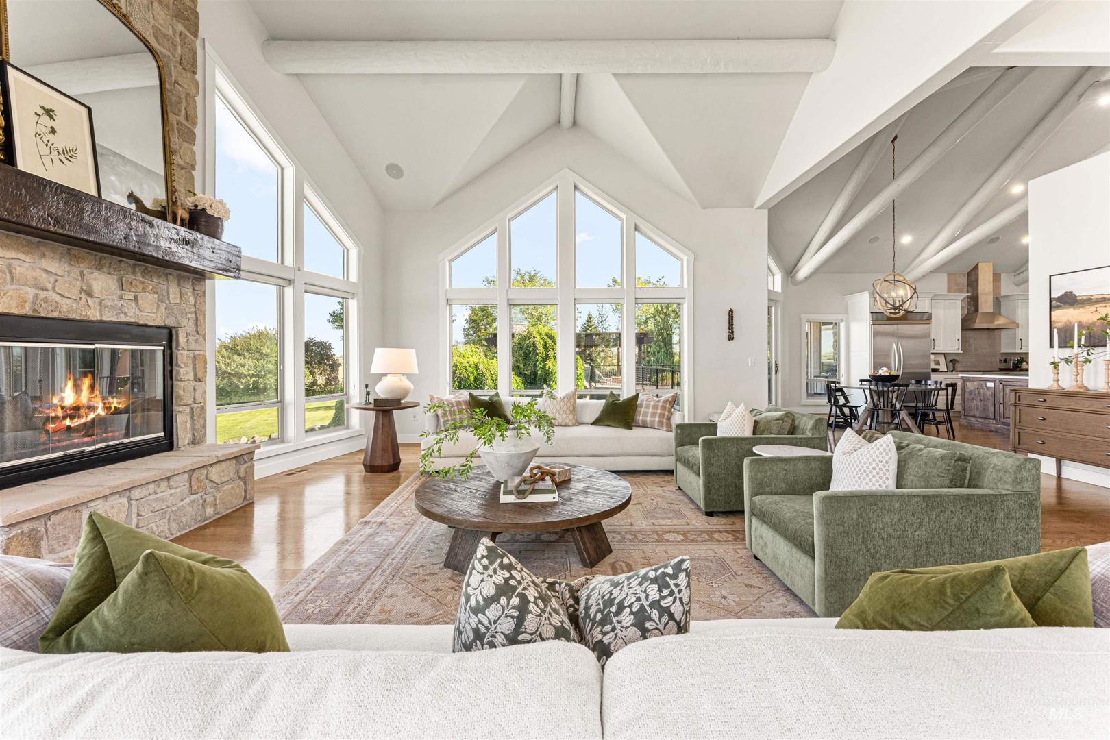 A rare 10-acre estate offering unparalleled privacy, versatility, and sweeping 360° valley views. This custom-built ranch-style executive home blends timeless design with a modern refresh. Floor-to-ceiling windows soaring up to 18 feet frame breathtaking scenery, while a dramatic rock surround wood-burning fireplace anchors the main living space. Designed for entertaining, the home includes a refined wine & whiskey lounge complete with a full-size wine refrigerator and bar. The primary suite is a serene retreat with stunning views, its own fireplace, and private deck access. The nearly 3,000-sq-ft walkout basement offers exceptional flexibility with recreation space, a full kitchen, home office, and gym—ideal for multi-generational living or hosting extended guests. Outdoor living is taken to the next level with a dedicated kitchen and bathroom, overlooking the solar-heated saltwater pool featuring a water slide, jumping rock, and diving board. Enjoy resort-style amenities including a basketball half court, sand pit, fire pit, and expansive lawn space. The renovated barn adds incredible value with a full kitchen, bathroom, and loft—perfect as a guest house or easily convertible back to a true barn for horses. With ample room for a future riding arena on the back five acres, this extraordinary property offers a rare blend of luxury living, recreation and equestrian potential!
