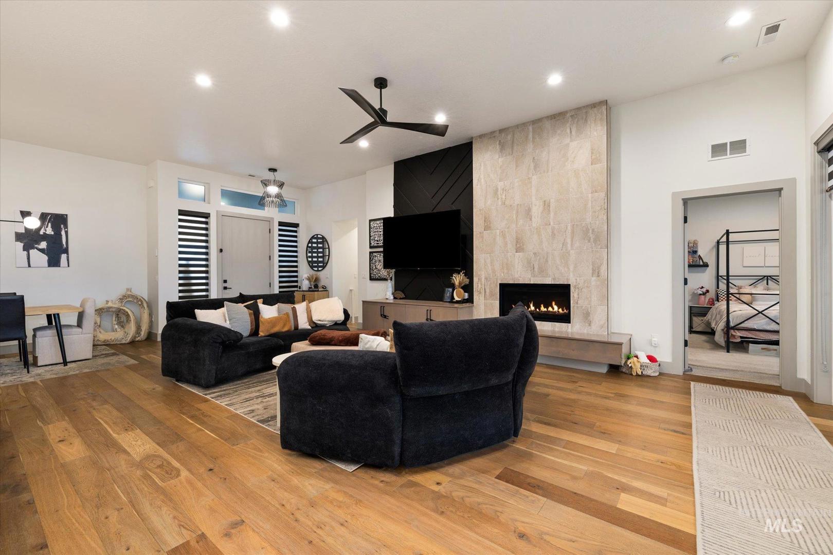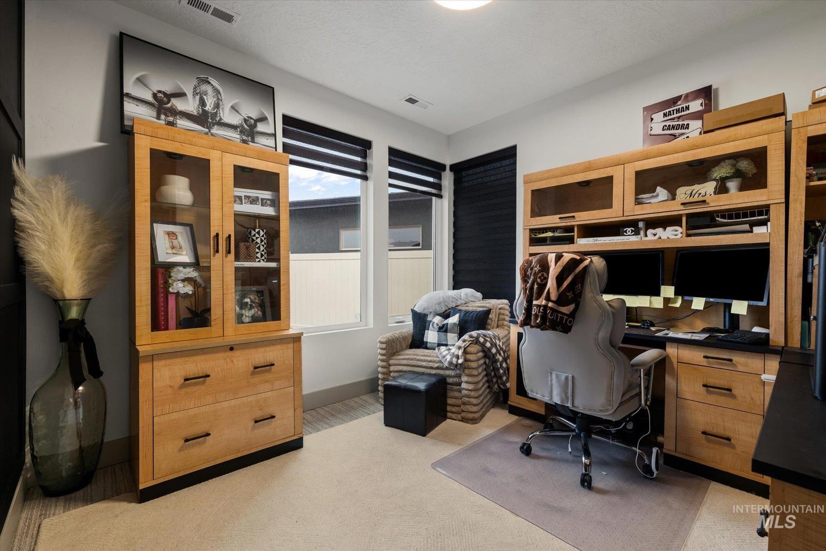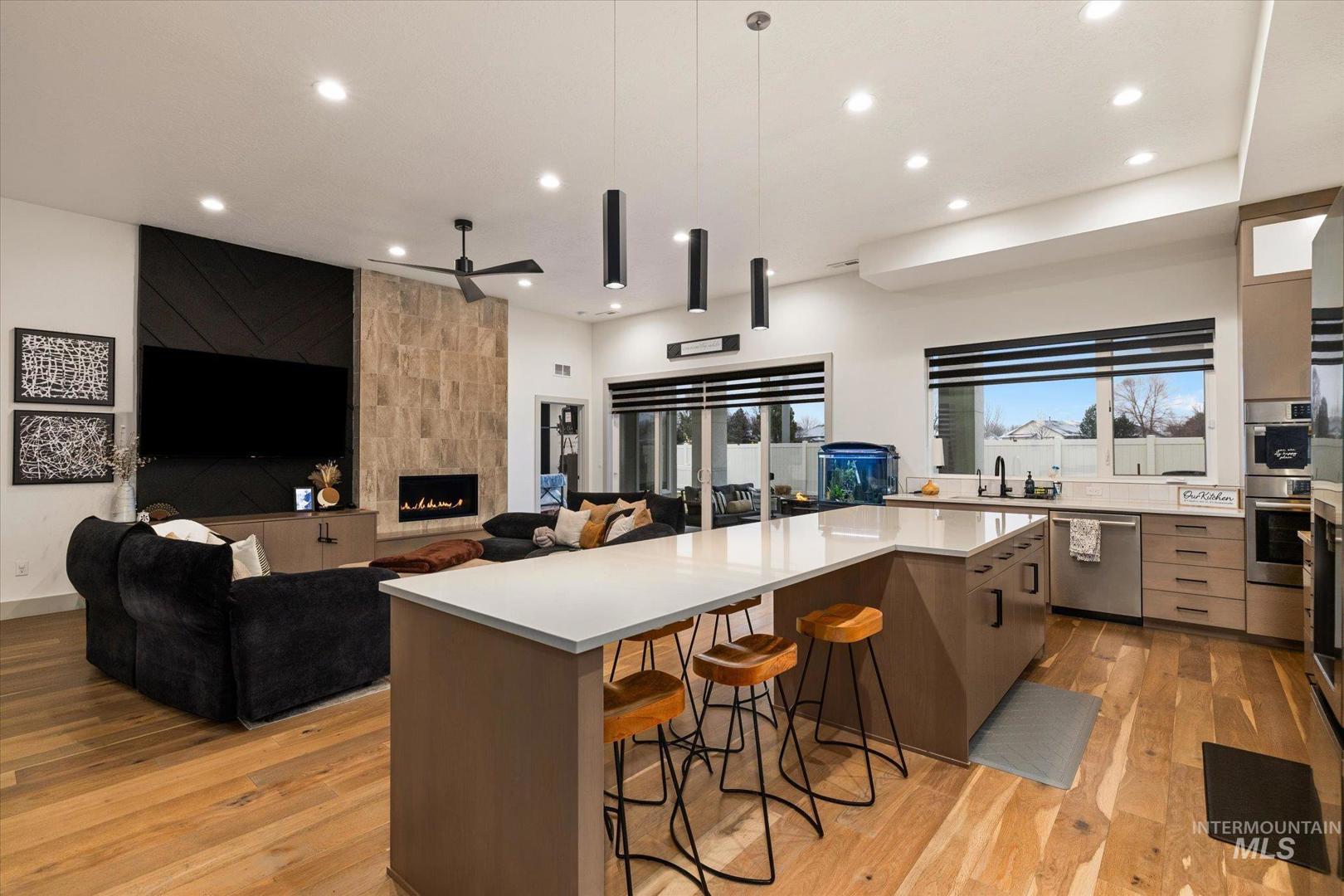SELLER WILL PAY CONCESSIONS, BETTER THAN NEW & LOADED WITH UPGRADES , this stunning ZACH EVANS-built home offers an open floor plan and split-living design offering 4 bedrooms, 3 full bathrooms, and a private guest suite ideal for multigenerational living. The spacious kitchen features a large island, built-in coffee bar with accent lighting, and flows seamlessly into the living area with a cozy fireplace—perfect for gatherings and everyday living. A bright pocket office with large windows and a functional mud room add everyday convenience and flexible space. The primary suite includes a glass barn door, under-cabinet floor lighting in the bathroom, and soft-close cabinetry throughout. Enjoy outdoor living with a fully fenced backyard, a large 24x13 patio, an additional seating area, built-in fire pit pad, and an inviting front patio ideal for relaxing. Updated landscaping with new trees and plants, concrete curbing front and back, and full sprinklers with drip irrigation complete the exterior. Additional features include wireless security, surround sound pre-wire in the living room, TV mount, reverse osmosis, water softener, insulated garage doors, and a deep 3-car garage with a split heating and cooling system, offering comfort and functionality year-round. Truly a must-see home.