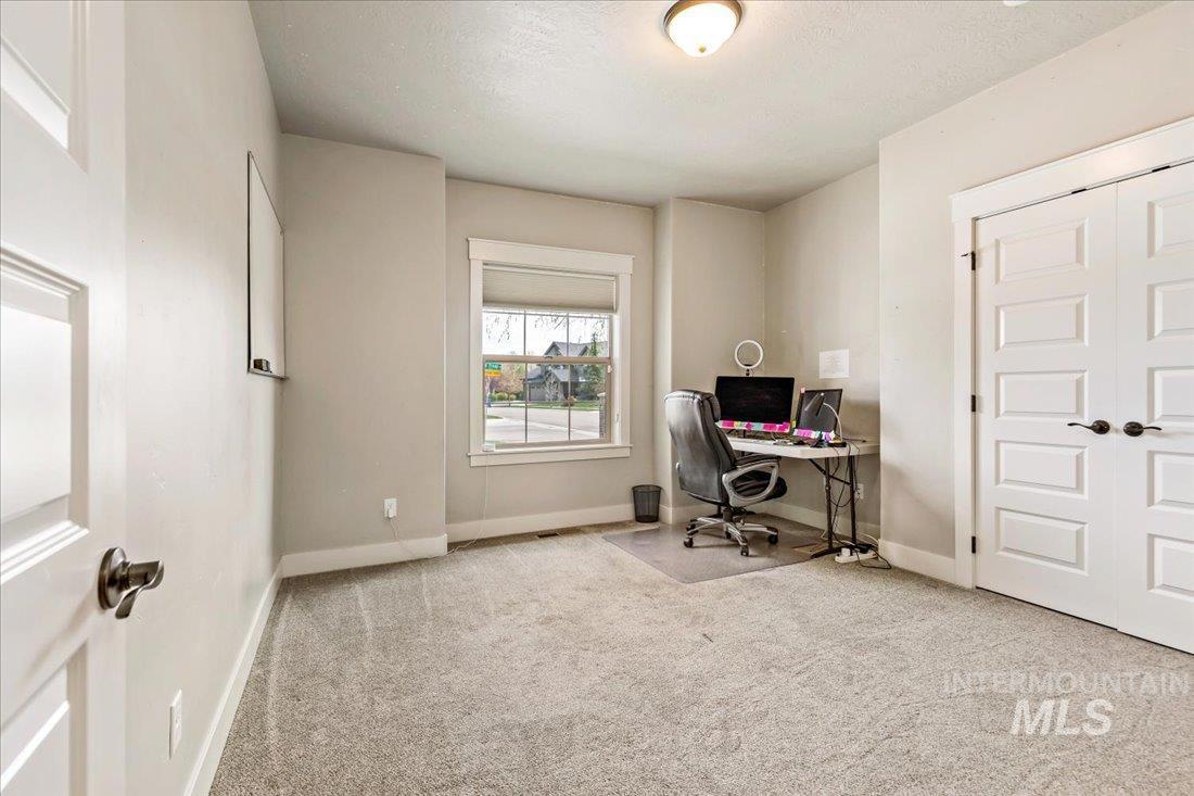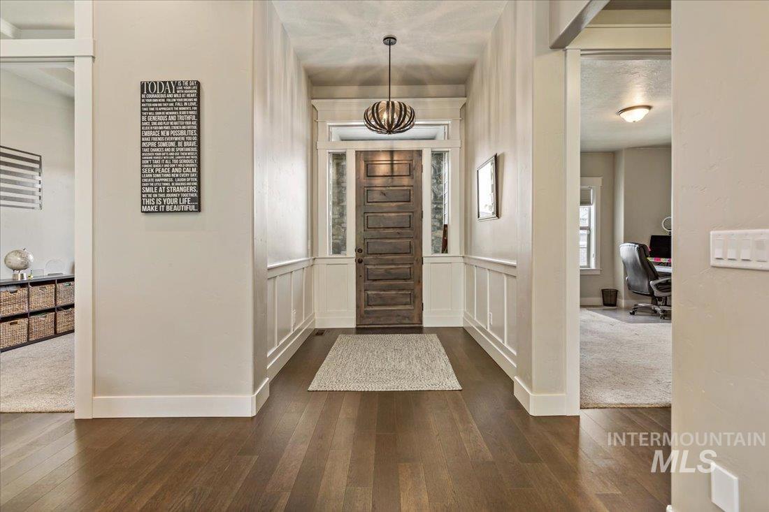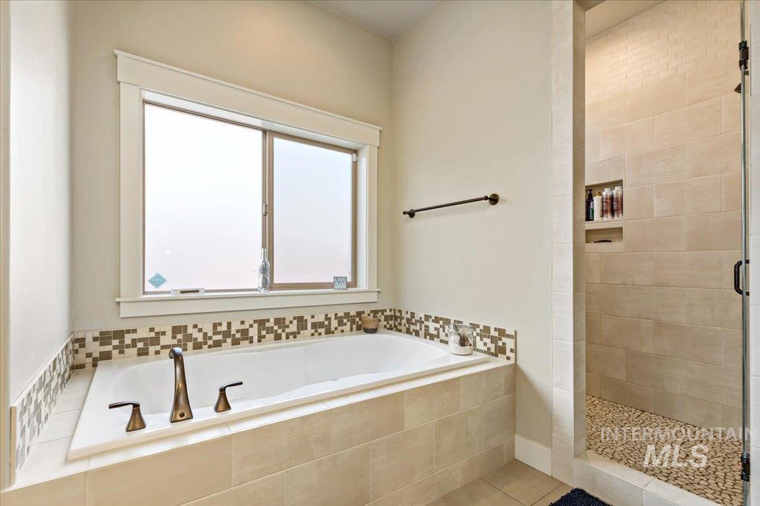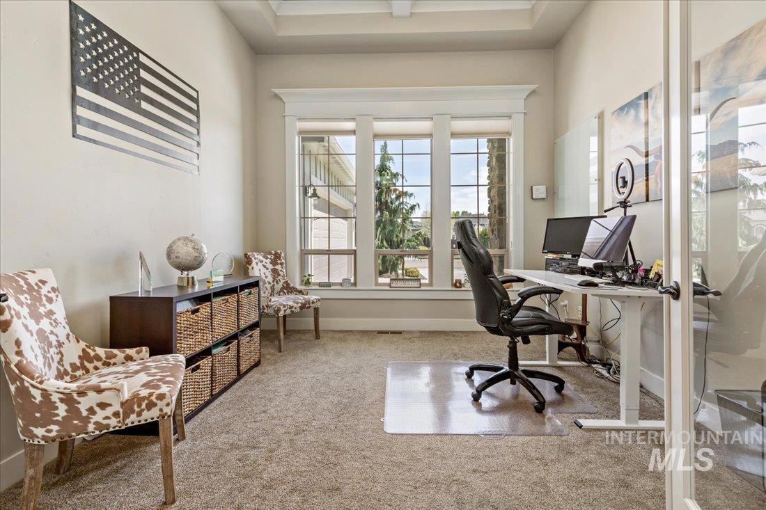 An exceptional opportunity in Eagle’s desirable Foxtail Lakes—thoughtfully designed residence offers elevated living at its finest. Showcasing custom box beams, rich wainscoting, soaring ceilings, & grand 8-foot doors, every element reflects intentional design & timeless sophistication. The gourmet kitchen is a statement of style & function, featuring a large walk in pantry, quartz surfaces with tiled backsplash, full-height cabinetry, & built-in Bosch appliances including double ovens & a gas cooktop. An expansive island anchors the space, flowing seamlessly into the great room with a striking corner fireplace—designed for both intimate evenings and upscale entertaining. The private primary retreat offers direct patio access and a spa-caliber ensuite with dual vanities, a two-person tiled shower, and a luxurious soaking tub. A custom wraparound closet connects effortlessly to the laundry room for ultimate convenience. Upstairs, a bonus suite w/full bath provides a tasteful option for guests or multigenerational living. Outdoors, enjoy an extended covered patio overlooking a private, easy to care for fenced backyard. Complete with an oversized 3-car garage and access to Foxtail Lakes’ clubhouse, pool, meandering walking paths, and tranquil lakes—this is a lifestyle, a place to savor the everyday! Close proximity to amenities/shopping/dining! Click on tour link for 3D walkthrough!