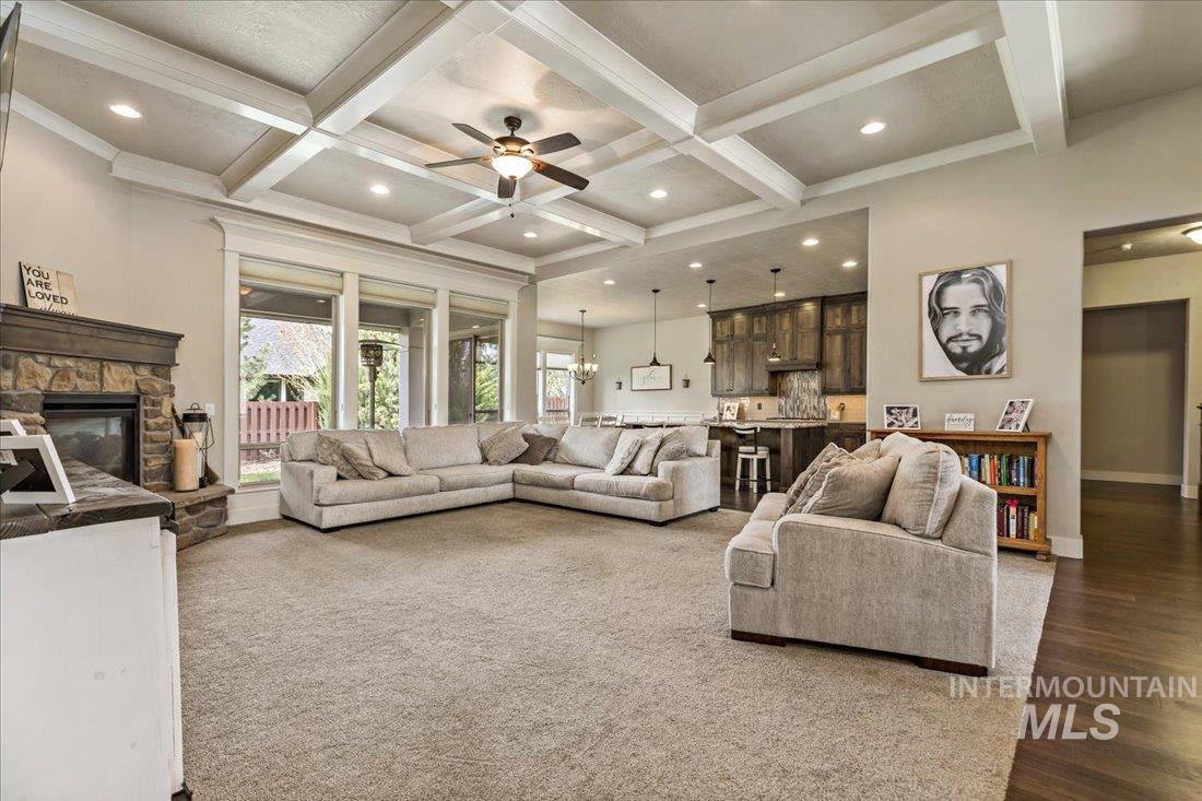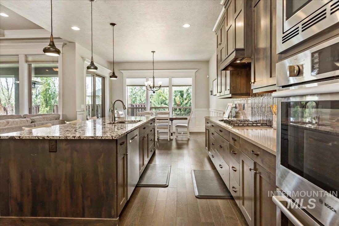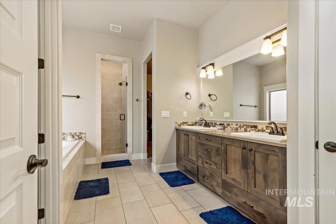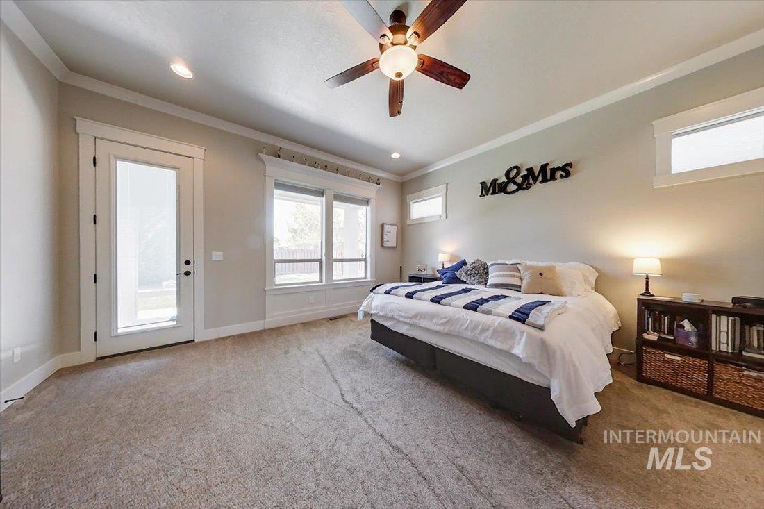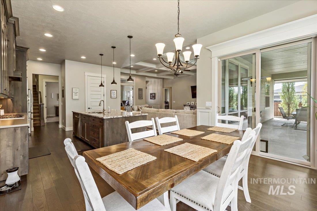 An exceptional opportunity in Eagle’s desirable Foxtail Lakes—thoughtfully designed residence offers elevated living at its finest. Showcasing custom box beams, rich wainscoting, soaring ceilings, & grand 8-foot doors, every element reflects intentional design & timeless sophistication. The gourmet kitchen is a statement of style & function, featuring a large walk in pantry, quartz surfaces with tiled backsplash, full-height cabinetry, & built-in Bosch appliances including double ovens & a gas cooktop. An expansive island anchors the space, flowing seamlessly into the great room with a striking corner fireplace—designed for both intimate evenings and upscale entertaining. The private primary retreat offers direct patio access and a spa-caliber ensuite with dual vanities, a two-person tiled shower, and a luxurious soaking tub. A custom wraparound closet connects effortlessly to the laundry room for ultimate convenience. Upstairs, a bonus suite w/full bath provides a tasteful option for guests or multigenerational living. Outdoors, enjoy an extended covered patio overlooking a private, easy to care for fenced backyard. Complete with an oversized 3-car garage and access to Foxtail Lakes’ clubhouse, pool, meandering walking paths, and tranquil lakes—this is a lifestyle, a place to savor the everyday! Close proximity to amenities/shopping/dining! Click on tour link for 3D walkthrough!