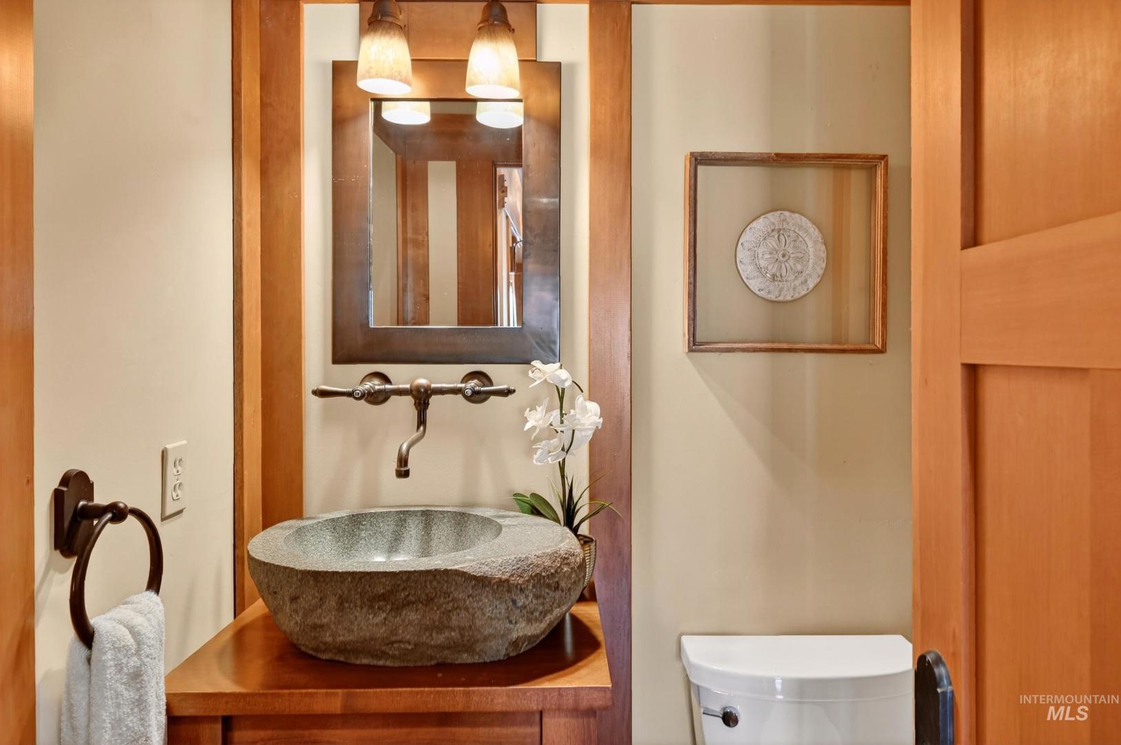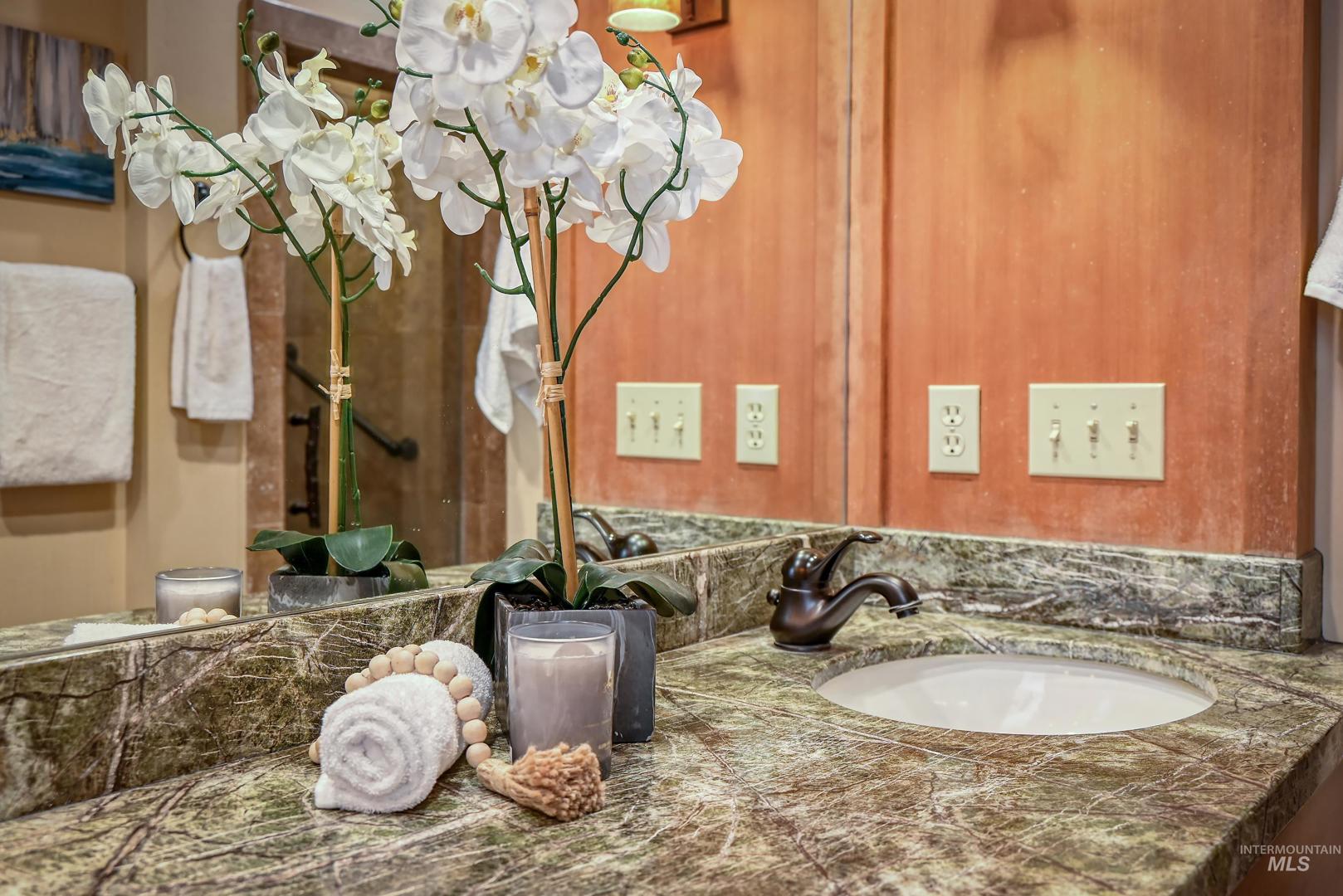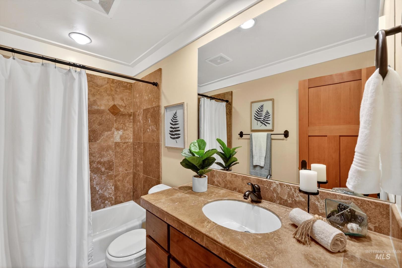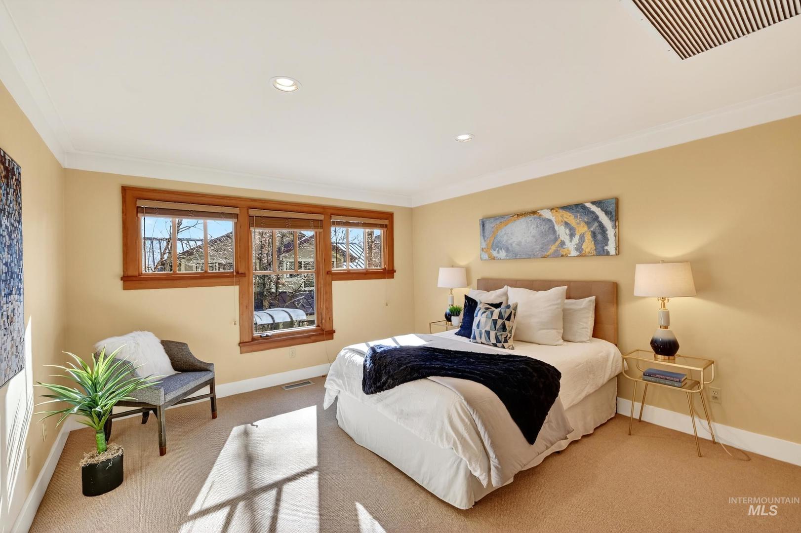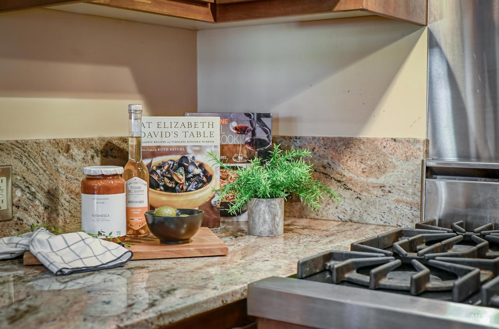 Come home to this coveted Tivoli Gardens waterfront home. A beautiful 3 bedroom, 2.5 bath 2227 sq ft home blends timeless beauty and modern amenities all surrounded by meticulously maintained landscaping. Quality and attention to detail are evident throughout the home. The thoughtfully designed kitchen features a Viking professional-grade range, slab granite counters and breakfast bar all seamlessly flow into the main living areas. The great room is anchored by a stunning sandstone gas fireplace, highlighted by vaulted wood ceilings, sky lights, exposed beams, rich wood paneling, custom trim work, and dramatic windows. Expansive beautiful Brazilian hardwood floors offer warm with detailed inlay. Additional finishes include hand-cast bronze hardware and solid-core doors. The main-level primary offers a wall of windows overlooking the pond, solid surface dual vanity, two walk-in closets and walk-in tile shower. Upstairs, you’ll find two bedrooms, a full bath and bonus room with space for fun and entertainment. Step outside to a waterfront oasis designed for year-round enjoyment. Dine under the stars and enjoy the gentle soothing sounds of the waterfalls amidst mature landscaping. All of this plus a large two-car garage, separate laundry room with storage. Located steps from the Boise River & Greenbelt, Silver Lake. Just minutes from Downtown, restaurants and shopping. BTVA