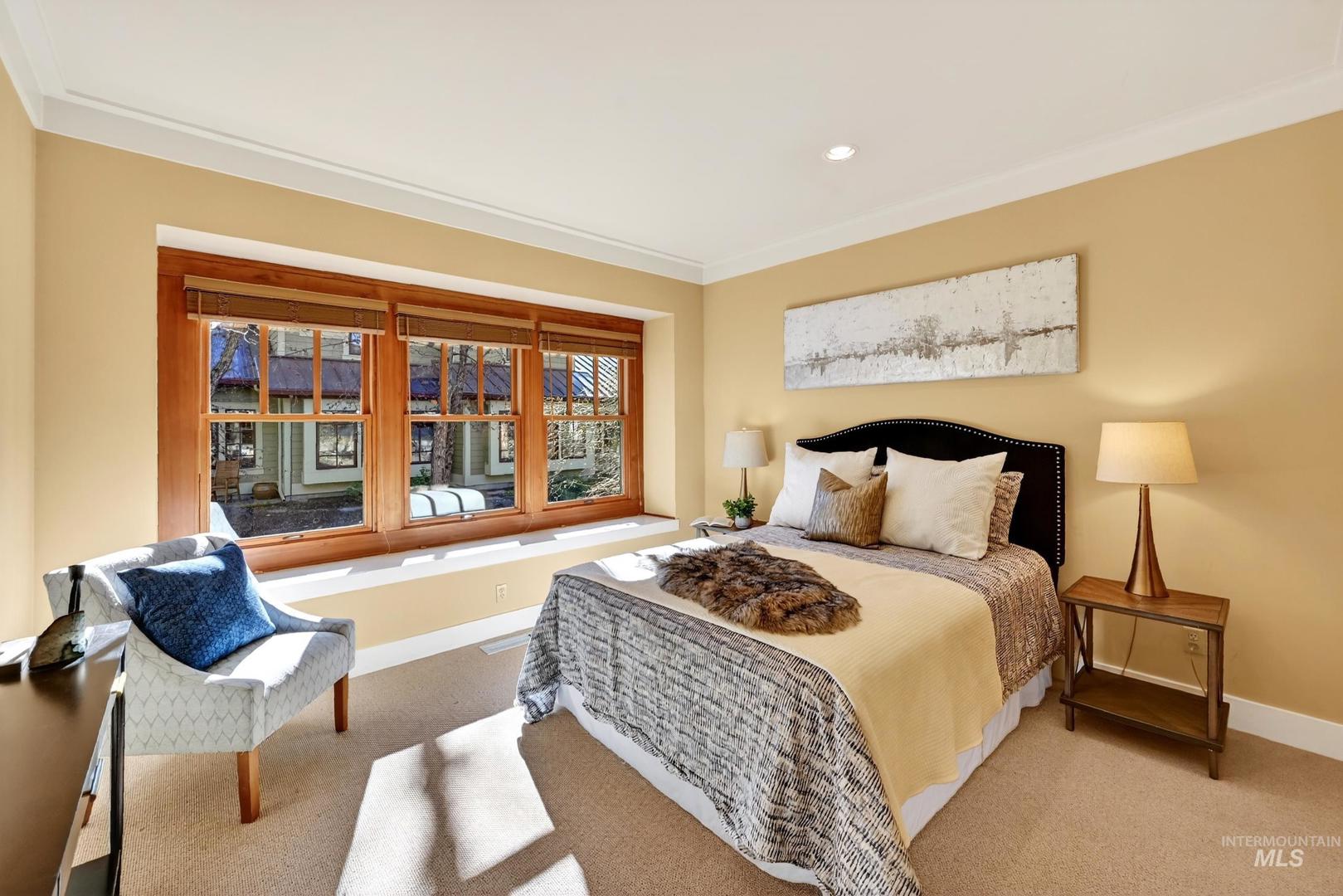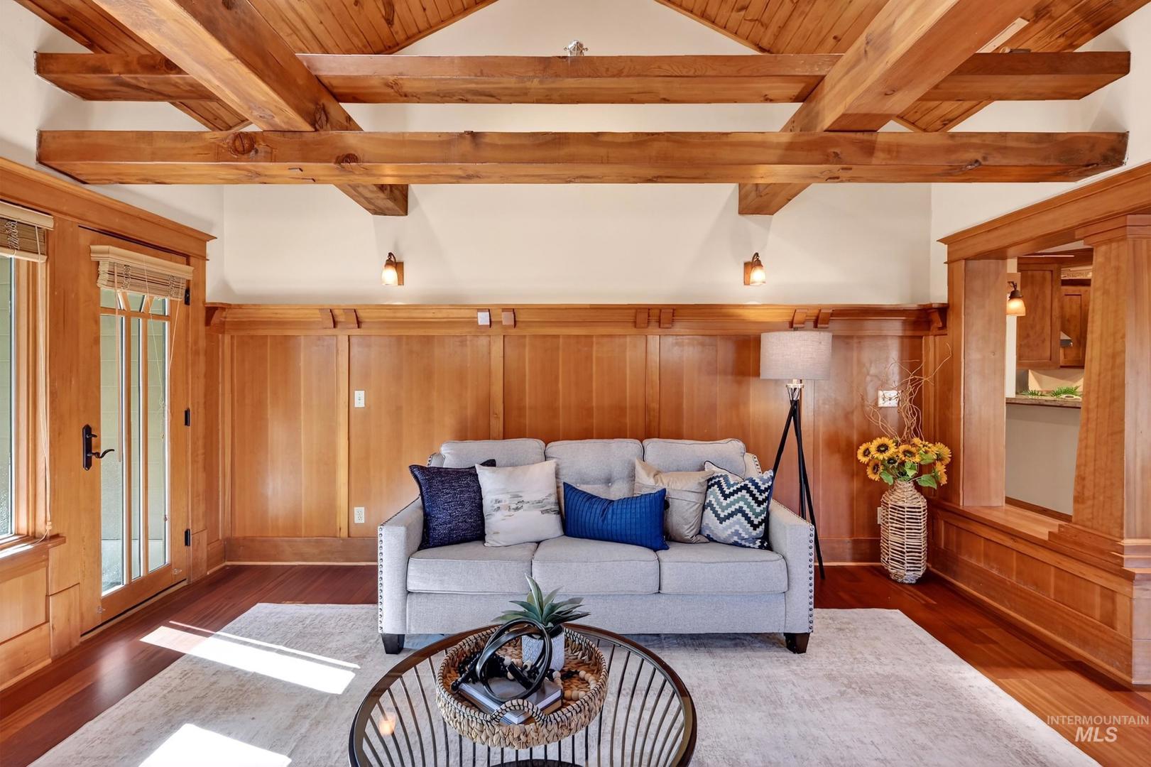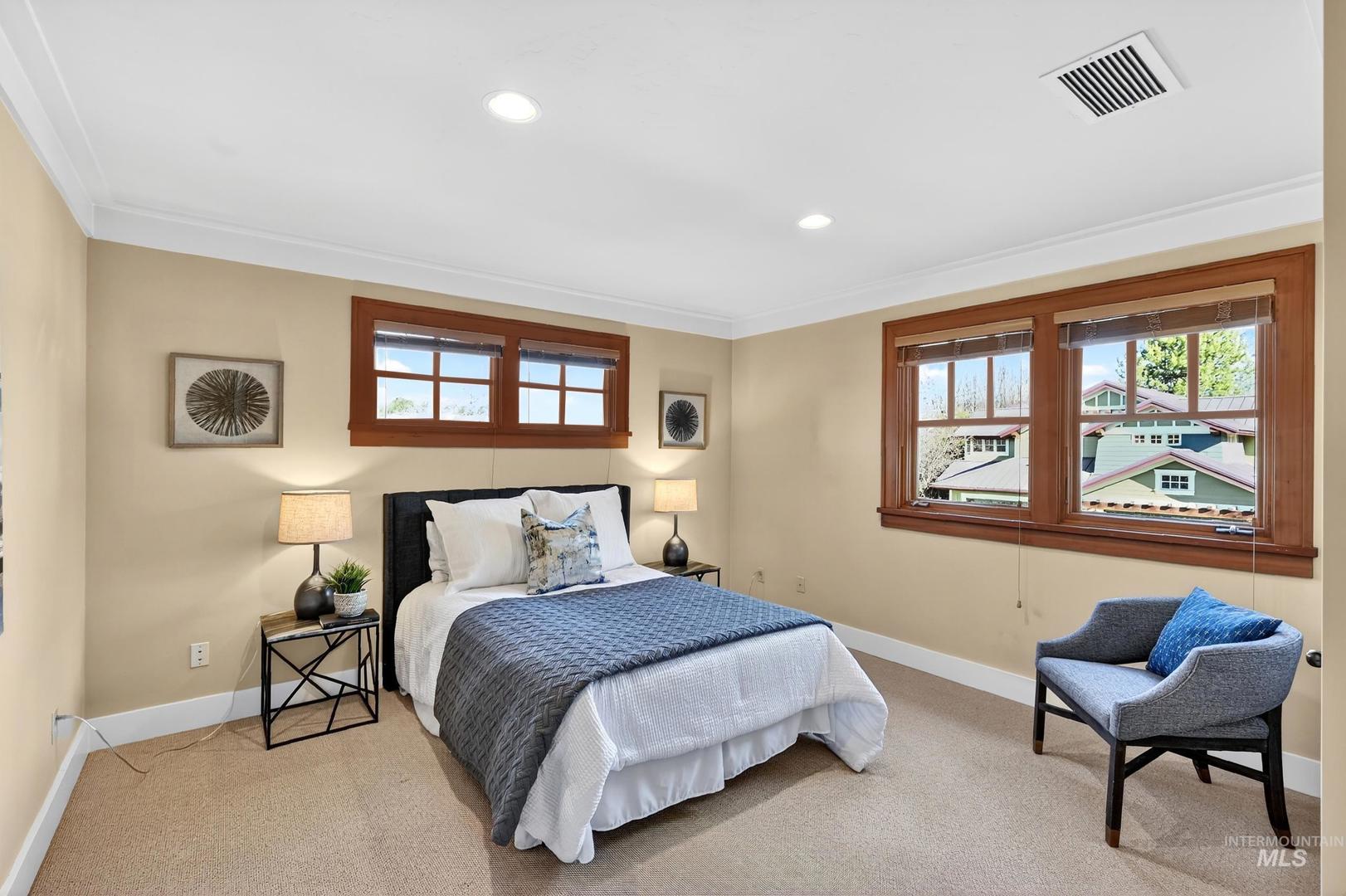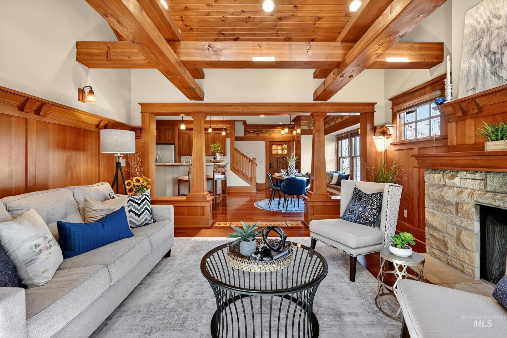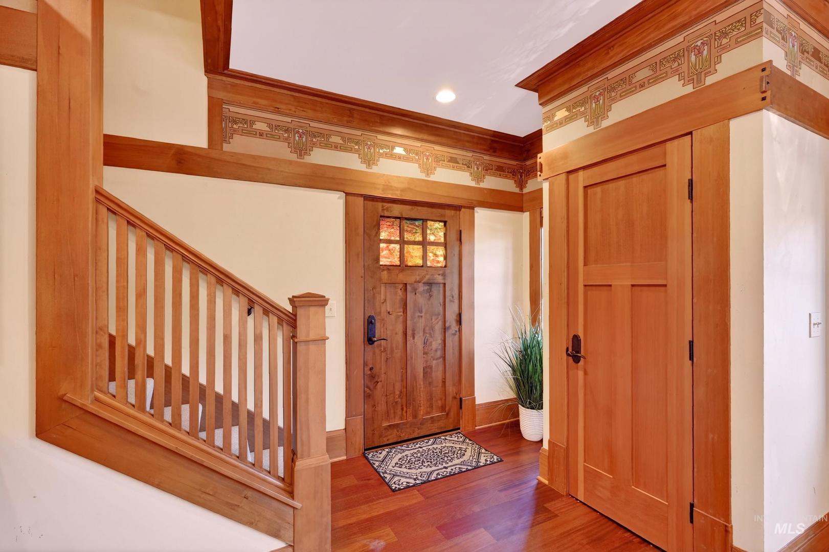 Come home to this coveted Tivoli Gardens waterfront home. A beautiful 3 bedroom, 2.5 bath 2227 sq ft home blends timeless beauty and modern amenities all surrounded by meticulously maintained landscaping. Quality and attention to detail are evident throughout the home. The thoughtfully designed kitchen features a Viking professional-grade range, slab granite counters and breakfast bar all seamlessly flow into the main living areas. The great room is anchored by a stunning sandstone gas fireplace, highlighted by vaulted wood ceilings, sky lights, exposed beams, rich wood paneling, custom trim work, and dramatic windows. Expansive beautiful Brazilian hardwood floors offer warm with detailed inlay. Additional finishes include hand-cast bronze hardware and solid-core doors. The main-level primary offers a wall of windows overlooking the pond, solid surface dual vanity, two walk-in closets and walk-in tile shower. Upstairs, you’ll find two bedrooms, a full bath and bonus room with space for fun and entertainment. Step outside to a waterfront oasis designed for year-round enjoyment. Dine under the stars and enjoy the gentle soothing sounds of the waterfalls amidst mature landscaping. All of this plus a large two-car garage, separate laundry room with storage. Located steps from the Boise River & Greenbelt, Silver Lake. Just minutes from Downtown, restaurants and shopping. BTVA