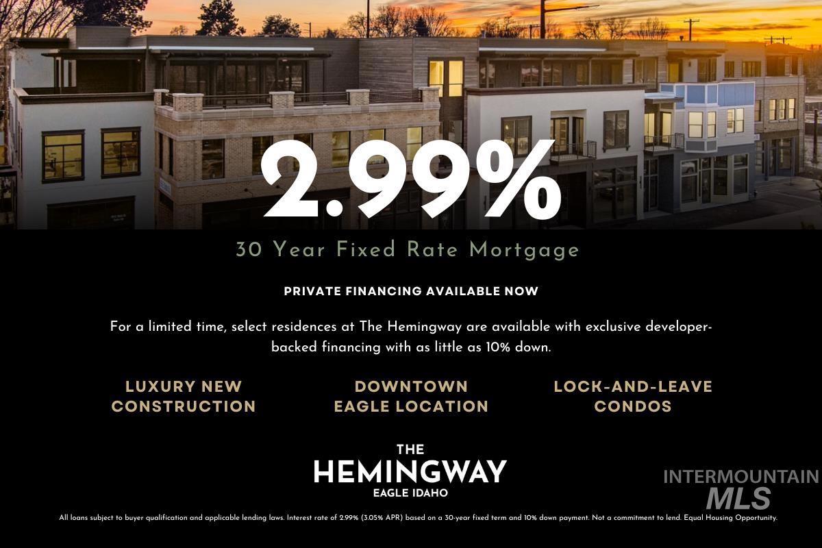 The Crest Penthouse stands as the pinnacle of The Hemingway’s limited collection, an architecturally elevated residence shaped for those who live without compromise. One of only 16 homes, representing a rare opportunity to live above it all, surrounded by light & artfully crafted interiors. Morning light filters through expansive north-facing glass casting a soft glow across rich walnut cabinetry & a sculptural charcoal stone fireplace wall. Throughout, ten-foot ceilings frame mountain views that shift with seasons with peaks catching morning sun, golden ridgelines at sunset. The kitchen is a culinary retreat, centered around an oversized island & fitted with Wolf & Sub-Zero® appliances. A residence where time is reclaimed & just steps from Eagle’s tree-lined downtown, where cafés, shopping & dining extend the experience beyond your front door. Secure access & protected parking at downtown Eagle`s premier new residential address. Exclusive developer financing opportunity: 2.99% fixed rate, 10% down, 30 years.