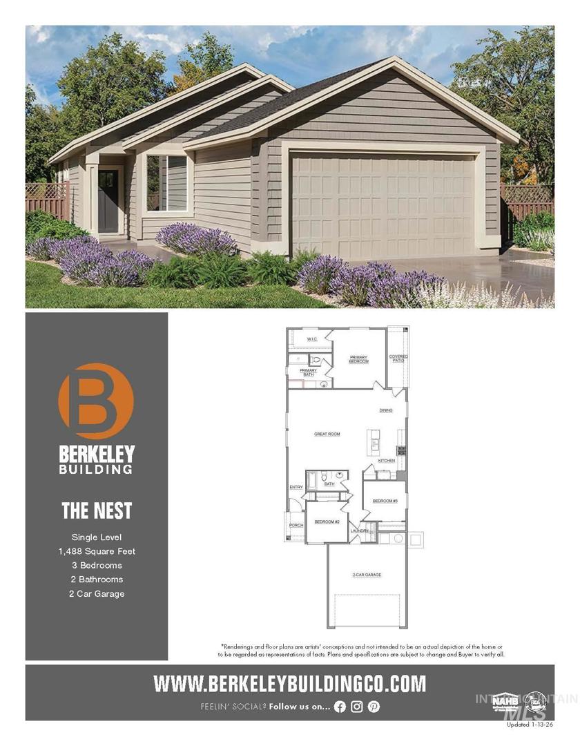 Close to town yet rich with country charm, Autumn Creek sits just minutes from Lake Lowell, scenic trails, and peaceful wildlife preserves. With manicured green common areas and a sparkling community pool, it offers a refreshing place to gather with neighbors and truly feel at home. The 1,488 sf Nest Plan welcomes you with charming exterior details and a cozy covered porch. Inside, an expansive great room flows into a beautifully appointed kitchen featuring quartz countertops, a pantry, and a generous island ideal for cooking and gathering. A light-filled dining area opens to a fully landscaped backyard with an extended covered patio. Two bedrooms, a guest bath, a dedicated laundry room, and extra storage offer everyday convenience, while the primary suite provides a spacious retreat with an ensuite bath and a windowed walk-in closet. This to-be-built home shows off true Berkeley craftsmanship, including curated interior design packages to choose from, painted 6" baseboards and 1x4 door casings. So much more thought, and value per square foot.