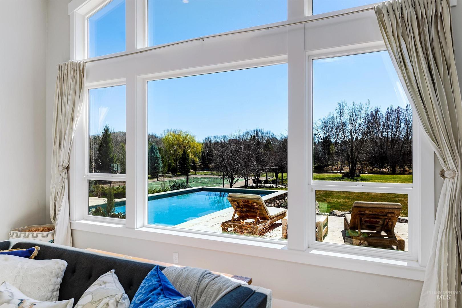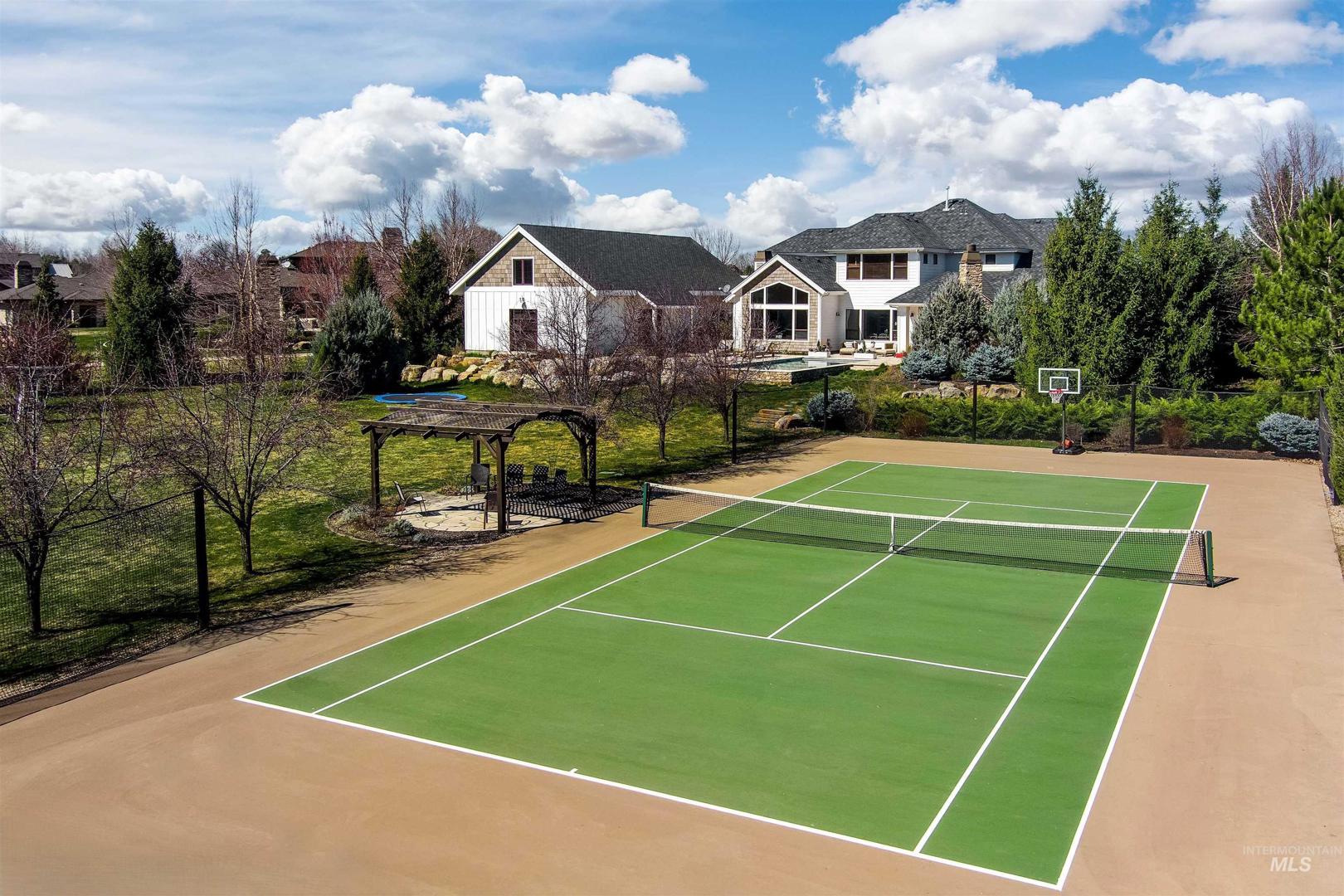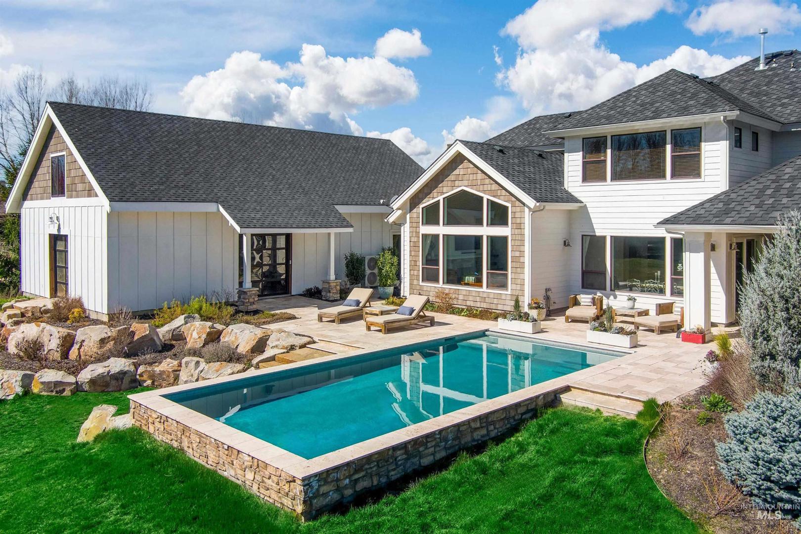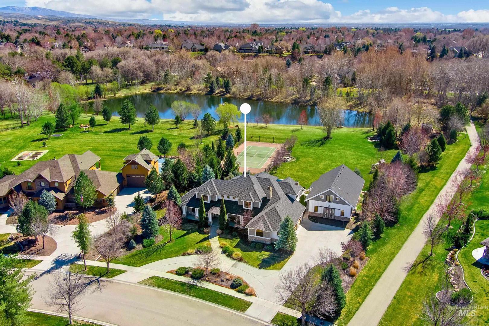 Set along a tranquil waterfront with expansive green space and a private tennis court, this meticulous 2.3-acre Eagle residence offers a rare blend of refined design, resort-style living, and everyday comfort. Located in the coveted Vizcaya community with Eagle’s top-rated schools, the property delivers on exclusivity and proximity. Mature landscaping and a sweeping one-acre backyard lawn, the grounds feature a fire pit gathering area, an in-ground trampoline, and a circular driveway. Inside the home, there is a true five-bedroom layout with a bonus room, a dedicated office, and multiple spaces, including both living and family rooms. Large windows throughout create a bright, open atmosphere, filling the interiors with natural light. A south-facing kitchen with expansive granite surfaces, custom cabinetry, and an island ready for everyday living and effortless entertaining. The primary suite provides a peaceful retreat with upscale finishes, a spacious layout, and serene views. A detached structure offers a private in-law suite/ADU with its own entrance, plus space for up to five vehicles or for use as a shop, rec room, or hobby area. Designed for both relaxation and recreation, the outdoor living spaces include a stunning pool, expansive patio with a rock fireplace, and direct access to the large pond. This rare Eagle property combines space, versatility, and elevated living.