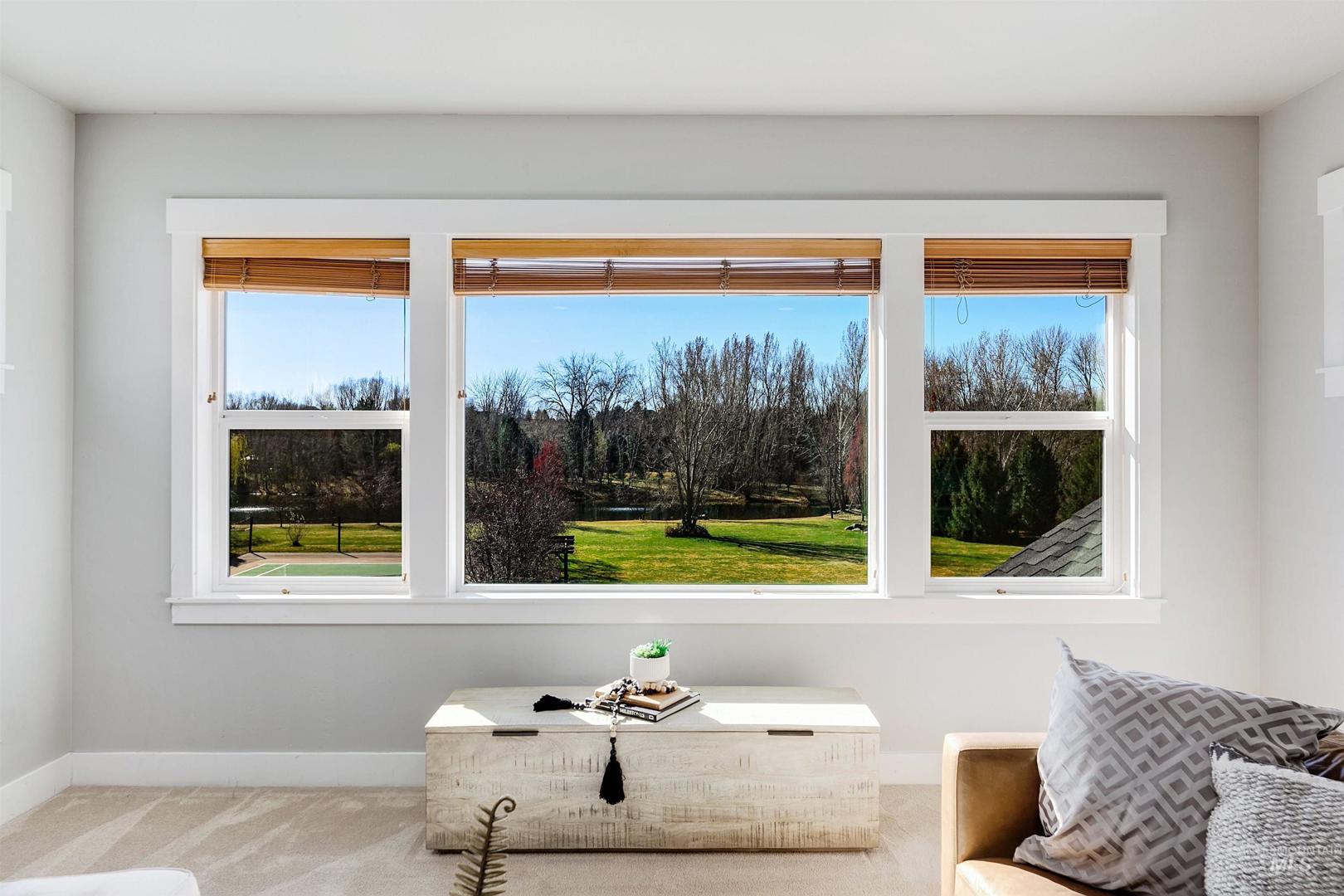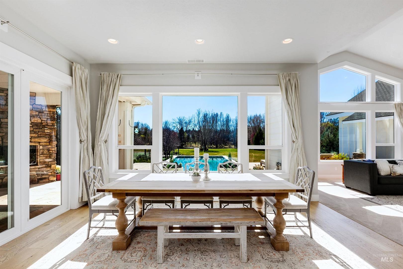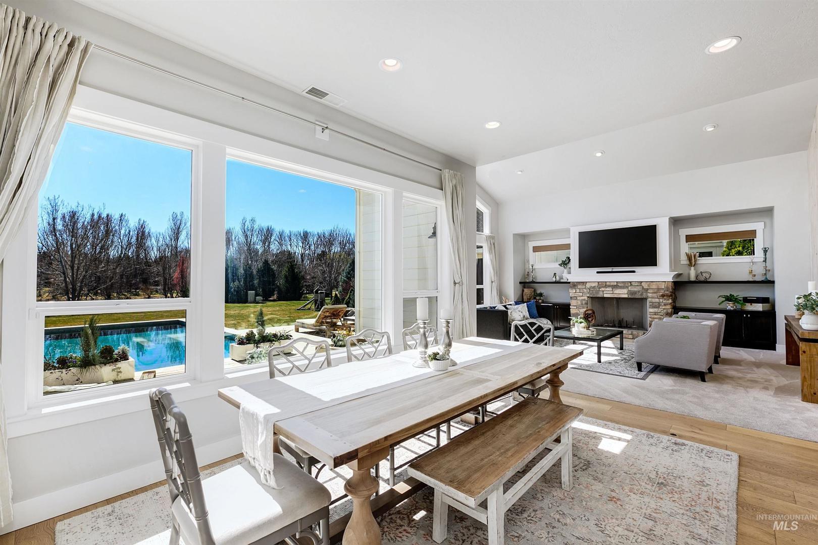Set along a tranquil waterfront with expansive green space and a private tennis court, this meticulous 2.3-acre Eagle residence offers a rare blend of refined design, resort-style living, and everyday comfort. Located in the coveted Vizcaya community with Eagle’s top-rated schools, the property delivers on exclusivity and proximity. Mature landscaping and a sweeping one-acre backyard lawn, the grounds feature a fire pit gathering area, an in-ground trampoline, and a circular driveway. Inside the home, there is a true five-bedroom layout with a bonus room, a dedicated office, and multiple spaces, including both living and family rooms. Large windows throughout create a bright, open atmosphere, filling the interiors with natural light. A south-facing kitchen with expansive granite surfaces, custom cabinetry, and an island ready for everyday living and effortless entertaining. The primary suite provides a peaceful retreat with upscale finishes, a spacious layout, and serene views. A detached structure offers a private in-law suite/ADU with its own entrance, plus space for up to five vehicles or for use as a shop, rec room, or hobby area. Designed for both relaxation and recreation, the outdoor living spaces include a stunning pool, expansive patio with a rock fireplace, and direct access to the large pond. This rare Eagle property combines space, versatility, and elevated living.