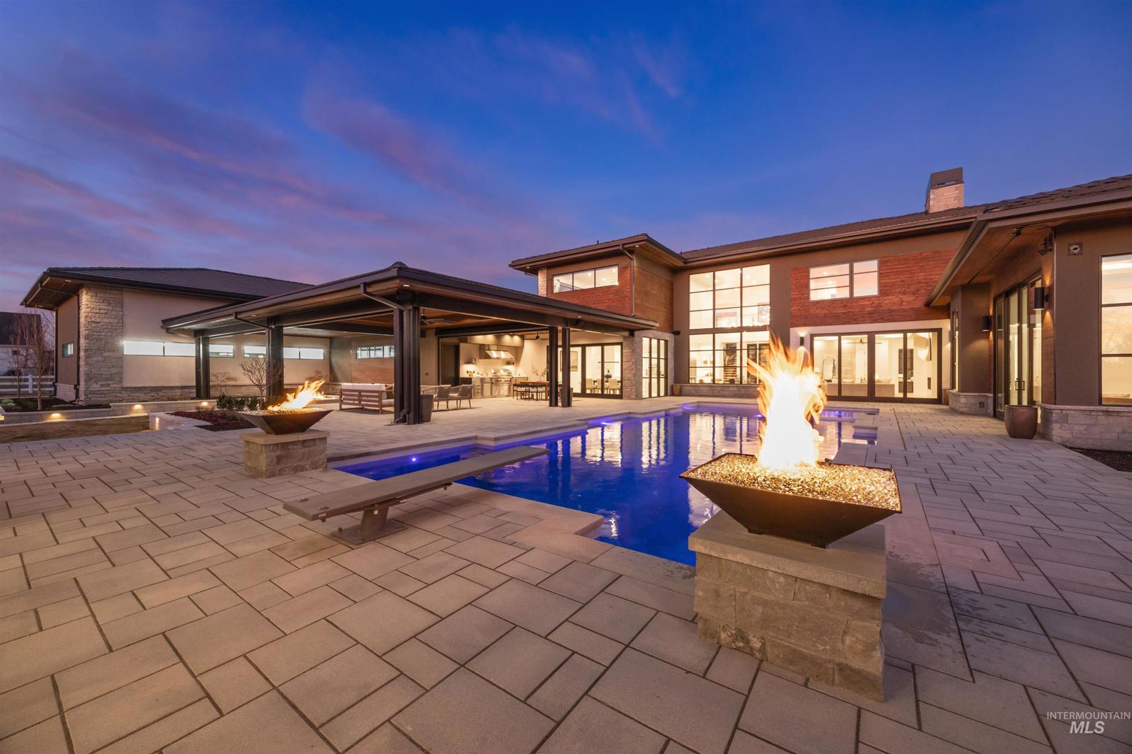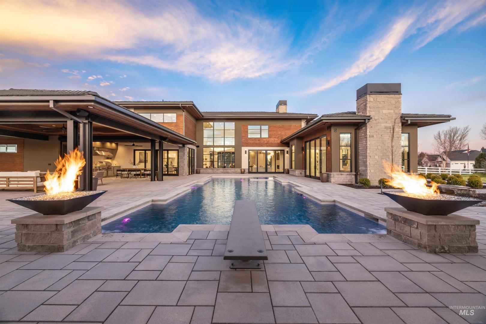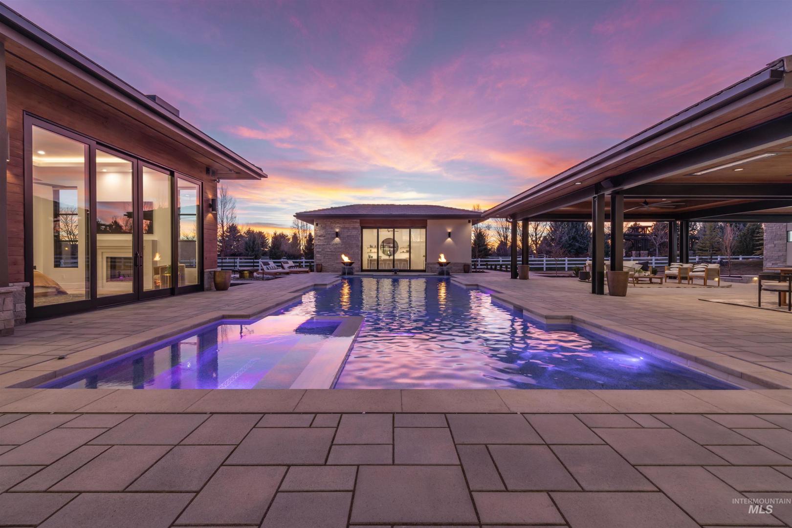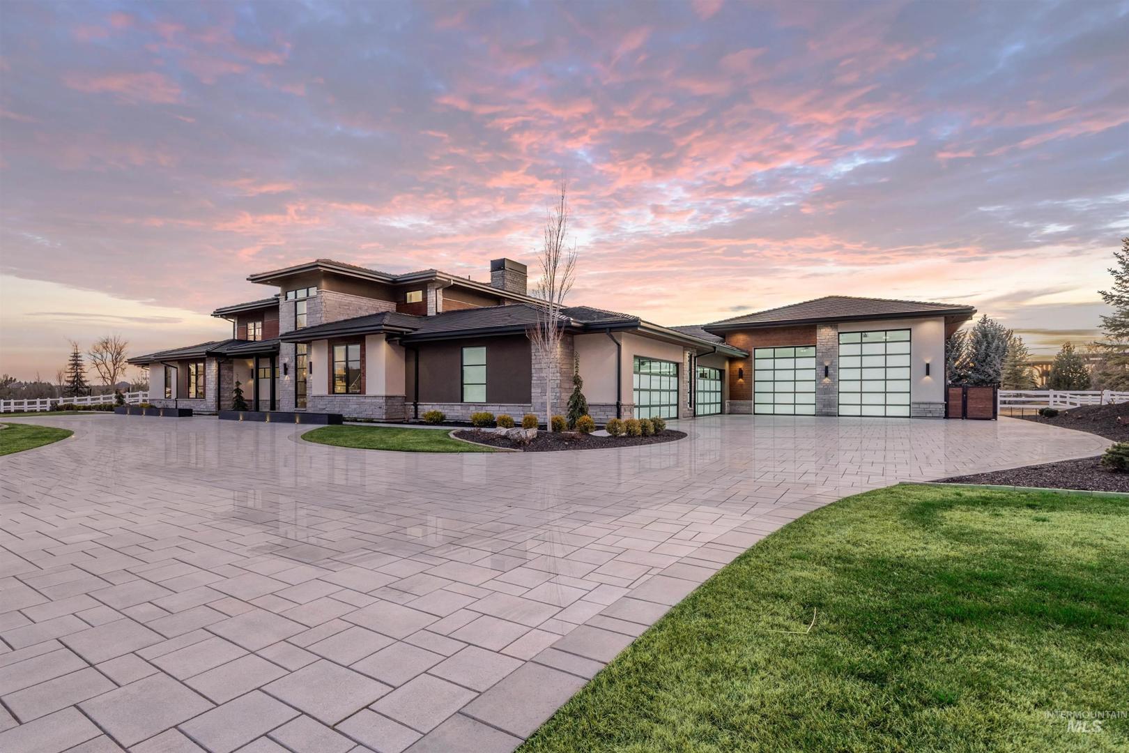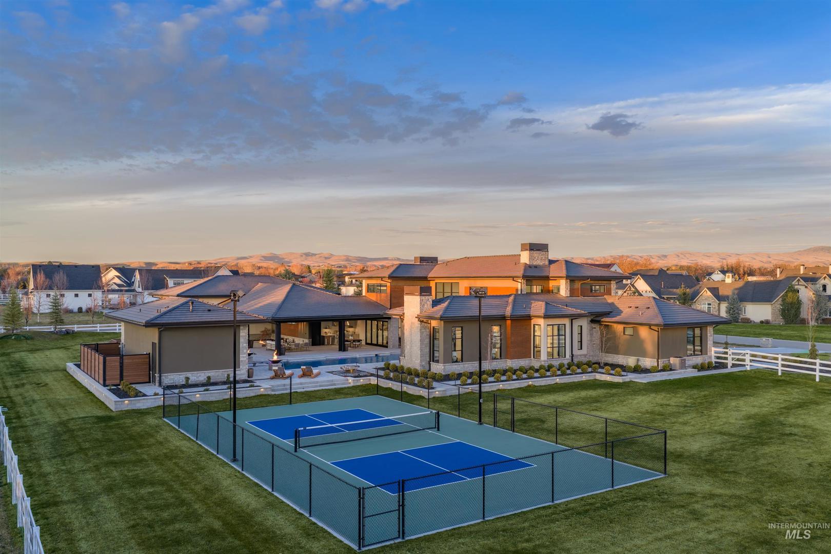 A rare opportunity to own one of Eagle’s most impressive newly built estates. Set on 1.84 private acres, this extraordinary modern home blends clean architectural design with expansive living spaces and resort-style amenities. Dramatic walls of glass and expansive sliding doors flood the home with natural light and frame views of the resort-style grounds, designed to surround the pool for seamless indoor-outdoor living. The chef’s kitchen features quartz countertops, Thermador appliances, custom cabinetry, and a designer butler’s pantry. Thoughtfully designed with a private executive office, spacious game room, and lower-level recreation or bonus space ideal for a gym, media room, or additional living area. The primary suite offers a spa-like retreat with marble countertops, heated floors, and a statement soaking tub. Each bedroom includes its own en suite bath. Resort-style outdoor living includes a pool, spa, pickleball court, in-ground trampoline, and pool house with kitchen, entertaining area, bath, and changing room. A 1,478 sq ft covered outdoor living area extends the home with an outdoor kitchen, heaters, built-in speakers, and automatic screens. Impressive 3,810 sq ft heated garage with double RV bay, custom cabinetry, and car lift. 12,997 sq ft under roof in one of Eagle’s most sought-after settings, offering an exceptional blend of design, privacy, and lifestyle.
