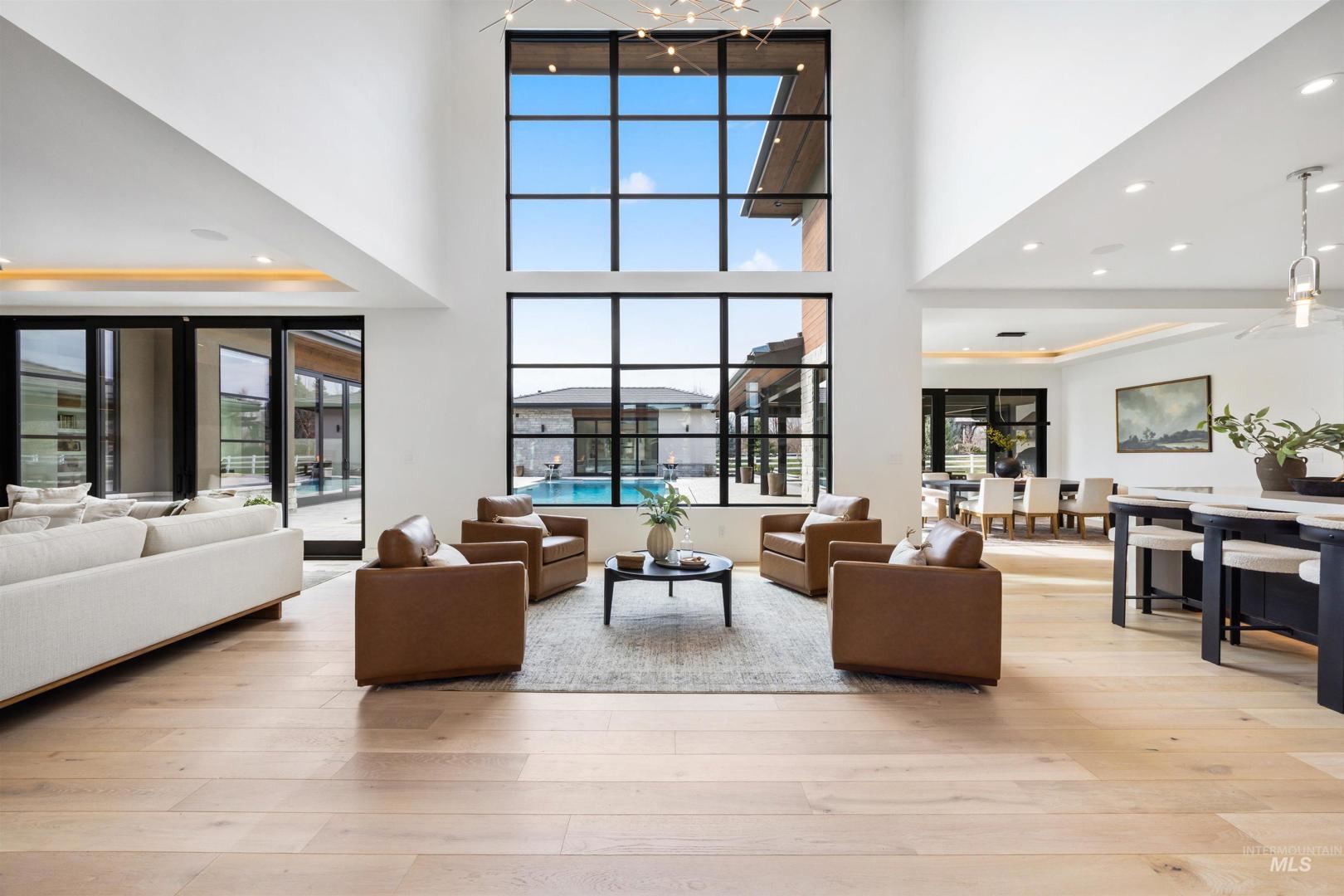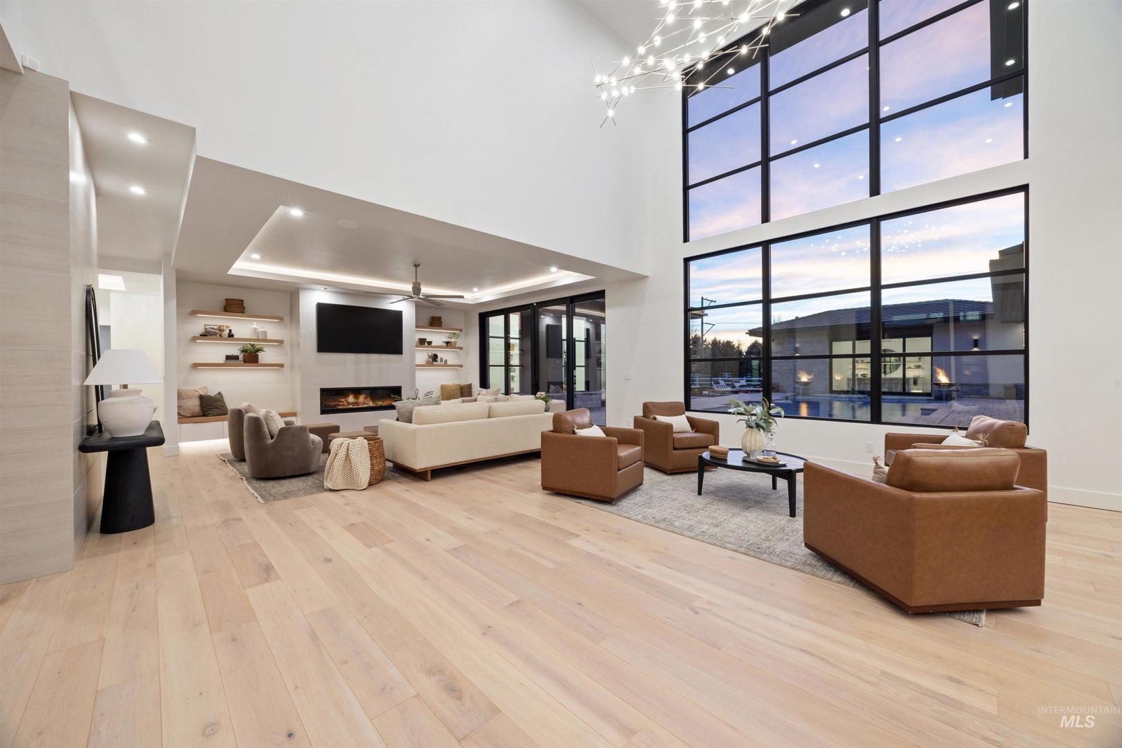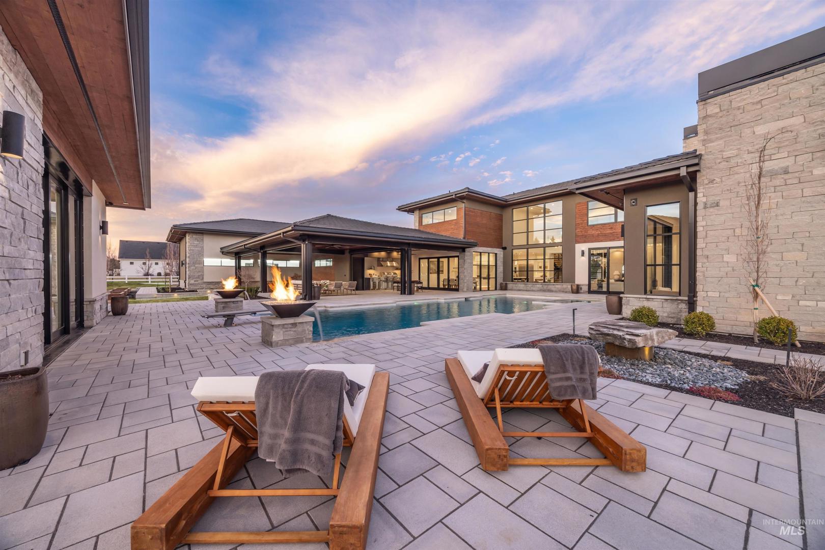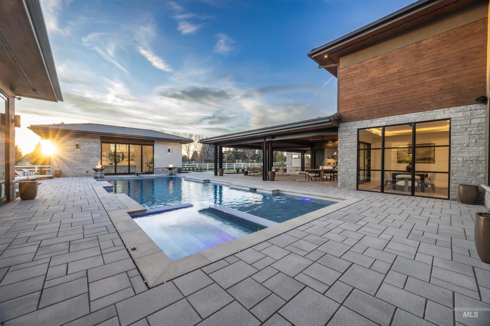 A rare opportunity to own one of Eagle’s most impressive newly built estates. Set on 1.84 private acres, this extraordinary modern home blends clean architectural design with expansive living spaces and resort-style amenities. Dramatic walls of glass and expansive sliding doors flood the home with natural light and frame views of the resort-style grounds, designed to surround the pool for seamless indoor-outdoor living. The chef’s kitchen features quartz countertops, Thermador appliances, custom cabinetry, and a designer butler’s pantry. Thoughtfully designed with a private executive office, spacious game room, and lower-level recreation or bonus space ideal for a gym, media room, or additional living area. The primary suite offers a spa-like retreat with marble countertops, heated floors, and a statement soaking tub. Each bedroom includes its own en suite bath. Resort-style outdoor living includes a pool, spa, pickleball court, in-ground trampoline, and pool house with kitchen, entertaining area, bath, and changing room. A 1,478 sq ft covered outdoor living area extends the home with an outdoor kitchen, heaters, built-in speakers, and automatic screens. Impressive 3,810 sq ft heated garage with double RV bay, custom cabinetry, and car lift. 12,997 sq ft under roof in one of Eagle’s most sought-after settings, offering an exceptional blend of design, privacy, and lifestyle.
