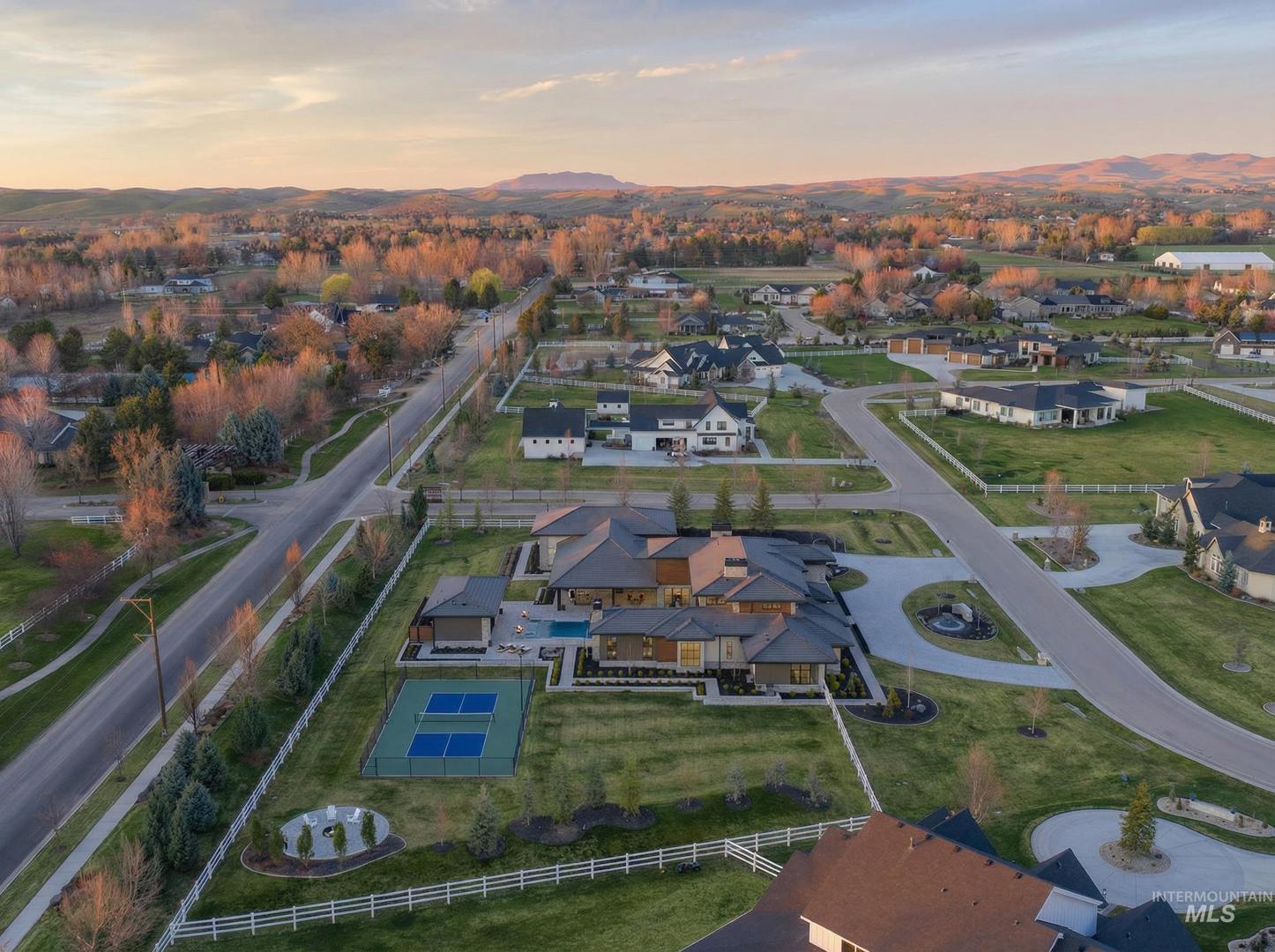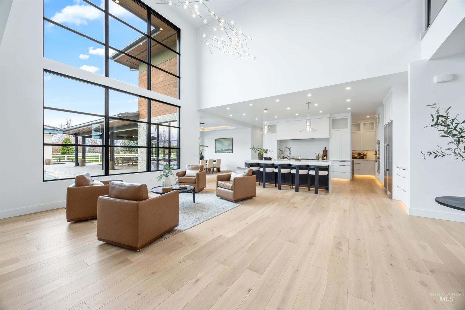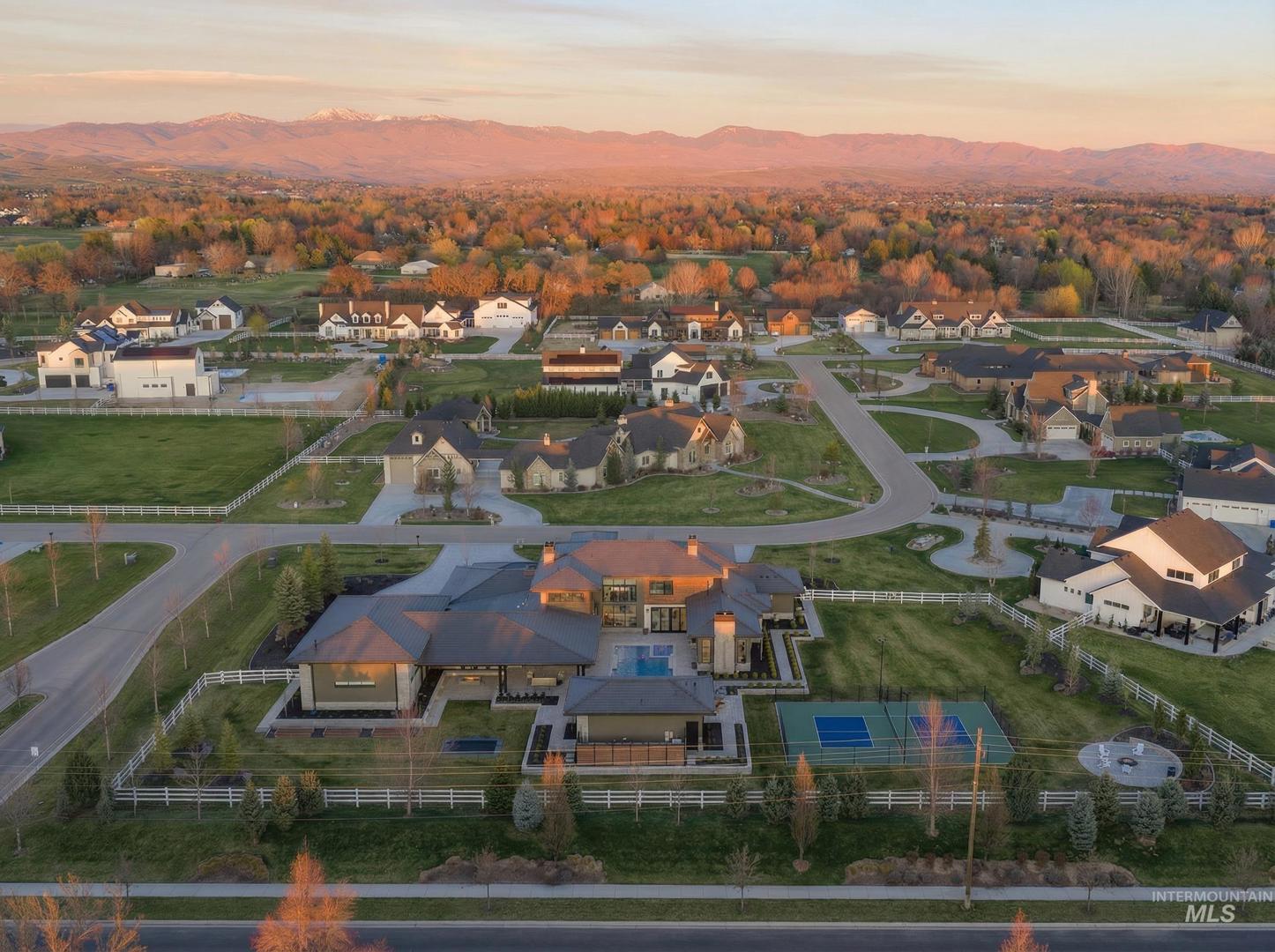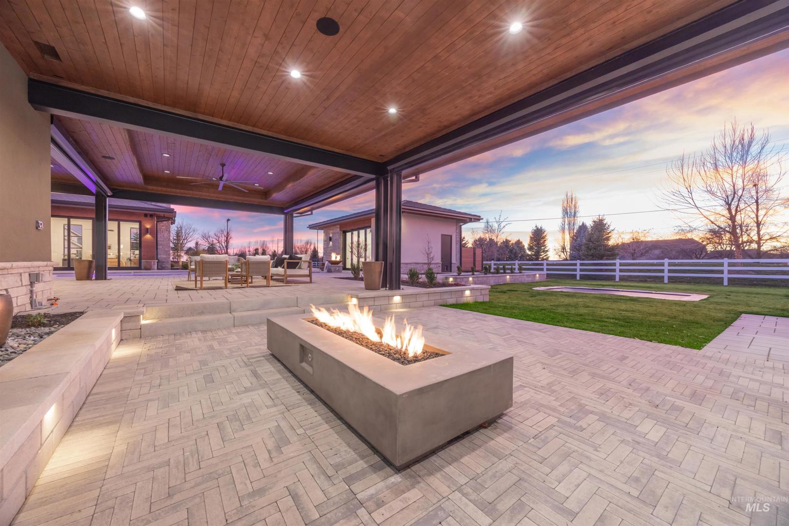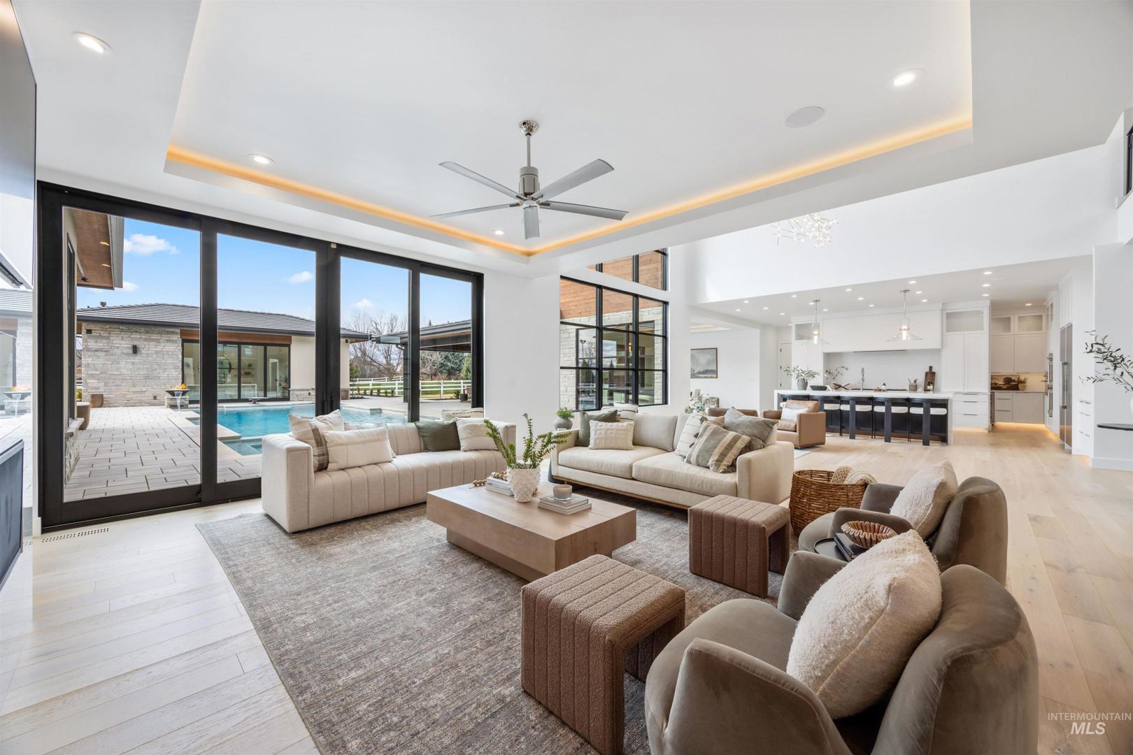 A rare opportunity to own one of Eagle’s most impressive newly built estates. Set on 1.84 private acres, this extraordinary modern home blends clean architectural design with expansive living spaces and resort-style amenities. Dramatic walls of glass and expansive sliding doors flood the home with natural light and frame views of the resort-style grounds, designed to surround the pool for seamless indoor-outdoor living. The chef’s kitchen features quartz countertops, Thermador appliances, custom cabinetry, and a designer butler’s pantry. Thoughtfully designed with a private executive office, spacious game room, and lower-level recreation or bonus space ideal for a gym, media room, or additional living area. The primary suite offers a spa-like retreat with marble countertops, heated floors, and a statement soaking tub. Each bedroom includes its own en suite bath. Resort-style outdoor living includes a pool, spa, pickleball court, in-ground trampoline, and pool house with kitchen, entertaining area, bath, and changing room. A 1,478 sq ft covered outdoor living area extends the home with an outdoor kitchen, heaters, built-in speakers, and automatic screens. Impressive 3,810 sq ft heated garage with double RV bay, custom cabinetry, and car lift. 12,997 sq ft under roof in one of Eagle’s most sought-after settings, offering an exceptional blend of design, privacy, and lifestyle.