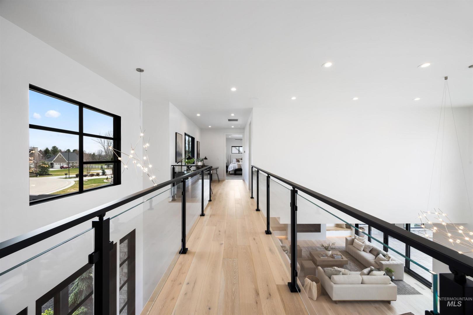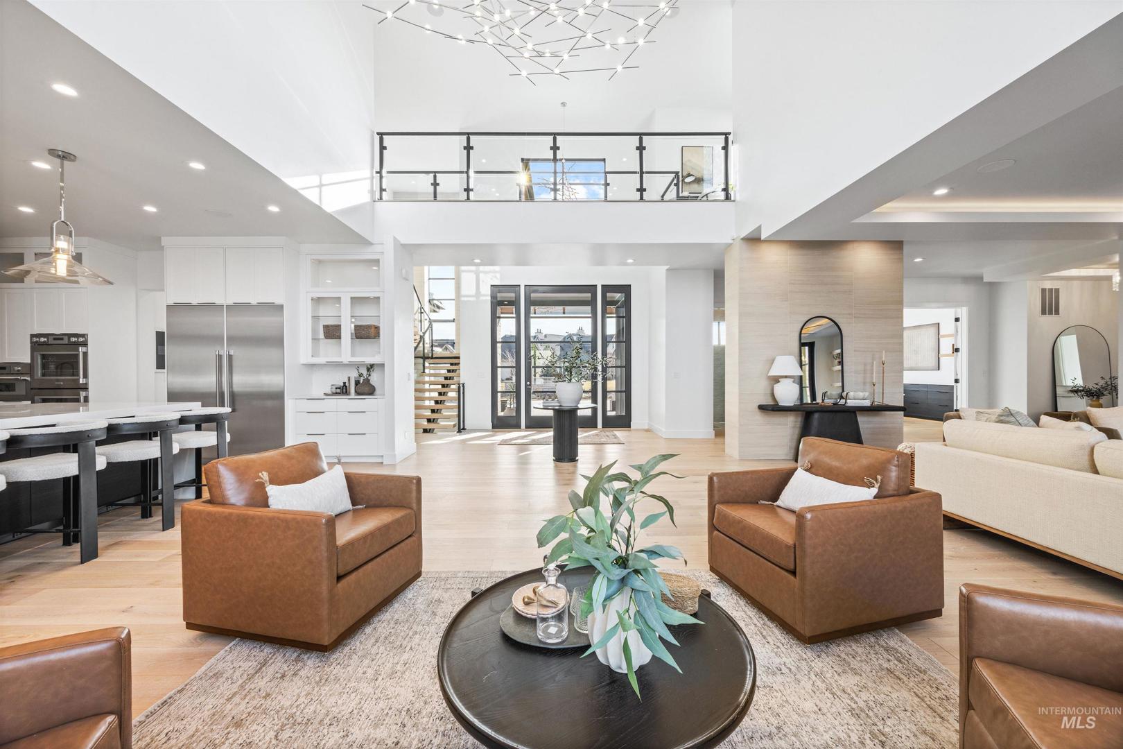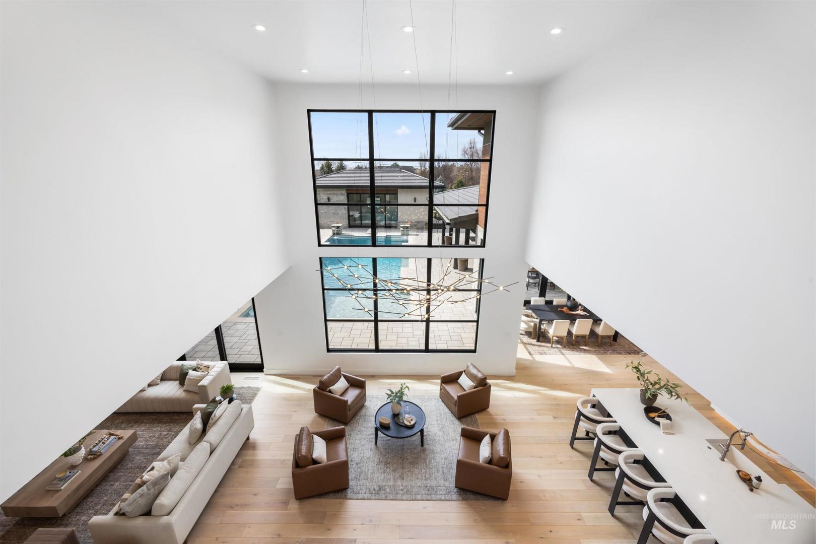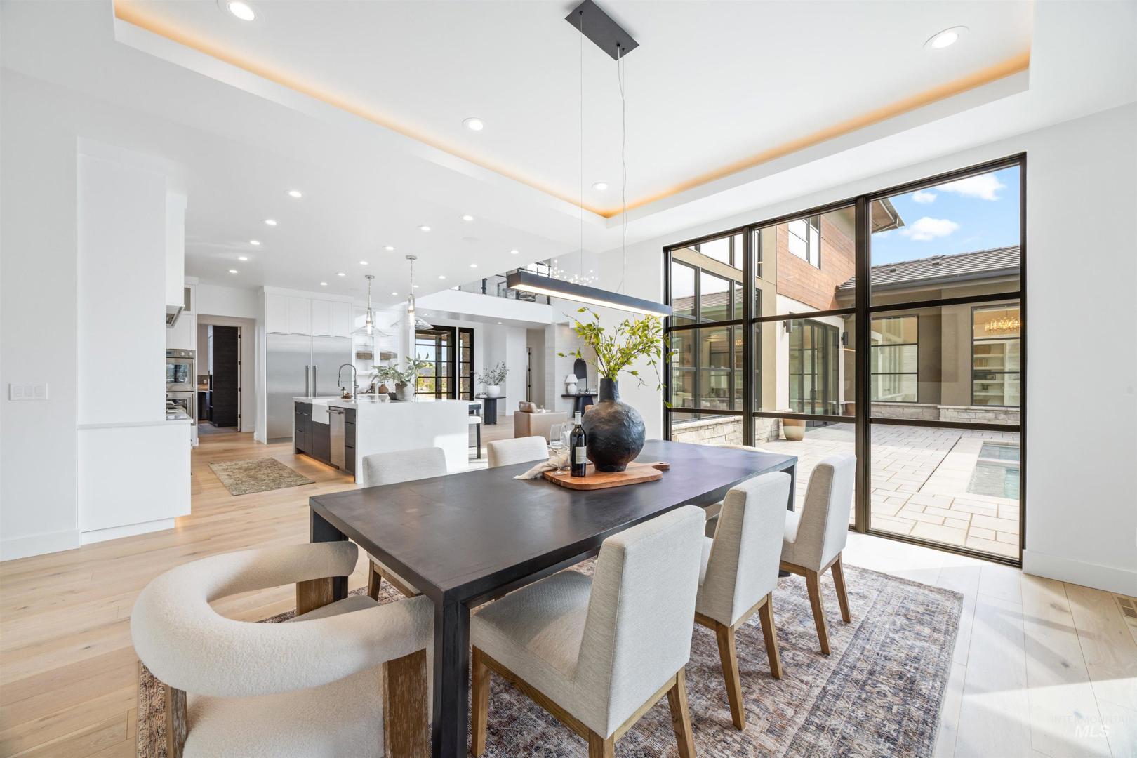 A rare opportunity to own one of Eagle’s most impressive newly built estates. Set on 1.84 private acres, this extraordinary modern home blends clean architectural design with expansive living spaces and resort-style amenities. Dramatic walls of glass and expansive sliding doors flood the home with natural light and frame views of the resort-style grounds, designed to surround the pool for seamless indoor-outdoor living. The chef’s kitchen features quartz countertops, Thermador appliances, custom cabinetry, and a designer butler’s pantry. Thoughtfully designed with a private executive office, spacious game room, and lower-level recreation or bonus space ideal for a gym, media room, or additional living area. The primary suite offers a spa-like retreat with marble countertops, heated floors, and a statement soaking tub. Each bedroom includes its own en suite bath. Resort-style outdoor living includes a pool, spa, pickleball court, in-ground trampoline, and pool house with kitchen, entertaining area, bath, and changing room. A 1,478 sq ft covered outdoor living area extends the home with an outdoor kitchen, heaters, built-in speakers, and automatic screens. Impressive 3,810 sq ft heated garage with double RV bay, custom cabinetry, and car lift. 12,997 sq ft under roof in one of Eagle’s most sought-after settings, offering an exceptional blend of design, privacy, and lifestyle.