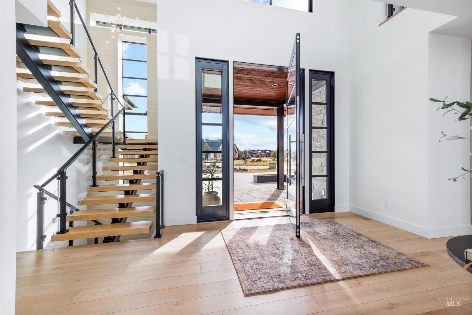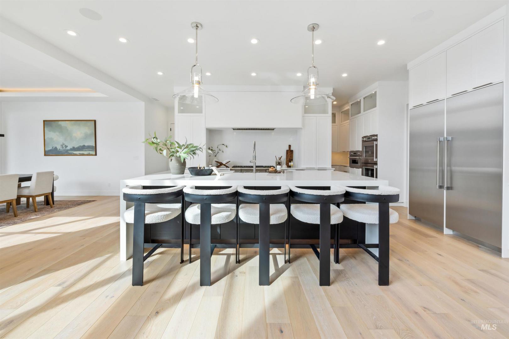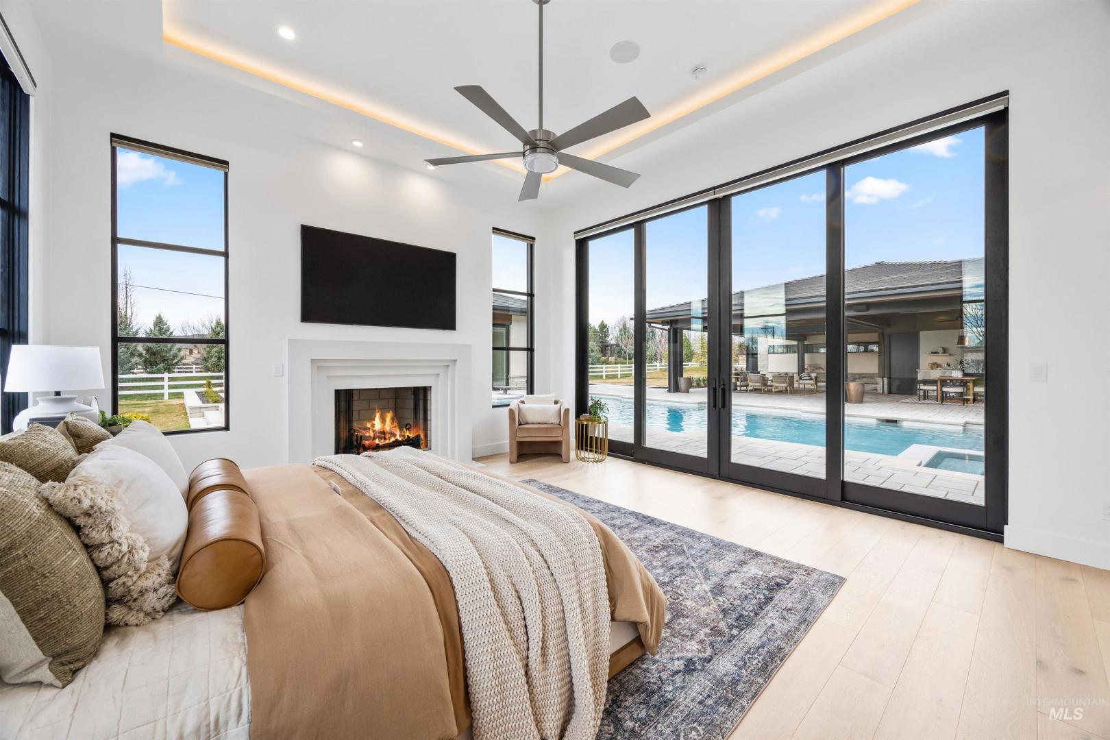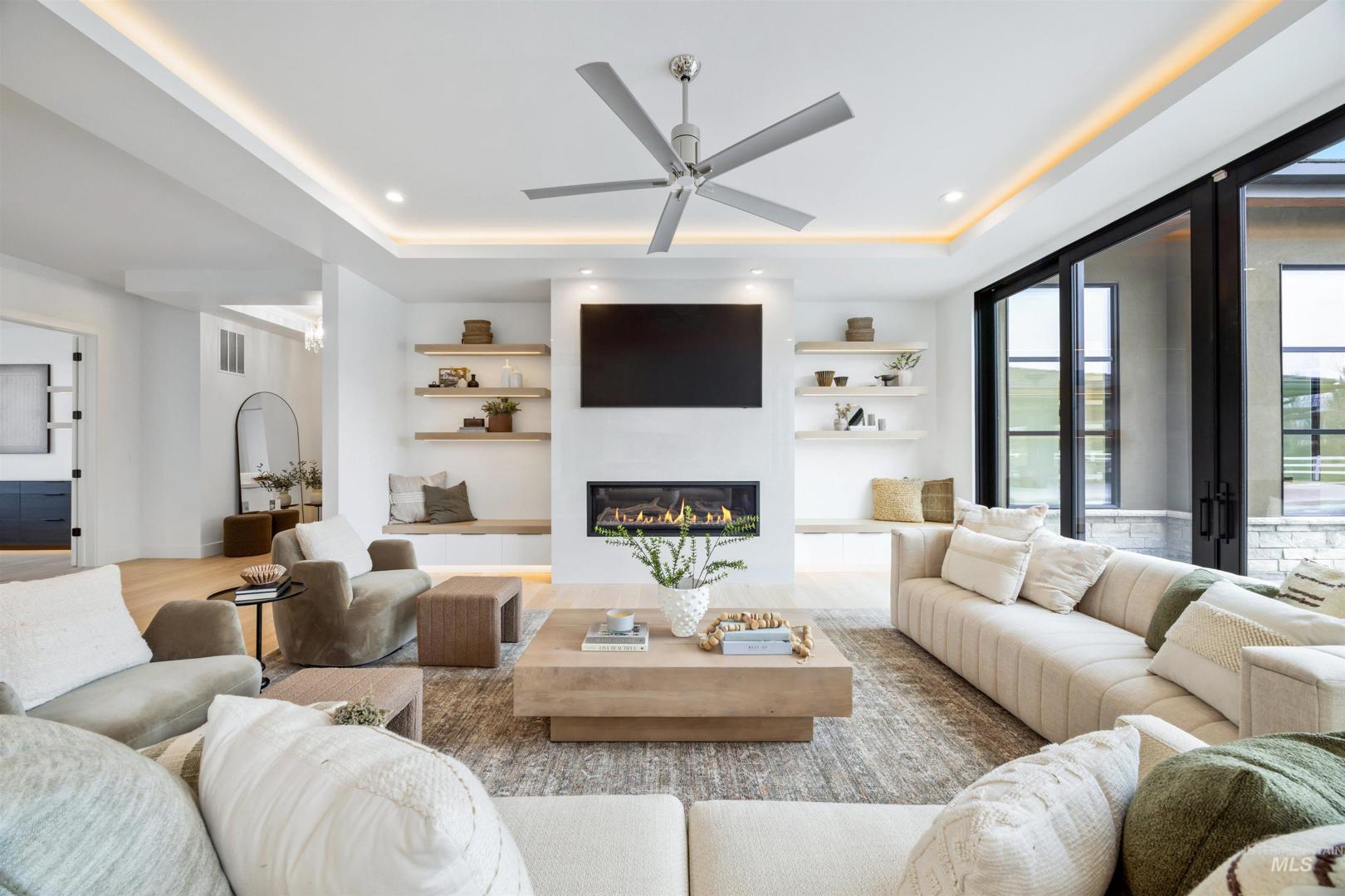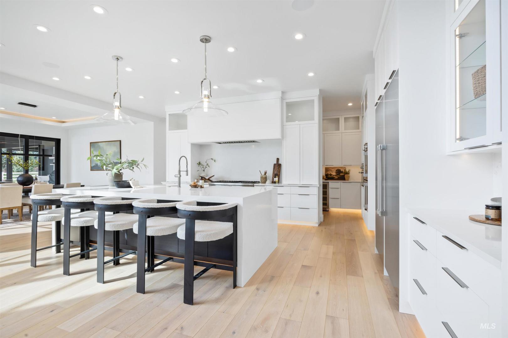 A rare opportunity to own one of Eagle’s most impressive newly built estates. Set on 1.84 private acres, this extraordinary modern home blends clean architectural design with expansive living spaces and resort-style amenities. Dramatic walls of glass and expansive sliding doors flood the home with natural light and frame views of the resort-style grounds, designed to surround the pool for seamless indoor-outdoor living. The chef’s kitchen features quartz countertops, Thermador appliances, custom cabinetry, and a designer butler’s pantry. Thoughtfully designed with a private executive office, spacious game room, and lower-level recreation or bonus space ideal for a gym, media room, or additional living area. The primary suite offers a spa-like retreat with marble countertops, heated floors, and a statement soaking tub. Each bedroom includes its own en suite bath. Resort-style outdoor living includes a pool, spa, pickleball court, in-ground trampoline, and pool house with kitchen, entertaining area, bath, and changing room. A 1,478 sq ft covered outdoor living area extends the home with an outdoor kitchen, heaters, built-in speakers, and automatic screens. Impressive 3,810 sq ft heated garage with double RV bay, custom cabinetry, and car lift. 12,997 sq ft under roof in one of Eagle’s most sought-after settings, offering an exceptional blend of design, privacy, and lifestyle.