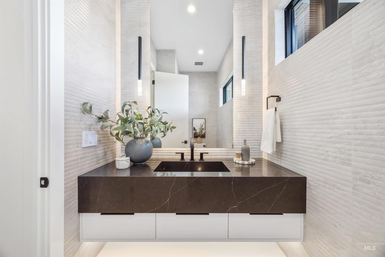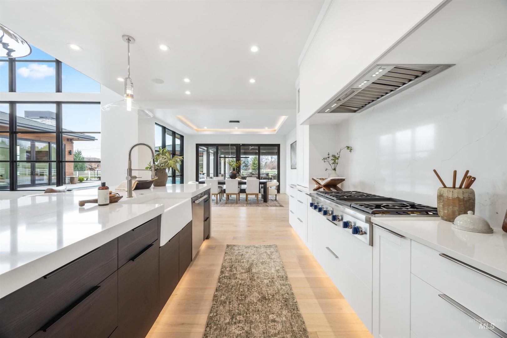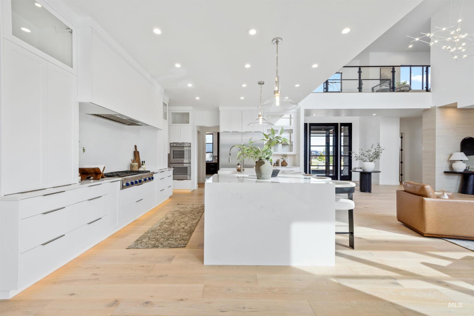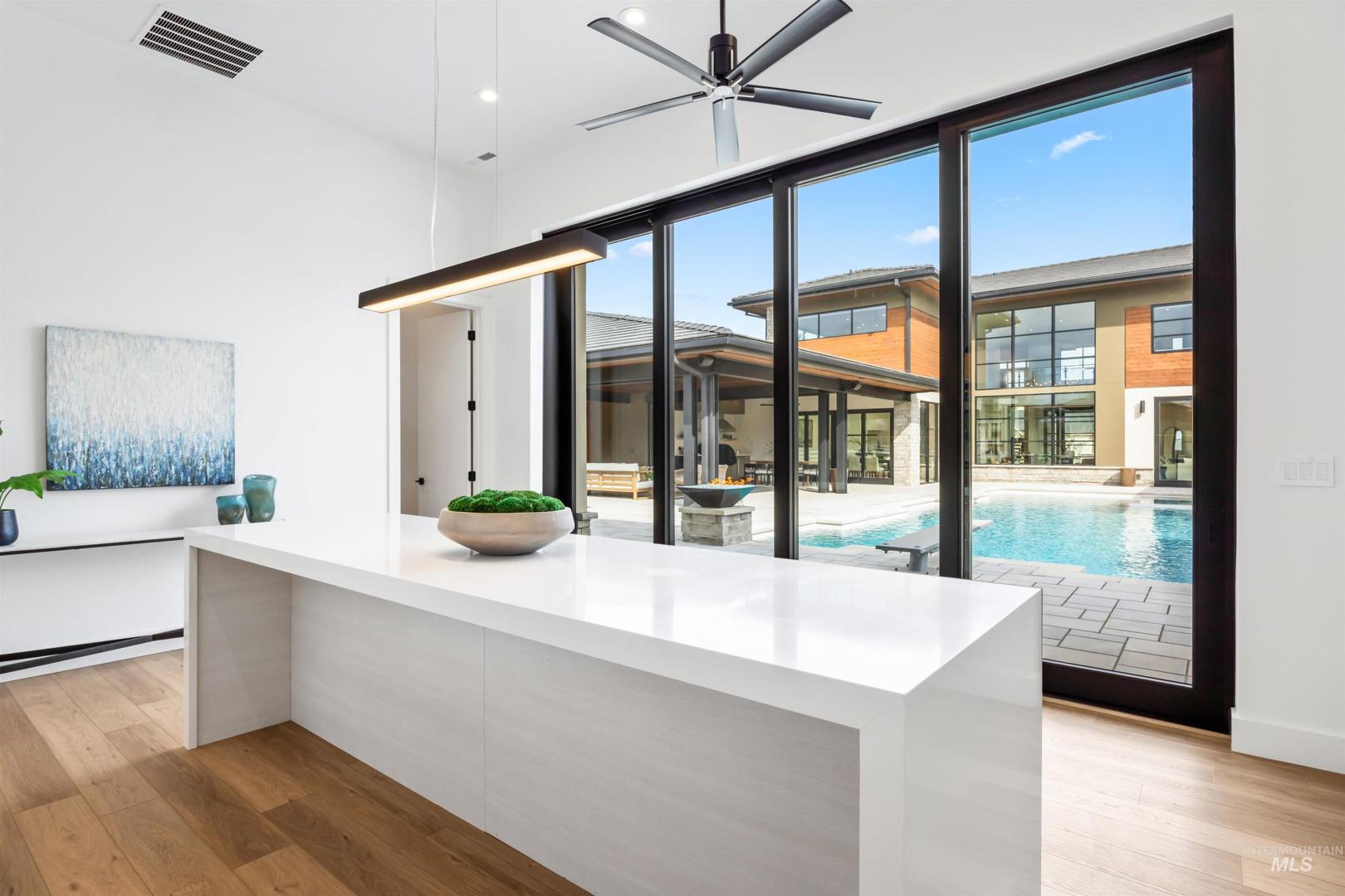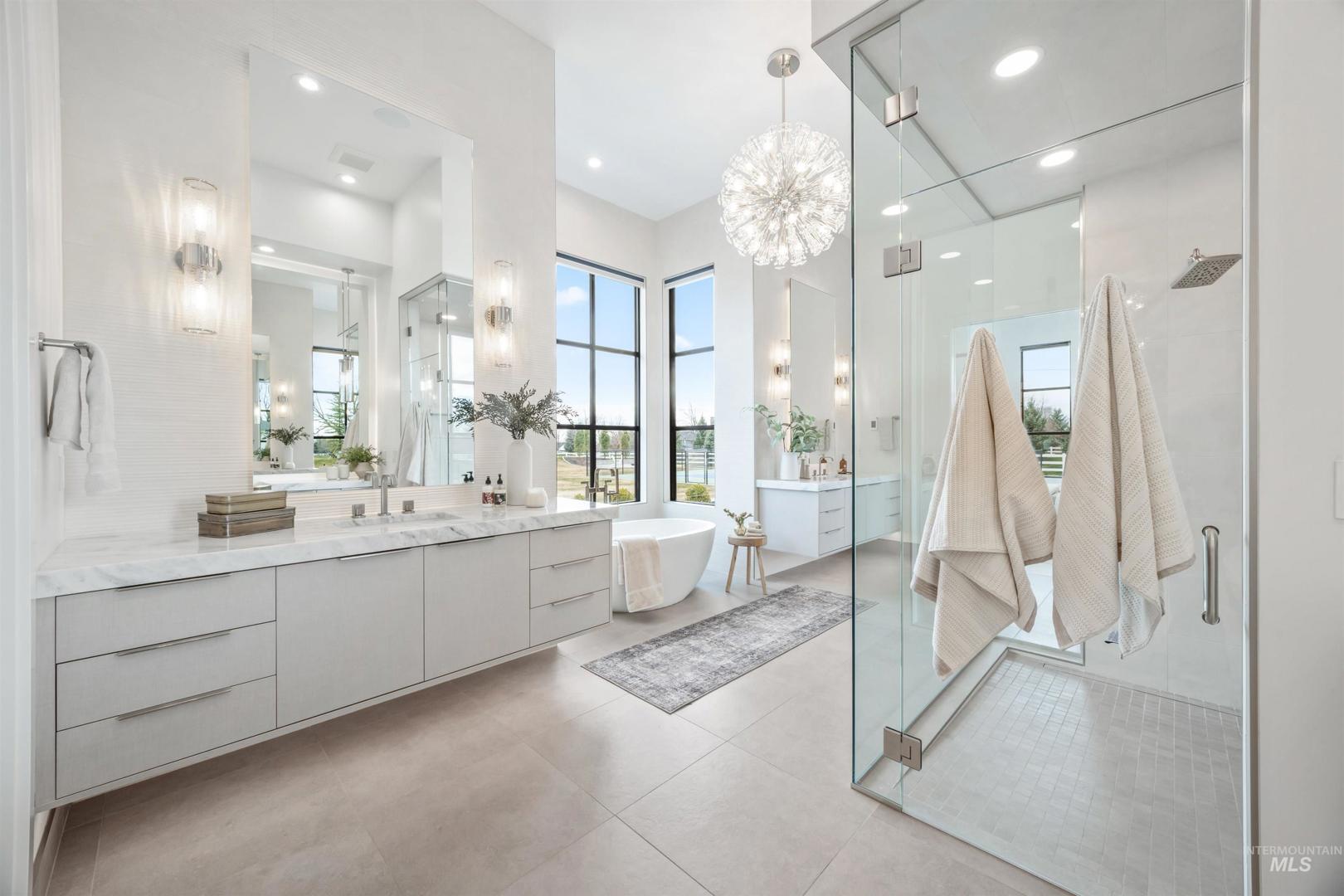 A rare opportunity to own one of Eagle’s most impressive newly built estates. Set on 1.84 private acres, this extraordinary modern home blends clean architectural design with expansive living spaces and resort-style amenities. Dramatic walls of glass and expansive sliding doors flood the home with natural light and frame views of the resort-style grounds, designed to surround the pool for seamless indoor-outdoor living. The chef’s kitchen features quartz countertops, Thermador appliances, custom cabinetry, and a designer butler’s pantry. Thoughtfully designed with a private executive office, spacious game room, and lower-level recreation or bonus space ideal for a gym, media room, or additional living area. The primary suite offers a spa-like retreat with marble countertops, heated floors, and a statement soaking tub. Each bedroom includes its own en suite bath. Resort-style outdoor living includes a pool, spa, pickleball court, in-ground trampoline, and pool house with kitchen, entertaining area, bath, and changing room. A 1,478 sq ft covered outdoor living area extends the home with an outdoor kitchen, heaters, built-in speakers, and automatic screens. Impressive 3,810 sq ft heated garage with double RV bay, custom cabinetry, and car lift. 12,997 sq ft under roof in one of Eagle’s most sought-after settings, offering an exceptional blend of design, privacy, and lifestyle.