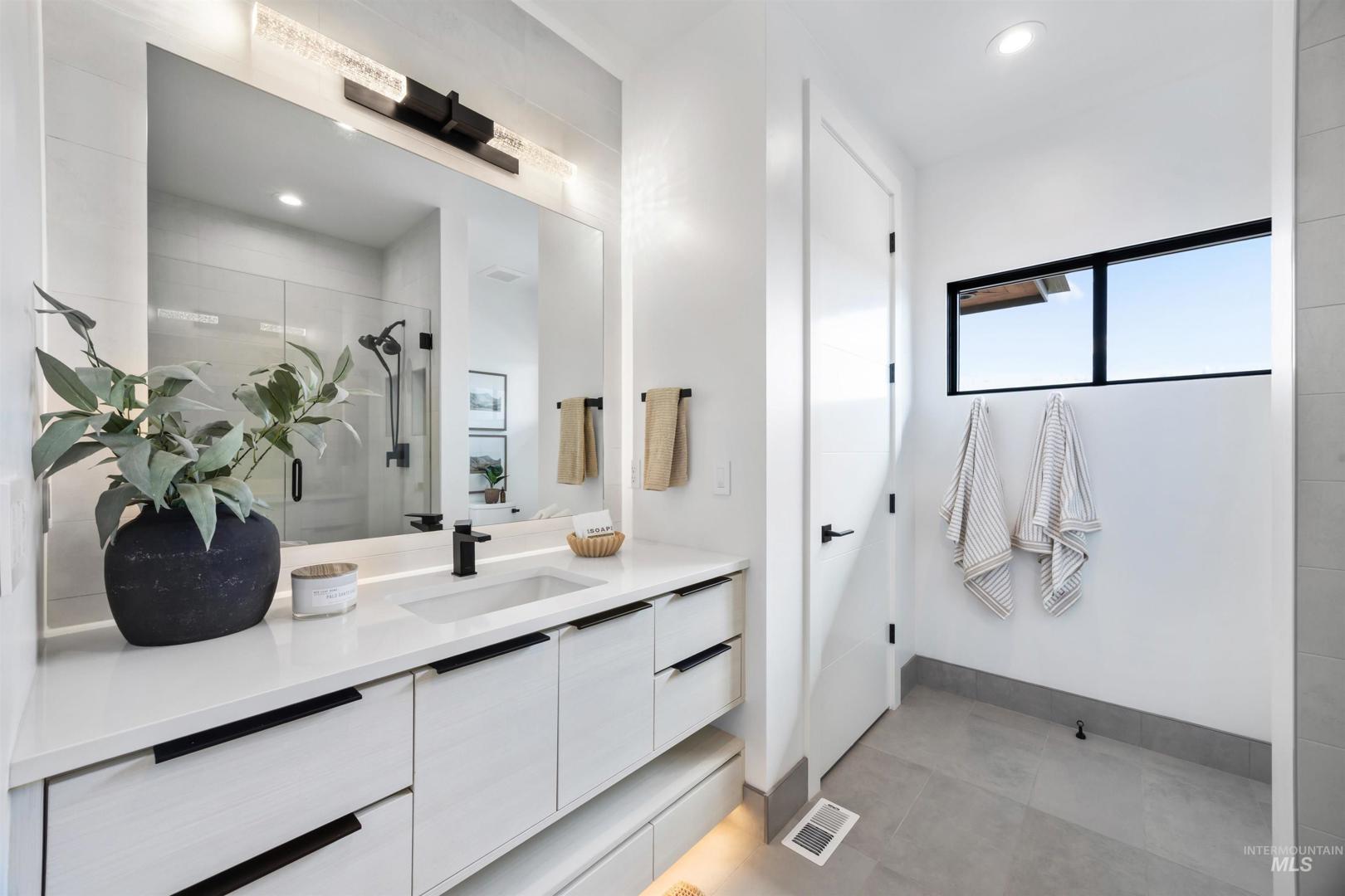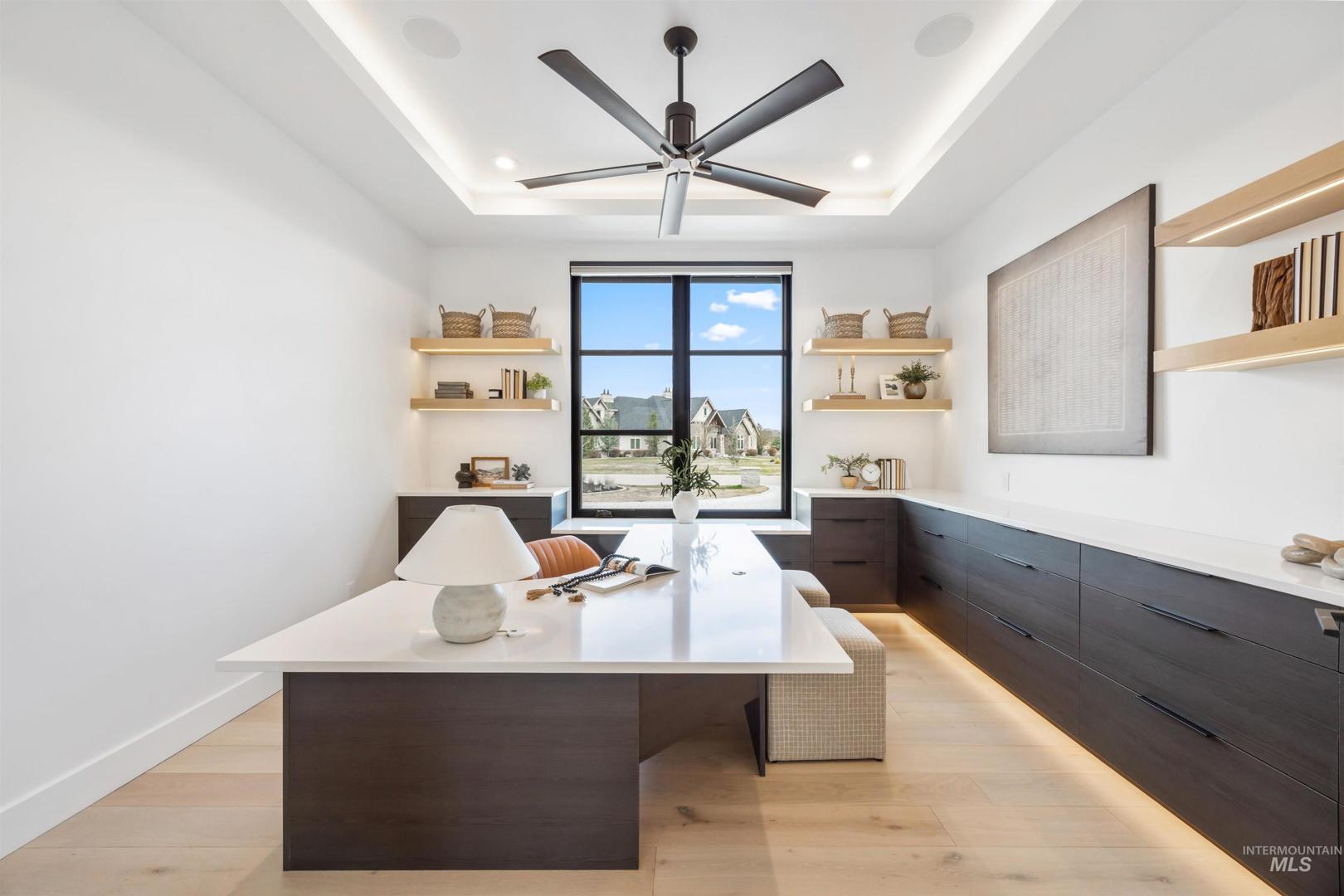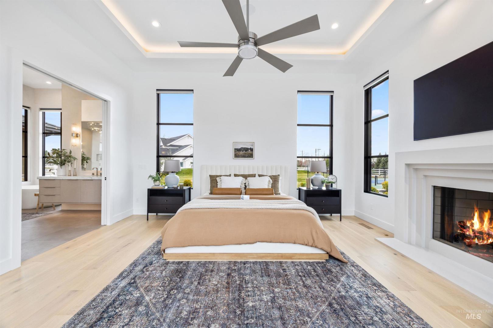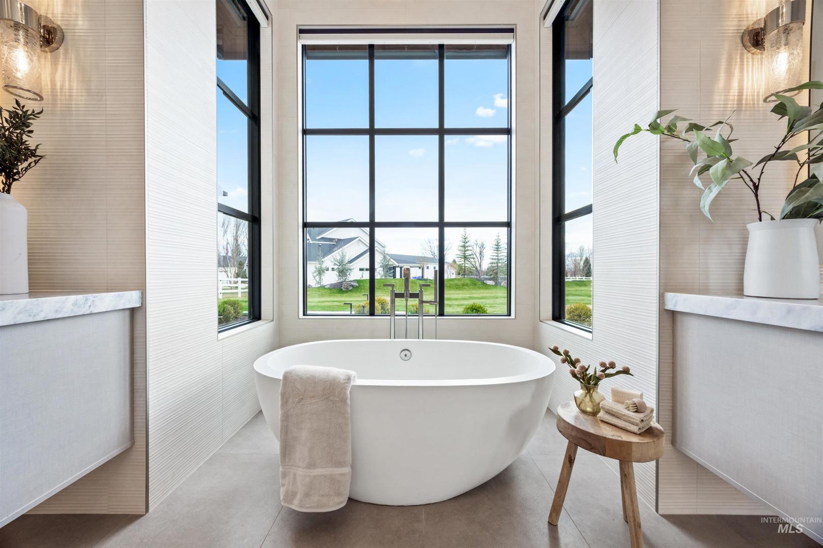 A rare opportunity to own one of Eagle’s most impressive newly built estates. Set on 1.84 private acres, this extraordinary modern home blends clean architectural design with expansive living spaces and resort-style amenities. Dramatic walls of glass and expansive sliding doors flood the home with natural light and frame views of the resort-style grounds, designed to surround the pool for seamless indoor-outdoor living. The chef’s kitchen features quartz countertops, Thermador appliances, custom cabinetry, and a designer butler’s pantry. Thoughtfully designed with a private executive office, spacious game room, and lower-level recreation or bonus space ideal for a gym, media room, or additional living area. The primary suite offers a spa-like retreat with marble countertops, heated floors, and a statement soaking tub. Each bedroom includes its own en suite bath. Resort-style outdoor living includes a pool, spa, pickleball court, in-ground trampoline, and pool house with kitchen, entertaining area, bath, and changing room. A 1,478 sq ft covered outdoor living area extends the home with an outdoor kitchen, heaters, built-in speakers, and automatic screens. Impressive 3,810 sq ft heated garage with double RV bay, custom cabinetry, and car lift. 12,997 sq ft under roof in one of Eagle’s most sought-after settings, offering an exceptional blend of design, privacy, and lifestyle.