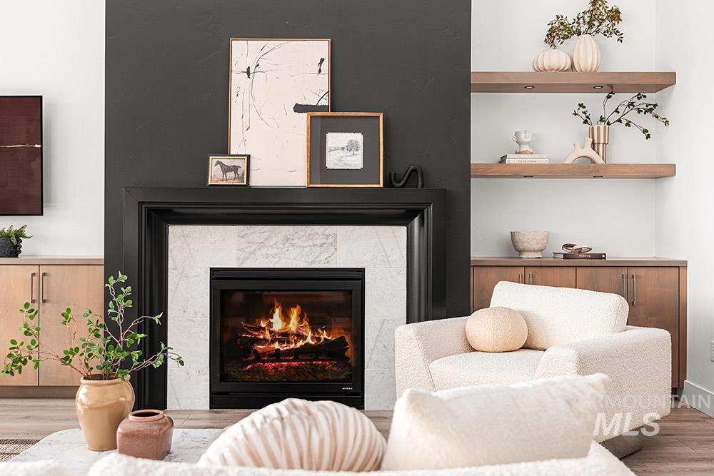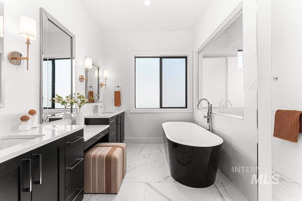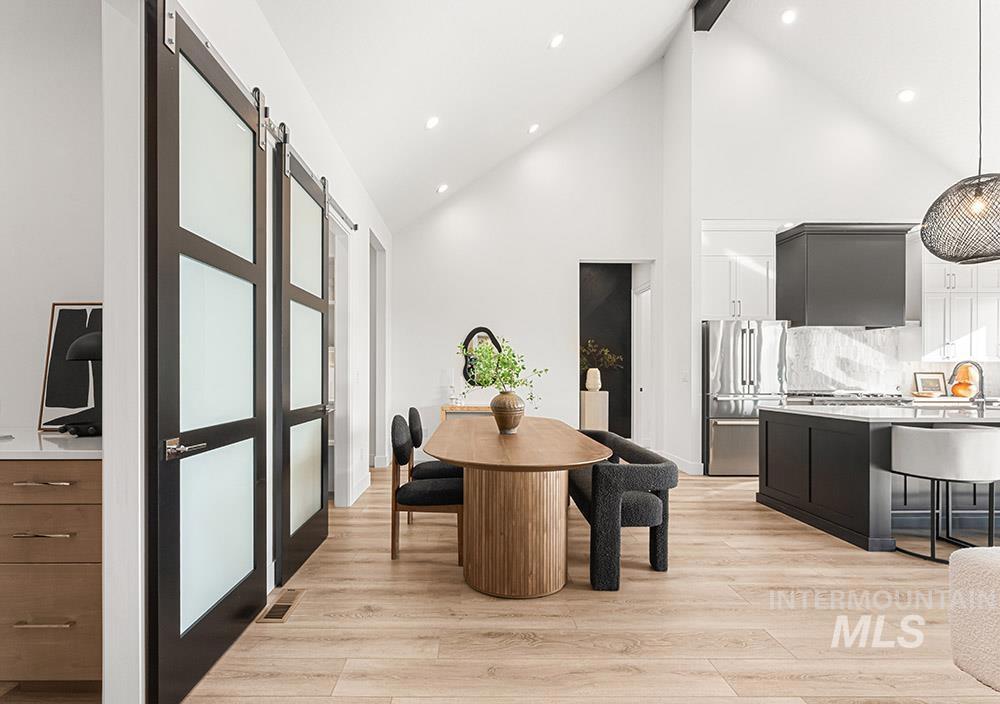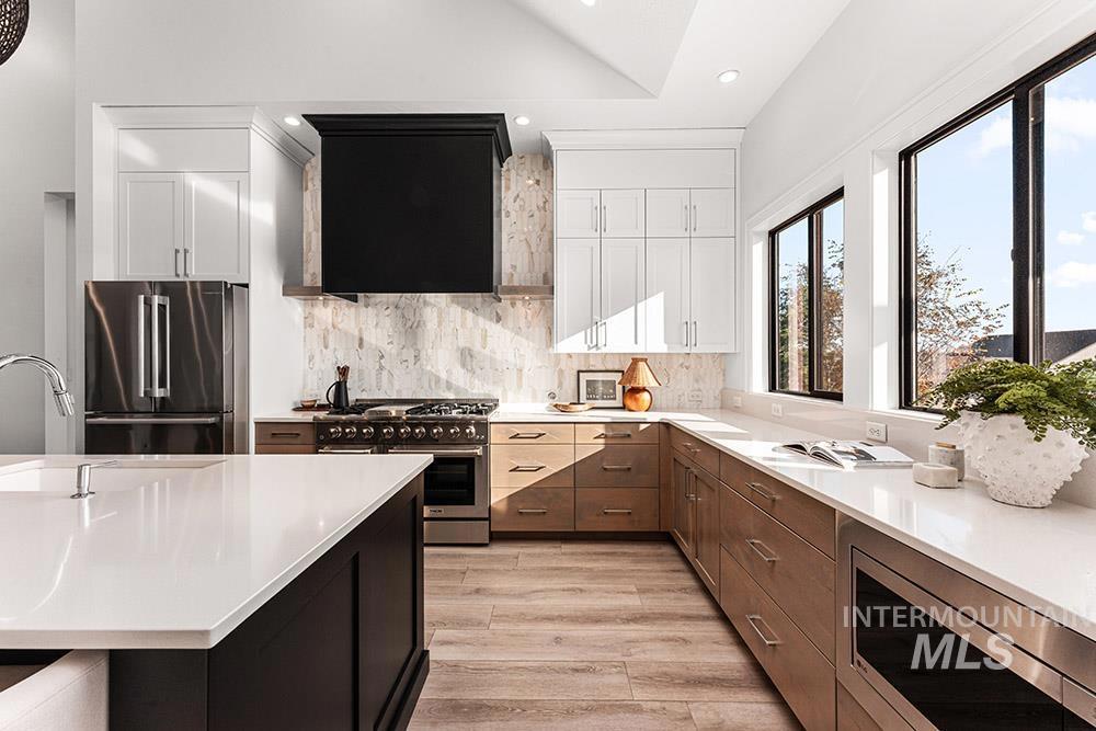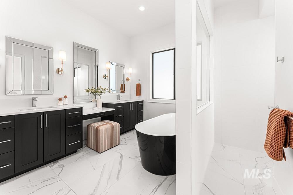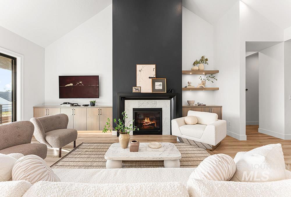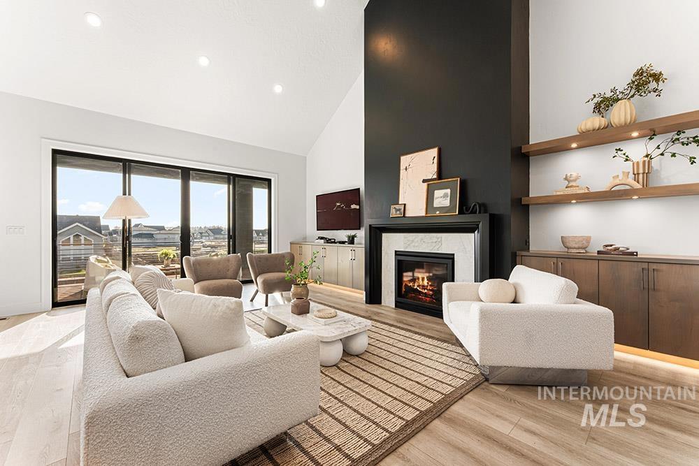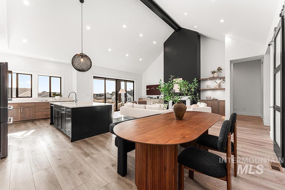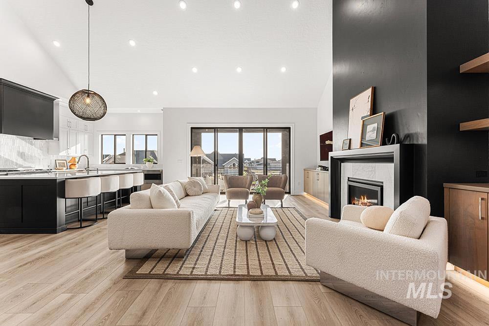 Welcome to this stunning single-level home featuring a massive RV bay, located in the highly desirable Creekwater subdivision. The interior showcases exquisite designer updates, custom wall treatments, and exceptional upgrades throughout. The great room impresses with cathedral-vaulted ceilings accented by exposed beams, a spacious open layout, and beautifully contrasting finishes. A dramatic floor-to-ceiling fireplace anchors the space and opens directly to the expansive outdoor entertaining patio, perfect for gatherings. The gourmet kitchen boasts designer two-toned cabinetry, a full tile backsplash, premier stainless steel appliances, and an expansive walk-in pantry with abundant storage and dedicated appliance countertops. The luxurious primary suite features elegant tray ceilings and a spa-like ensuite bath complete with dual vanities, a freestanding soaking tub, an oversized walk-in shower, and a generous walk-in dressing room. Spacious additional bedrooms provide room for guests, and a private tech office offers the ideal setup for remote work. Enjoy the fabulous Eagle location with access to a community pool and park, just minutes from Eagle Highschool and downtown Eagle shopping and dining!