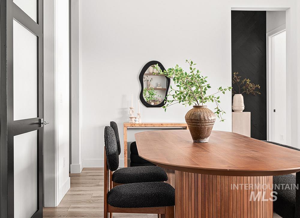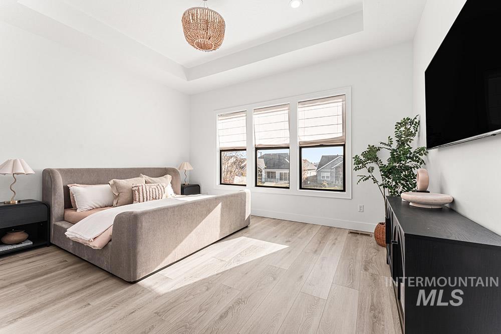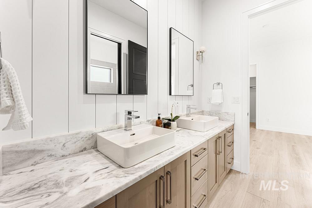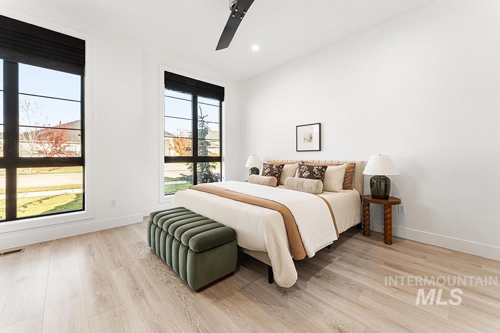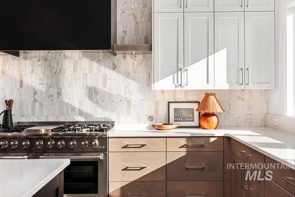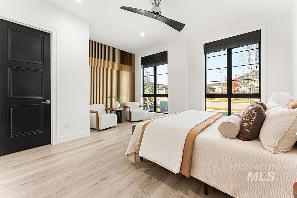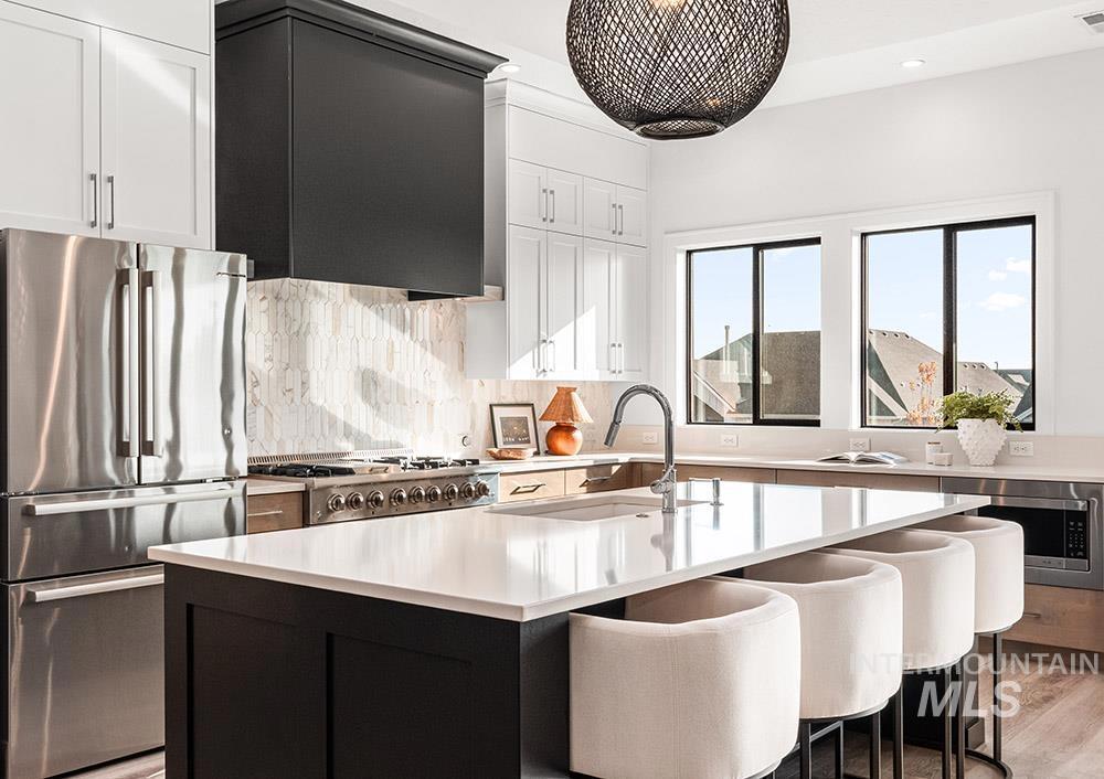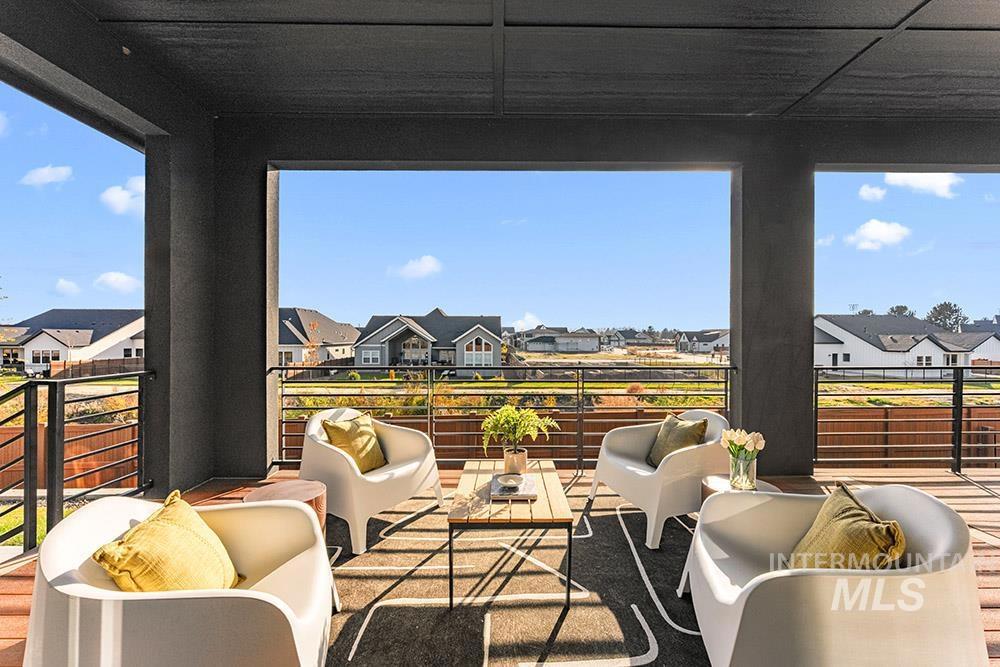 Welcome to this stunning single-level home featuring a massive RV bay, located in the highly desirable Creekwater subdivision. The interior showcases exquisite designer updates, custom wall treatments, and exceptional upgrades throughout. The great room impresses with cathedral-vaulted ceilings accented by exposed beams, a spacious open layout, and beautifully contrasting finishes. A dramatic floor-to-ceiling fireplace anchors the space and opens directly to the expansive outdoor entertaining patio, perfect for gatherings. The gourmet kitchen boasts designer two-toned cabinetry, a full tile backsplash, premier stainless steel appliances, and an expansive walk-in pantry with abundant storage and dedicated appliance countertops. The luxurious primary suite features elegant tray ceilings and a spa-like ensuite bath complete with dual vanities, a freestanding soaking tub, an oversized walk-in shower, and a generous walk-in dressing room. Spacious additional bedrooms provide room for guests, and a private tech office offers the ideal setup for remote work. Enjoy the fabulous Eagle location with access to a community pool and park, just minutes from Eagle Highschool and downtown Eagle shopping and dining!