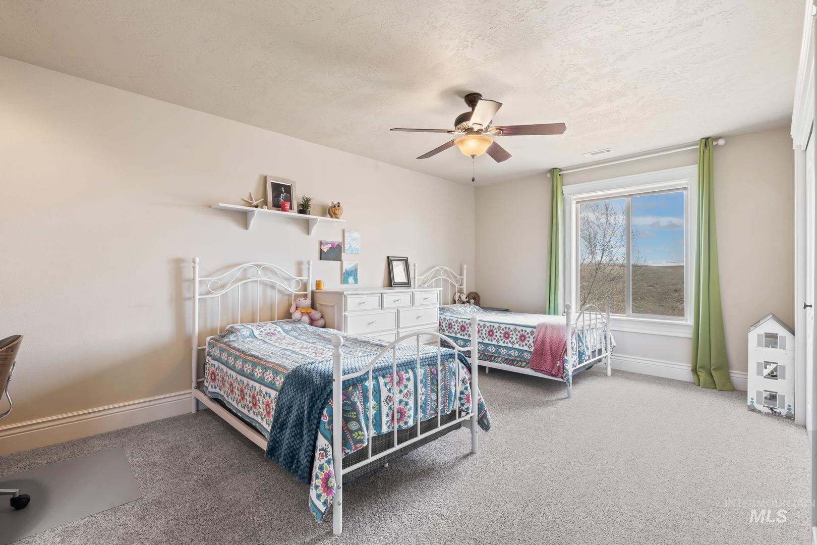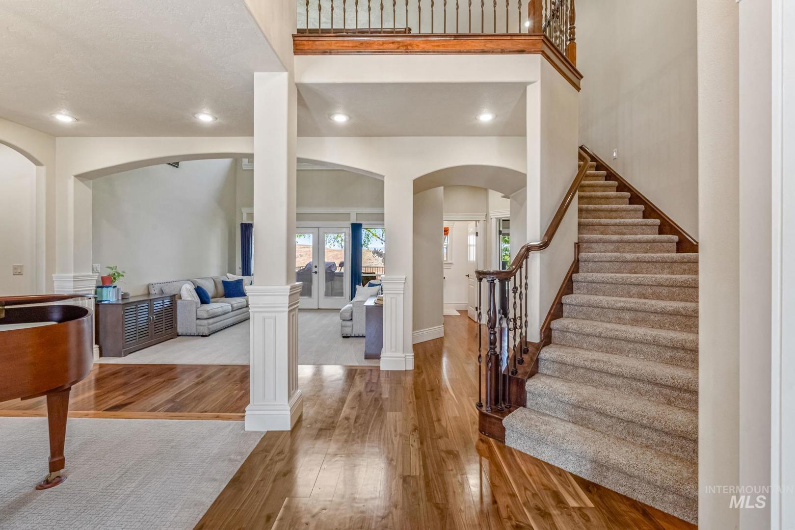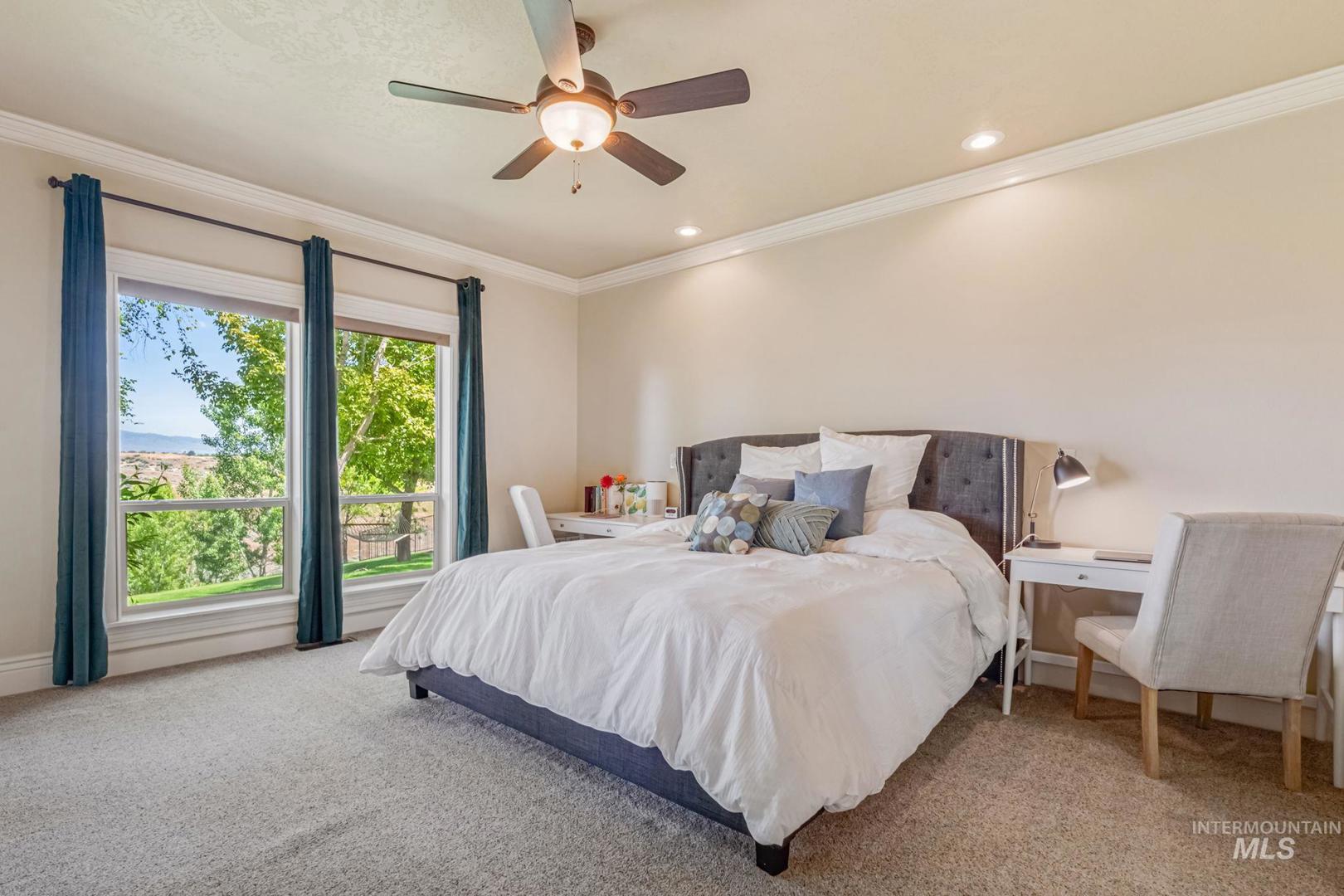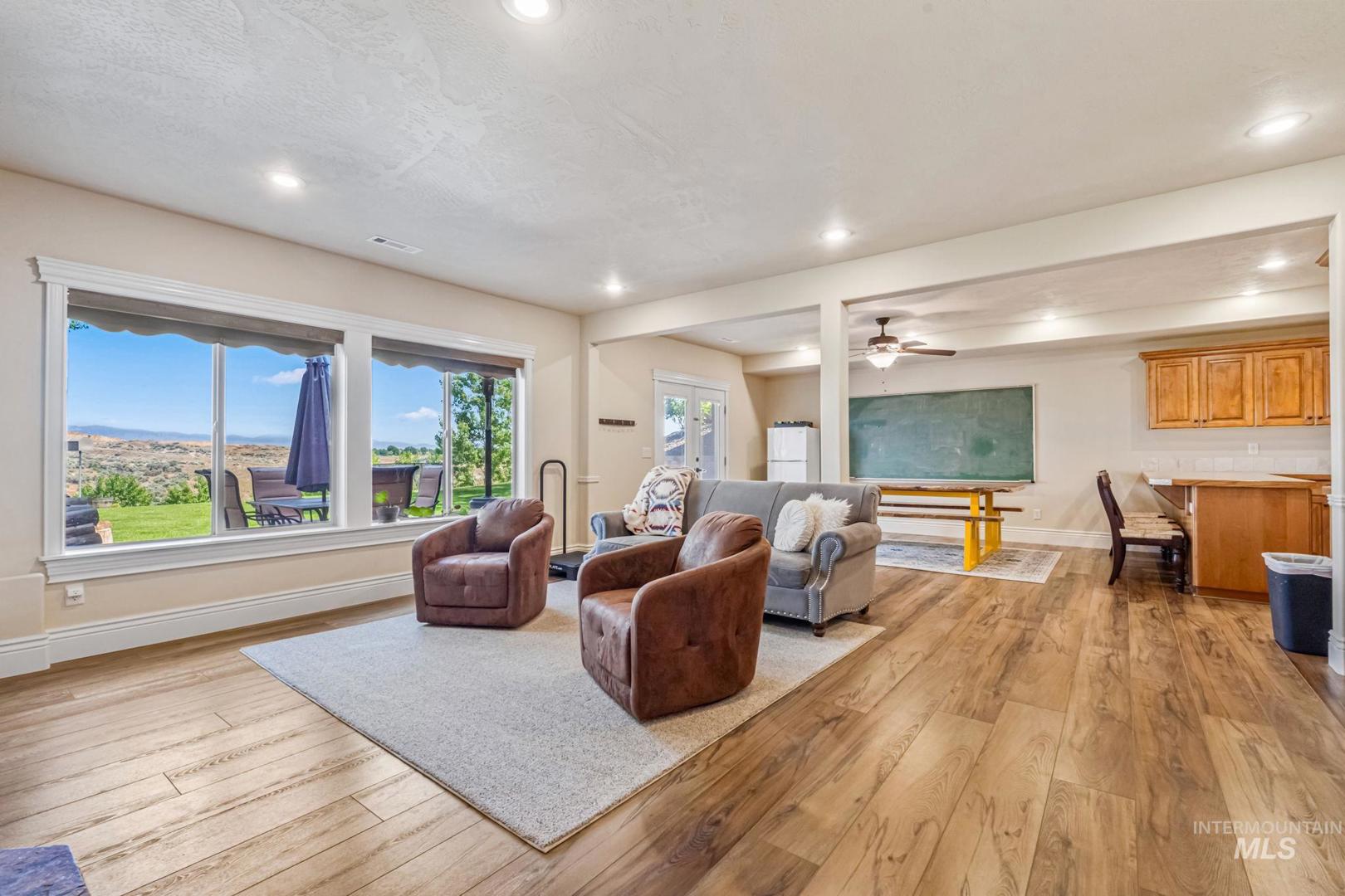 Pristine acreage home on quiet culdesac in Hillsdale Estates. Breathtaking 360 degree views of Bogus Basin, the Owyhees & beautiful Idaho skies. Bordered by designated open areas & BLM access for adventures, the home features a grand entrance, owner’s suite, large bedrooms, private office, gourmet kitchen with double ovens & sinks, large pantry, & gas range w/bonus room upstairs and rec room down! Daylight basement with large wet bar, wired theater room (currently a home gym), storage rooms, wood burning stove, and hot tub hookups on patio. RV Garage with lawn-tool-access garage door on back + oversized 3-car garage. Garden beds with spigots and large garden area, greenhouse, fruit trees, two sheds. Circular terrace for trampoline or fire pit and large grass sledding hill and sports field. New roof (2021); New exterior paint (2022); New septic & drainfield (2022). Community offers walking paths, ponds, manicured grass field, & an equestrian center. Monthly HOA fee includes water. Buyer/agent to verify all information.