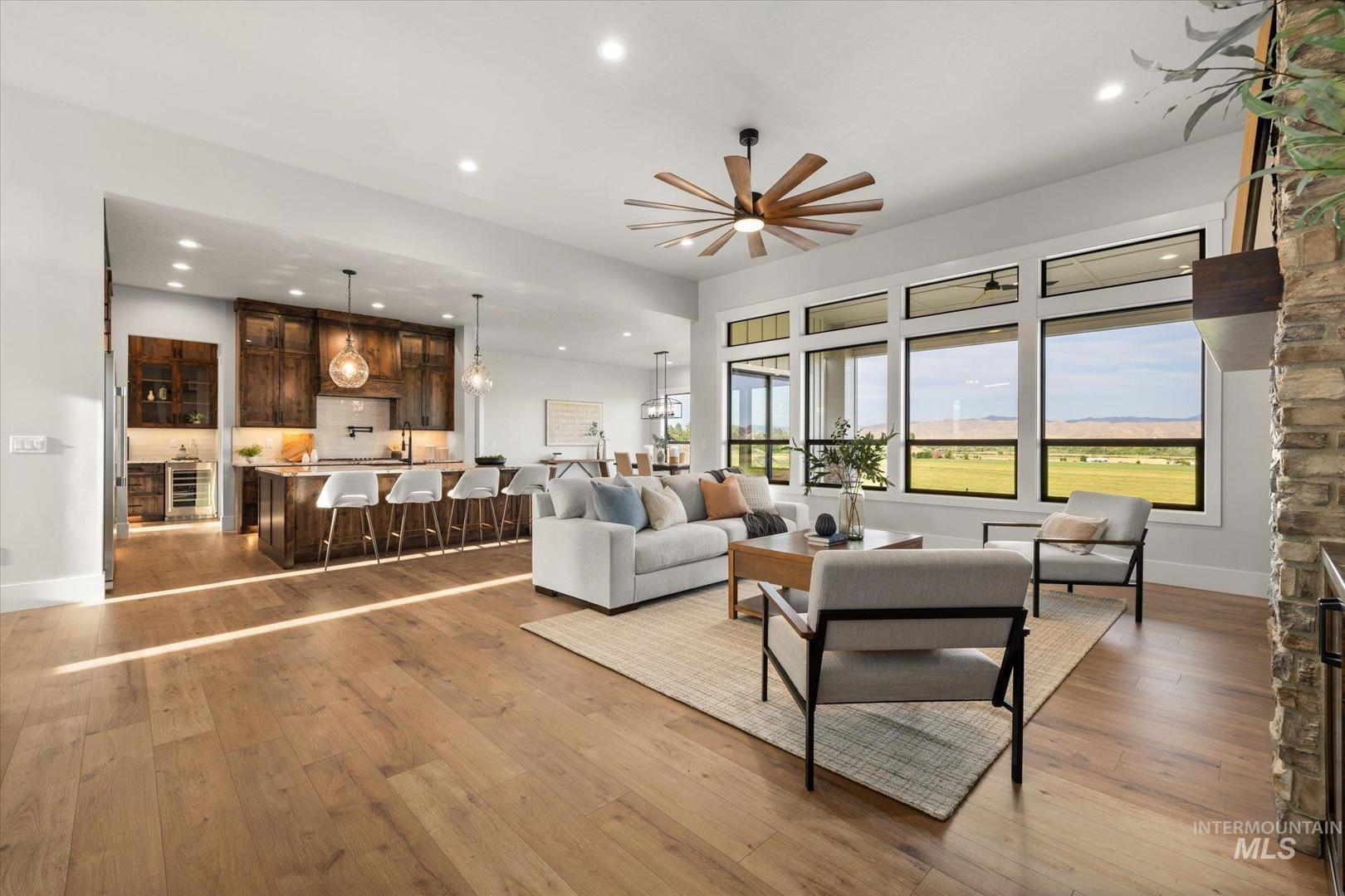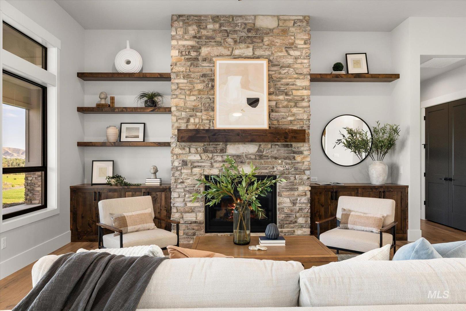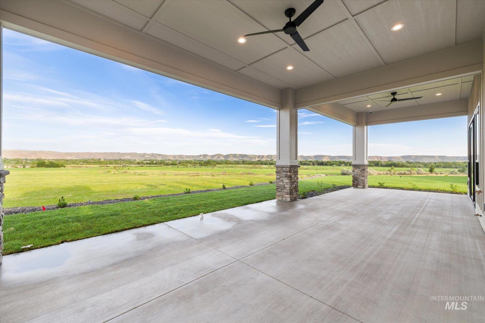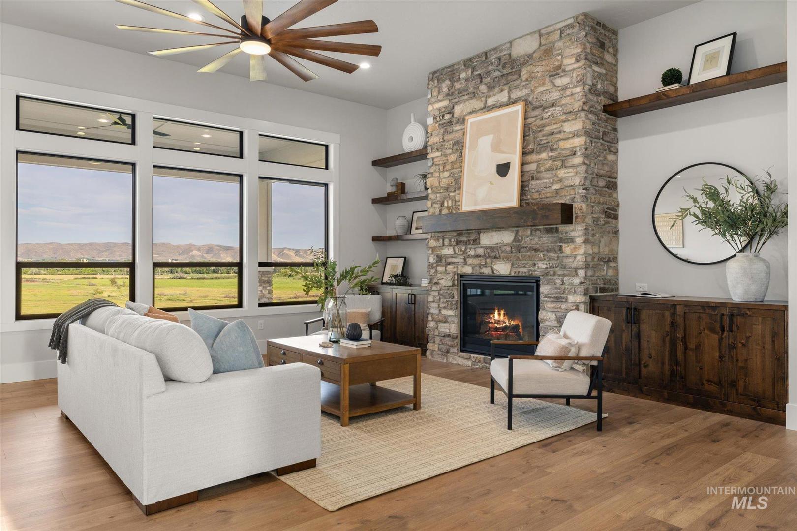 New construction perched on a bluff, surrounded by farmland w/ expansive mountain & valley views. 4-bedroom, 2.5-bath, 2,950 sqft single-level home blends quality craftsmanship w/ modern design. The gourmet kitchen features high-end built-in appliances, quartz countertops, a large center island, modern tile backsplash, walk-in pantry, & custom cabinetry. The split-bedroom floorplan offers privacy & function, w/ a luxurious primary suite including a spa-like bath, walk-in shower, dual vanities, & an oversized walk-in closet. On the opposite side of the home are two bedrooms & a private office that can serve as a fourth bedroom. LVP flooring runs throughout the kitchen, living, office, foyer and primary bedroom. Tons of natural light, this home includes soaring ceilings, a gas fireplace w/ floor-to-ceiling stone, a wall of windows w/ 8-ft doors, built-in shelving, & a extra-large slider leading to a covered patio & private, southeast-facing backyard. This parcel also includes an additional 0.657 acre lot labeled "Lot 5 Common Area" shown on the plat under DOC Tab. Check out the Amenity List under the DOC tab for selections and finishes. PLEASE GO SLOW ON GRAVEL ROAD - 5MPH - Watch for Neighborhood Kids and Pets Please. Agent related to Seller. BTVAI