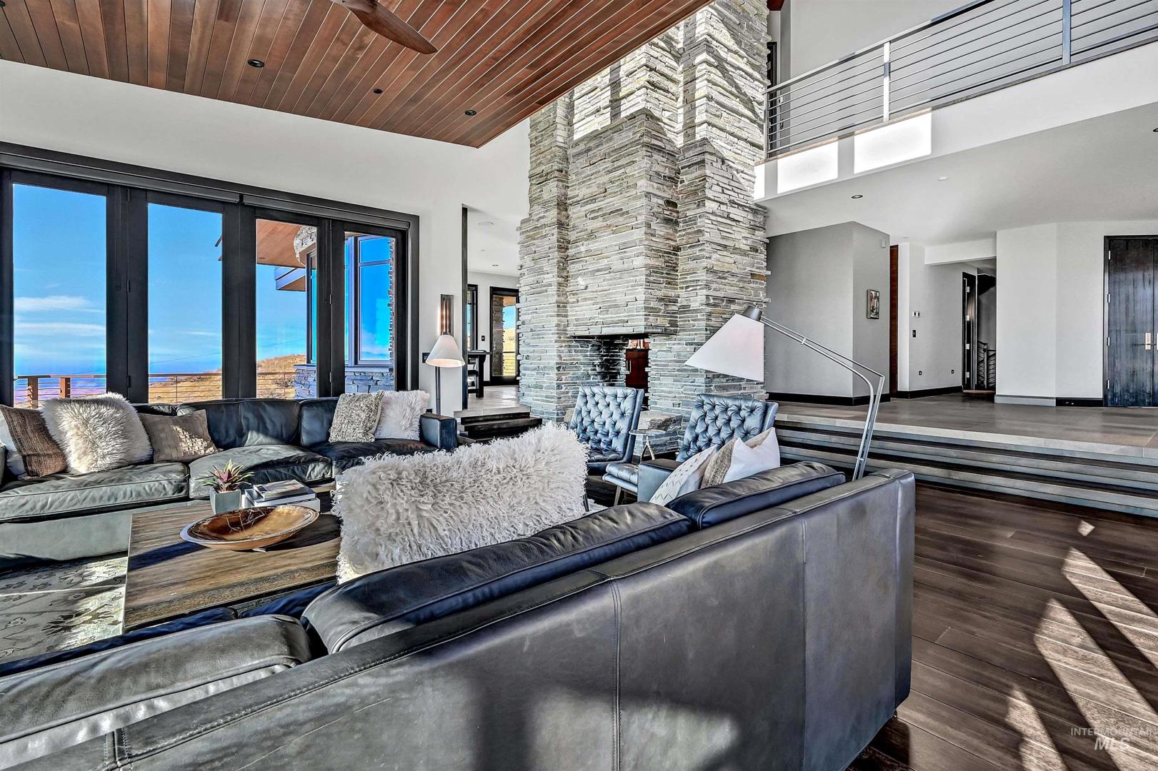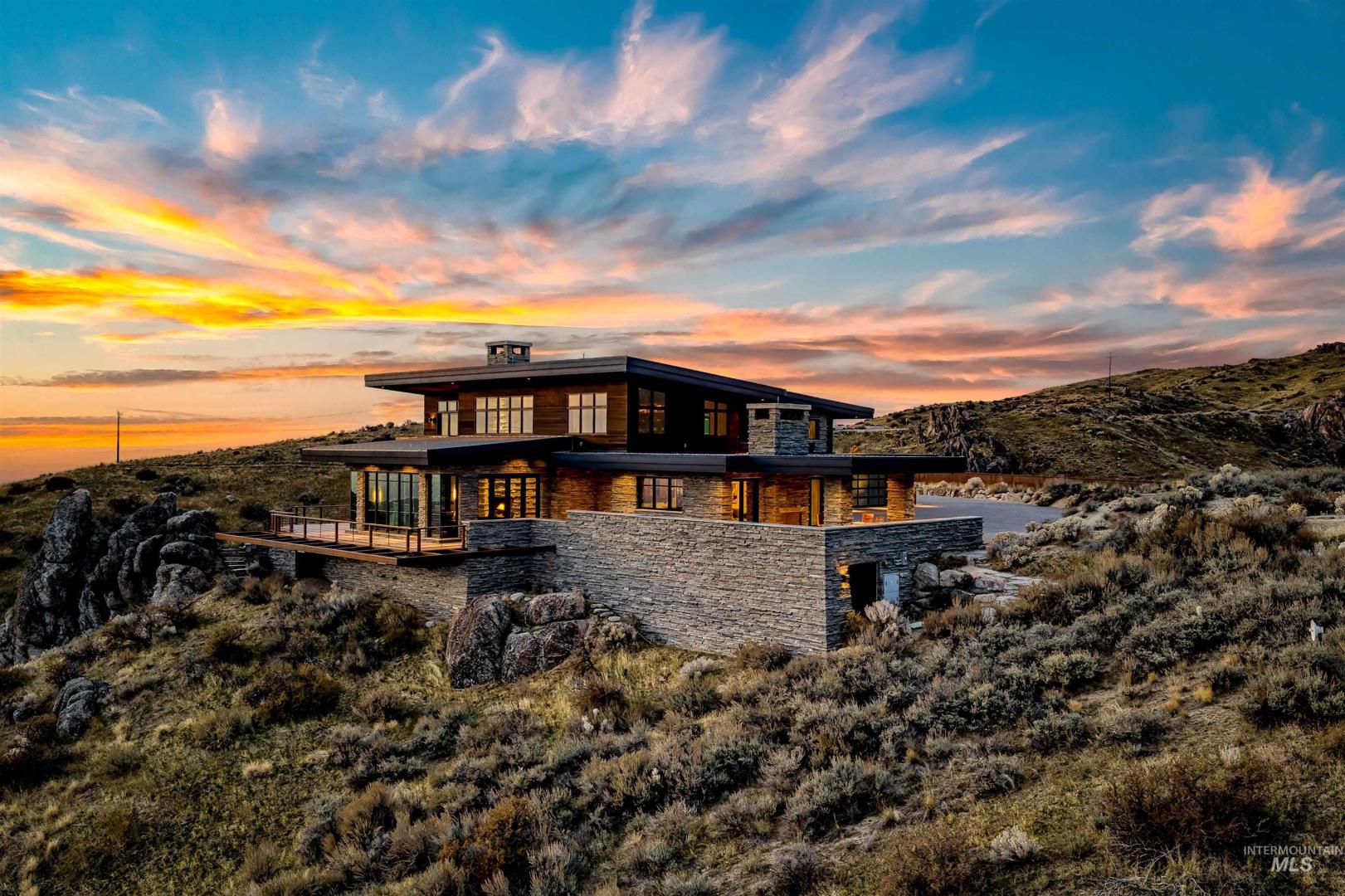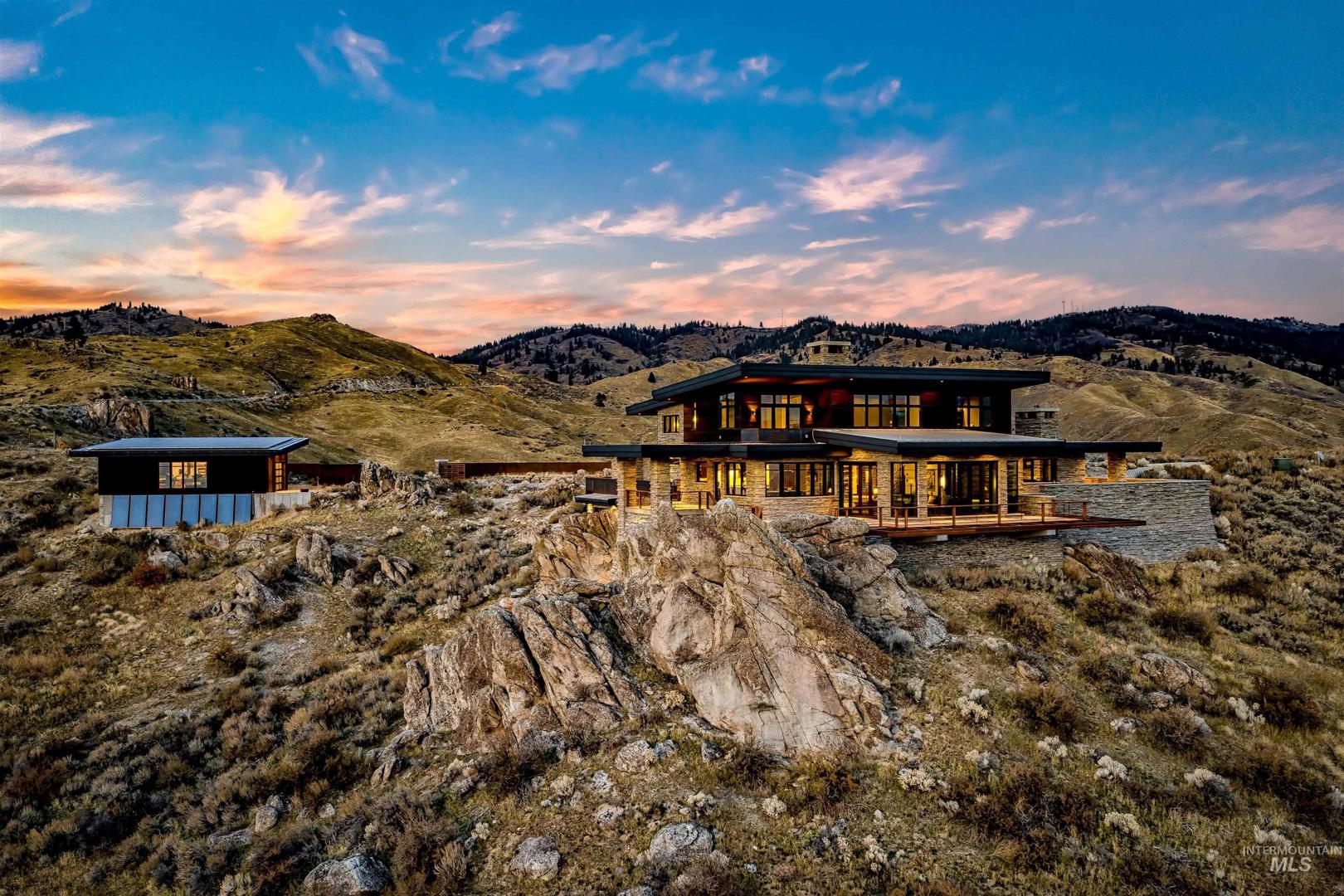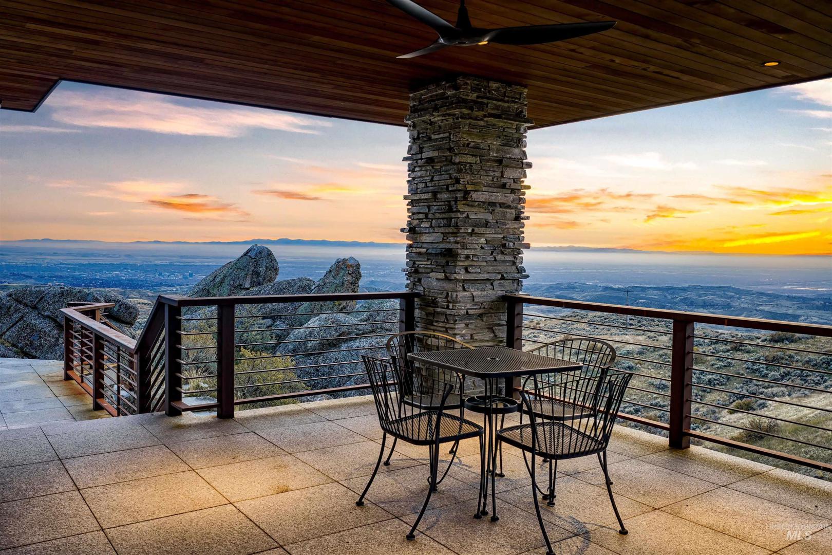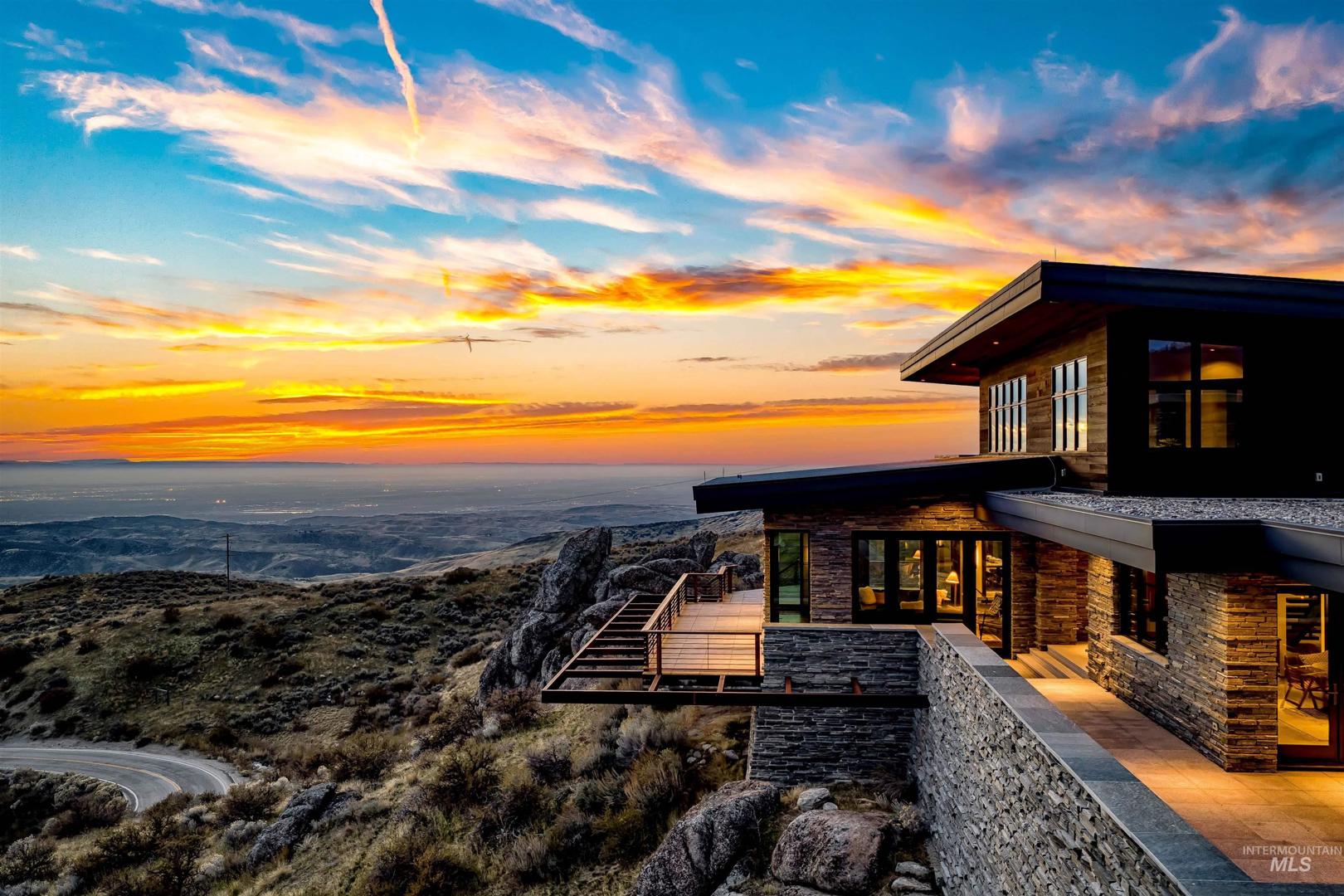 Welcome to The Overlook—where bold design meets the rugged beauty of Idaho. Nestled among massive boulders, this architectural gem commands sweeping views of Boise and the entire Treasure Valley. A dramatic two-story fireplace takes center stage, setting the tone for this one of a kind retreat. Set on 4.72 acres with low-maintenance landscaping, the home offers 4 bedrooms, 5.5 bathrooms, an executive office, a chef’s kitchen, ensuite bedrooms and over 7,000 square feet of meticulously crafted living space. Retractable glass walls in the living room offer seamless flow to the outdoor patios. Head to the lower level to discover your private home theater and fully equipped gym, perfect for unwinding or staying sharp. The detached shop provides additional vehicle storage and could easily be an ADU. Built without compromise, this home blends luxury and functionality seamlessly. Downtown Boise’s vibrant dining and entertainment is just 20 minutes away while outdoor enthusiasts will love the close proximity to Bogus Basin Ski Resort along with the Ridge to Rivers Trail System.