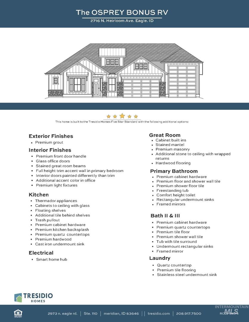 Tresidio Homes presents: The Osprey Bonus RV! 2685sq/ft of exquisite design seamlessly blended with modern functionality. This meticulously crafted home boasts 3 bedrooms and 3 bathrooms PLUS office and Bonus room. The gourmet kitchen is a chef`s dream, featuring THERMADOR stainless steel appliances that beautifully complement the stunning quartz countertops. Rich hardwood flooring and a showcase fireplace can be found in the great room. A versatile office/den offers a creative workspace, while an upstairs bonus room provides endless possibilities for entertainment and leisure. Step outside to the covered backyard patio, an ideal outdoor haven for relaxation and gatherings. The almost 1200 sq/ft 4-car garage is complete with a 12’9”x44’ RV BAY, and can store your largest toys. Stags Crossing is located 1/2 mile to HWY 16, Close to Costco & downtown Eagle. *Photos are of actual home*Call LA for more info