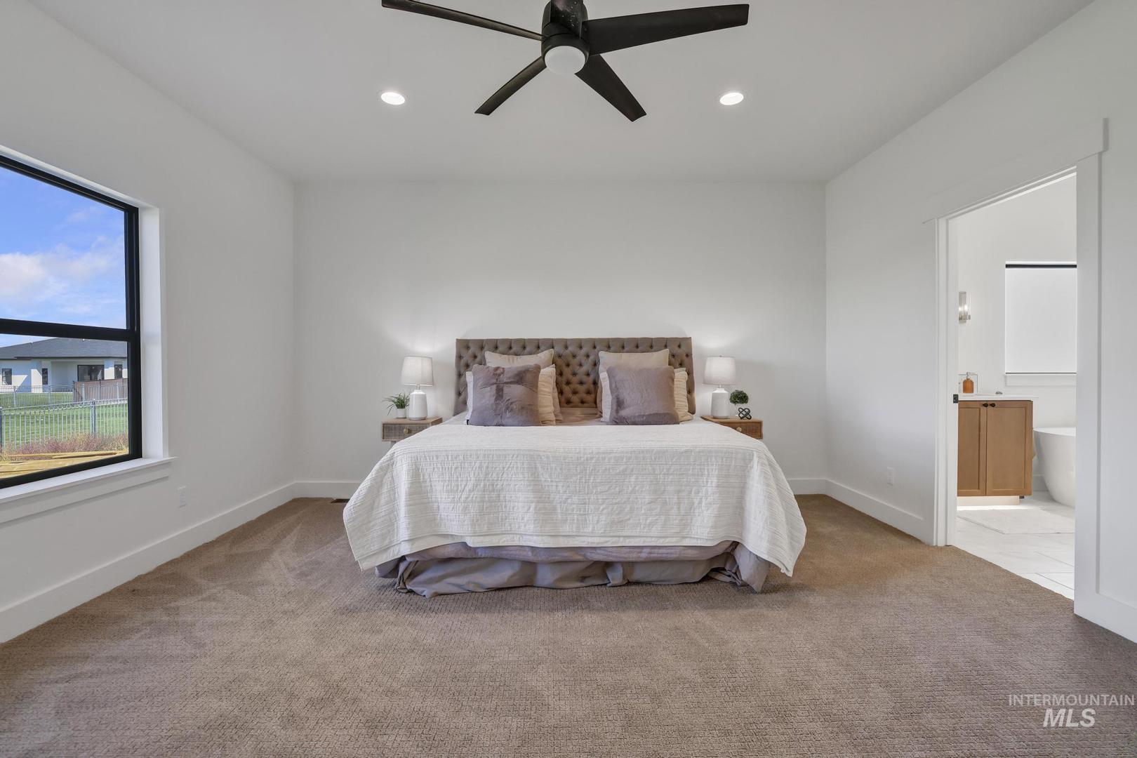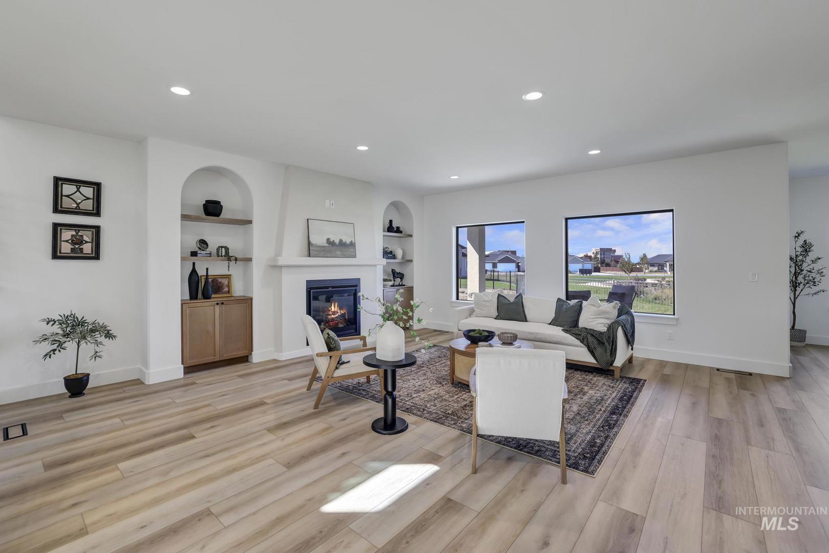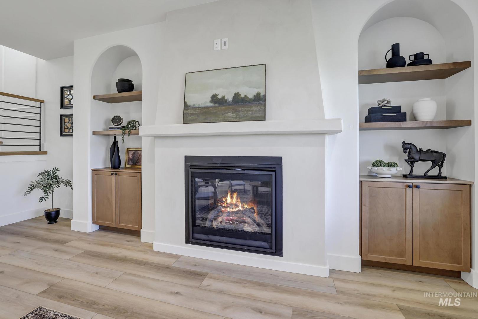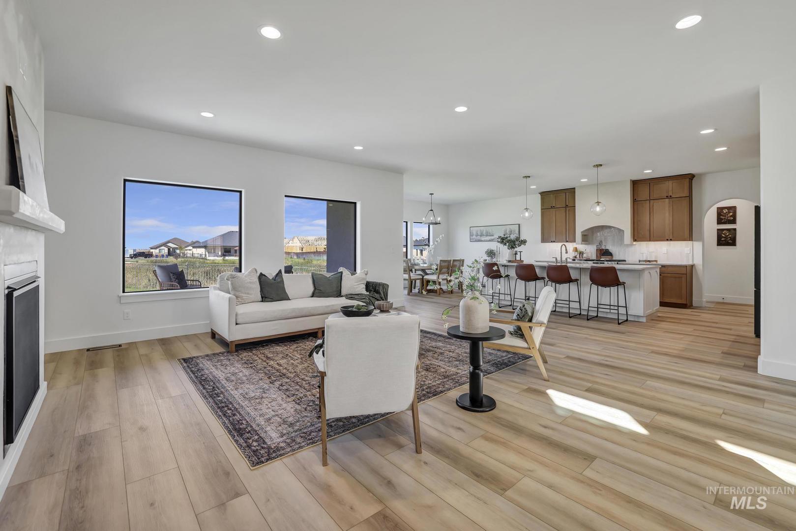 Welcome to this stunning brand-new two-story home featuring 5 bedrooms, 3.5 baths, an office, and endless custom details. Perfectly positioned along a gated pond with ducks and direct access to the Snake River Canyon walking trail. Every bedroom features a walk-in closet! The main floor offers a custom kitchen with Taj Mahal quartzite countertops, a Venetian plaster fireplace, beautiful custom arches with built-ins, a white oak staircase, a great room, and a laundry room connected to the master closet. Upstairs you’ll find 4 bedrooms, 2 full baths—including a Jack-and-Jill—and a spacious family room, plus a second laundry room. The master suite includes a walk-in tile shower and dual vanities. Enjoy summer evenings on the covered patio overlooking the water. A 3-car garage and top-tier finishes complete the home. The HOA plans to offer pools, pickleball courts, and a community clubhouse.