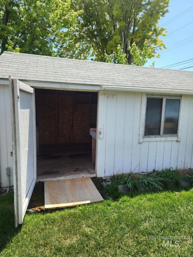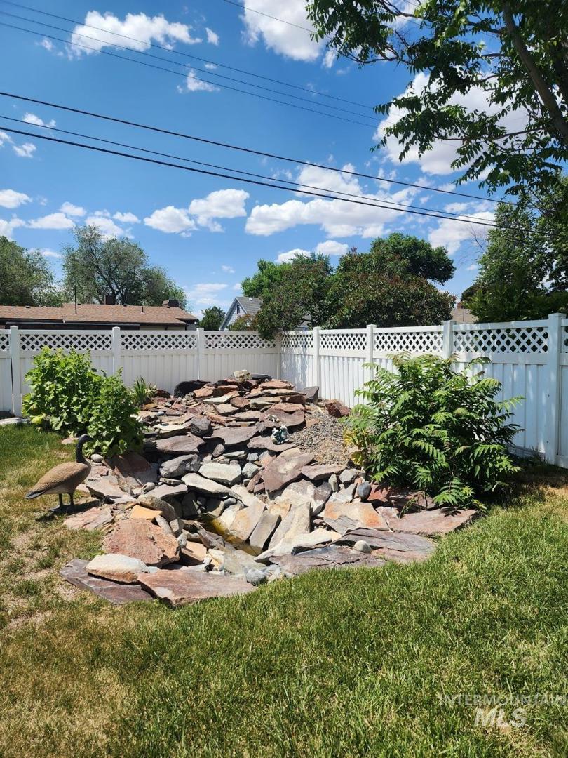 Charming home on spacious double lot in the heart of Mountain Home that is ideally located near schools, parks, and shopping centers. This unique home sits on a very quiet well-maintained street with mature shade trees. This home features an updated kitchen, countertops, cabinets, flooring and tile showers. This home has original hardwood flooring in upstairs main living room, hallway, and bedrooms. Beautiful brick gas fireplaces on both levels of the home. Fantastic large, enclosed bonus/sunroom with wood fireplace, exceptional storage both inside and out, two small shops with electricity, alley access, beautiful pond and landscaping. This property has a separate shallow well with a pump for irrigation. There is a completely separate living quarters downstair with its own access consisting of a living room, kitchen, bedroom and bathroom.