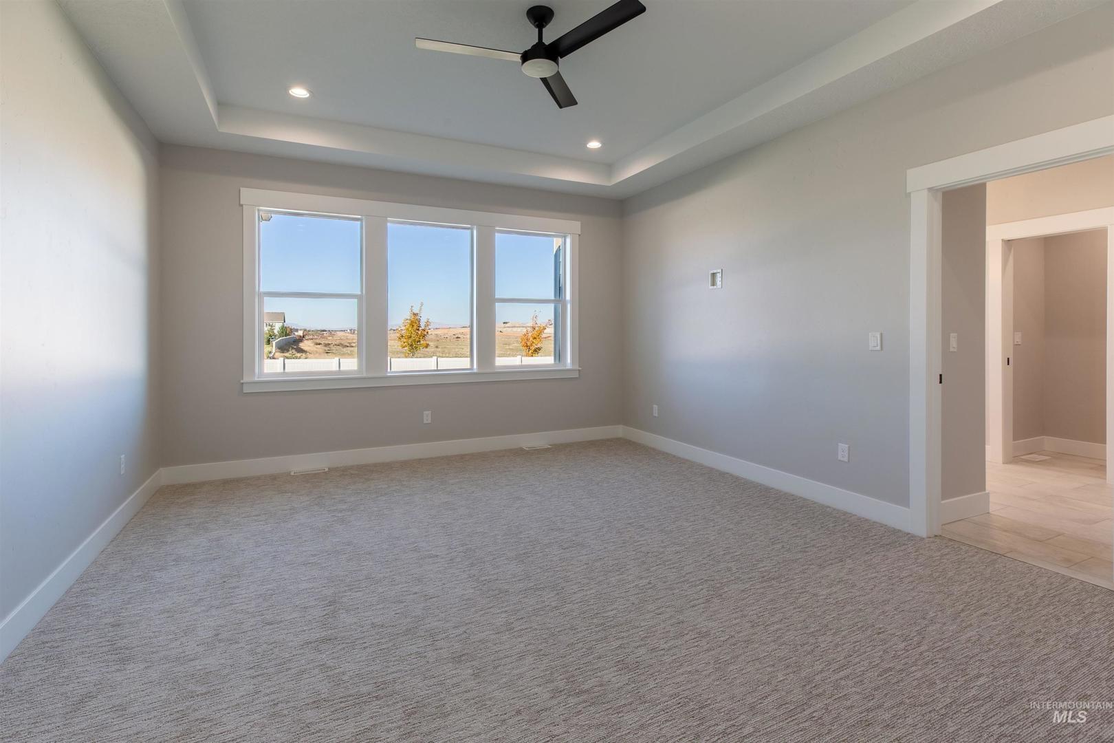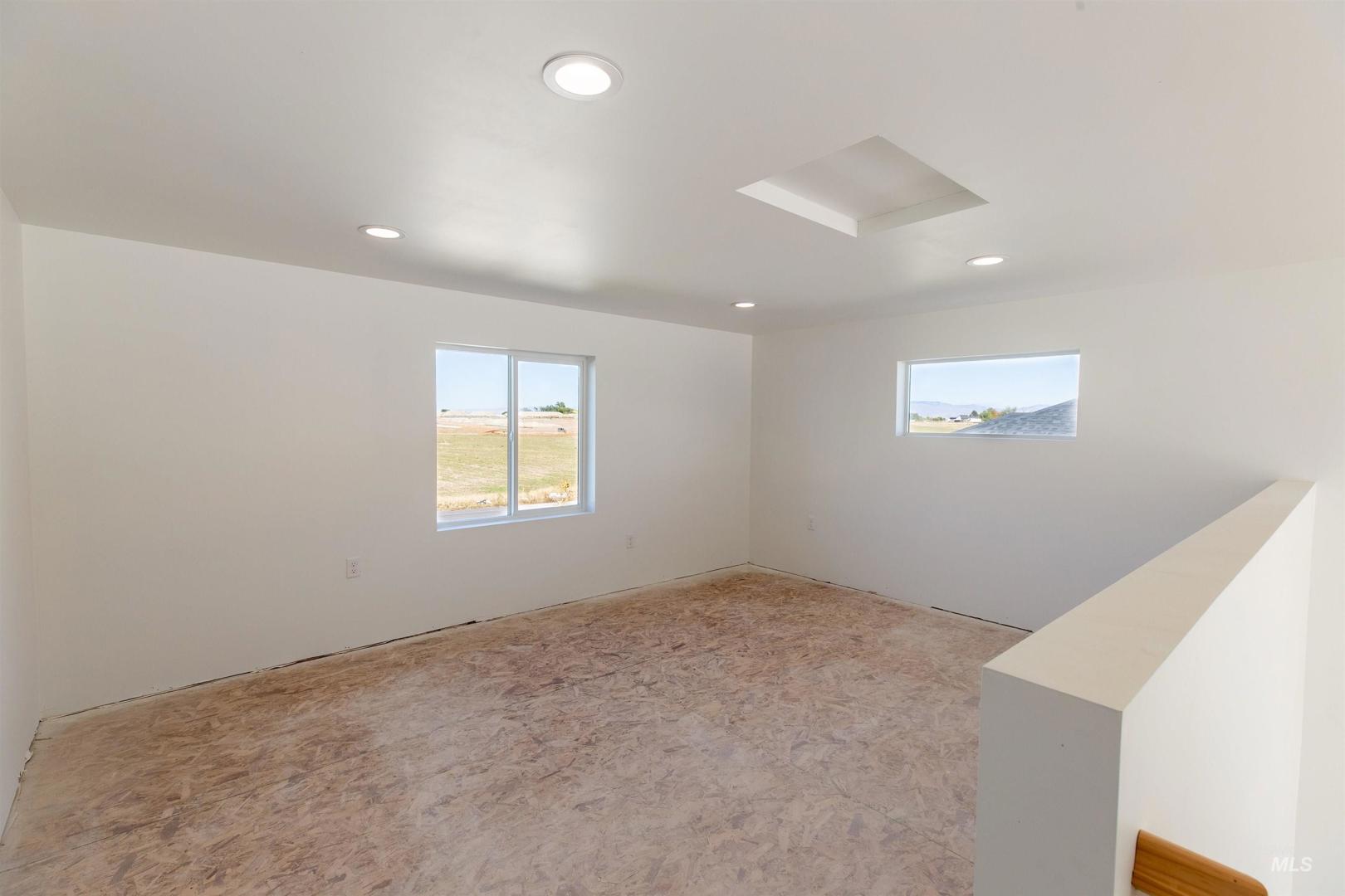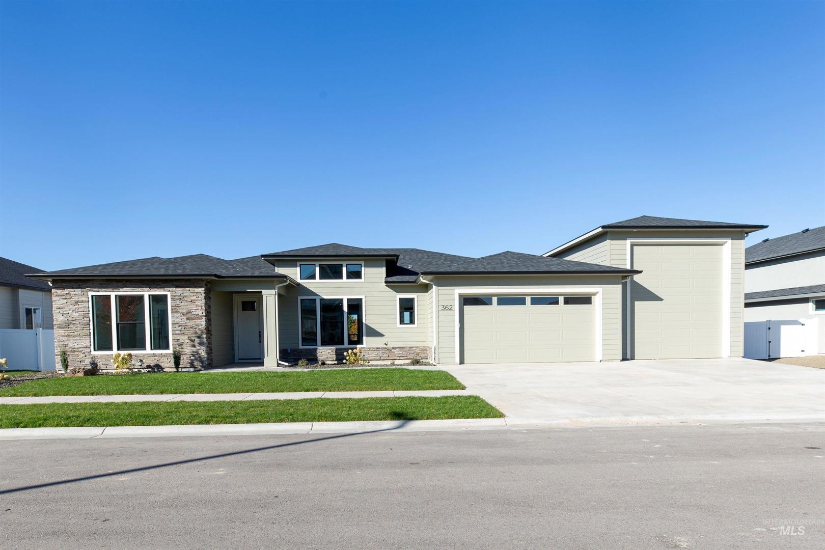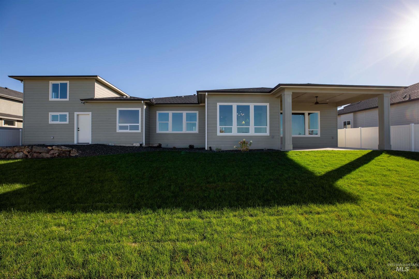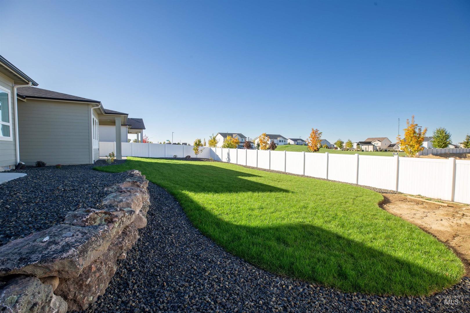 Awesome Jump Creek plan by Rugged Terrain Homes. This split bedroom plan boasts a beautiful primary retreat with a massive walk-in closet, his and hers vanities with tasteful colors and hard surfaces/quartz/tile throughout including the laundry room. Floor to ceiling custom kitchen cabinets with soft close drawers, undermount lighting and butler`s pantry. Living room features coffered ceiling and cozy fireplace flanked by built ins. Secondary bedrooms share a Jack & Jill full bath. Flex/media room w/insulated sound walls for tons of possibilities. Halo can lighting in Primary and Living Rm. AMAZING finished RV garage with fully insulated and separate tool room with own heater & circuit (plus pre-plumbed for sink), 4` LED lighting and tankless water heater. Garage loft has data wiring and views of the mountains. 36ft RV Garage w/work area, multiple circuits including 50Amp plug. Main portion of garage pre-plumbed & vented for gas heater. Good sized covered back patio, space for garden with separate sprinkler zone. New subdivision Shafer View Terrace-complete with tot play lot, pickleball court and picnic gazebo) along with views toward the foothills.