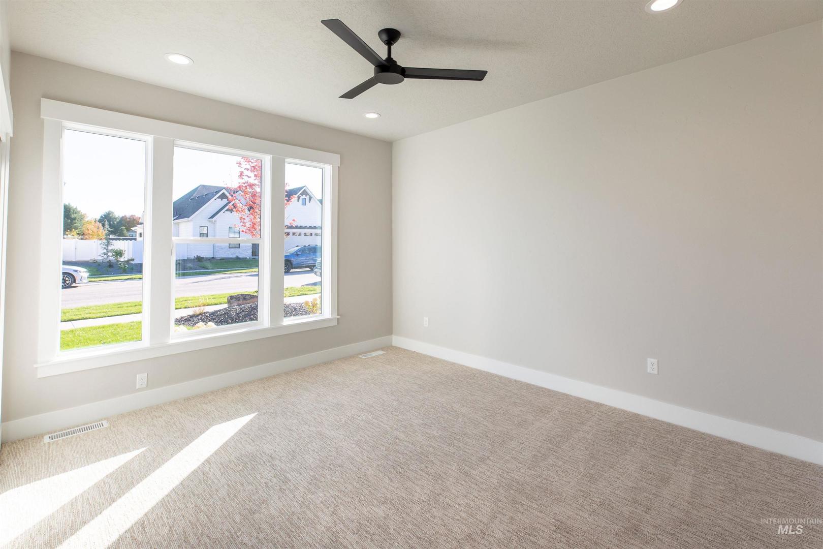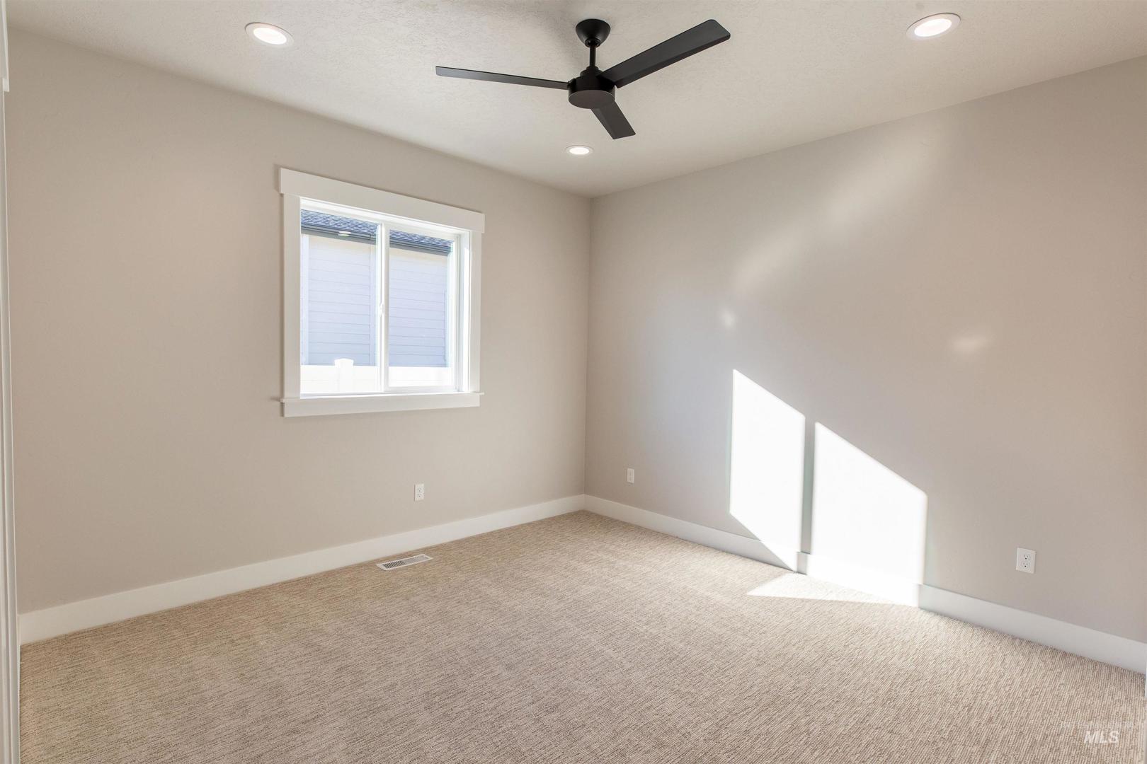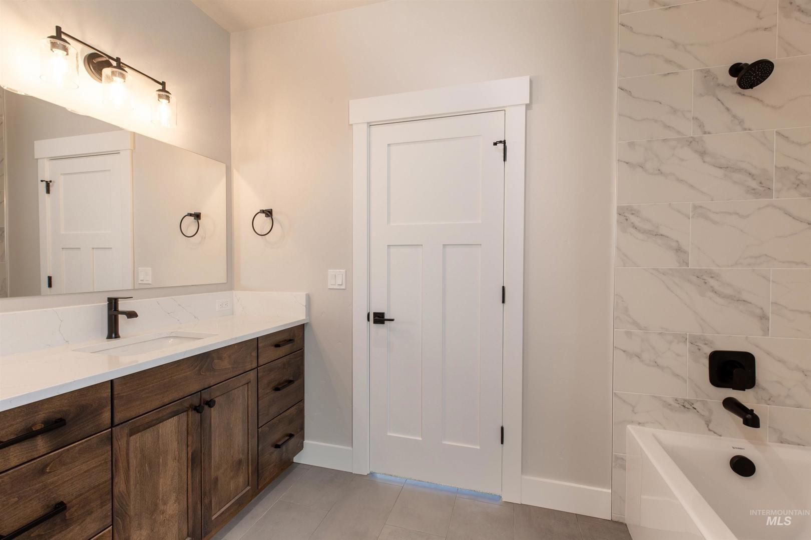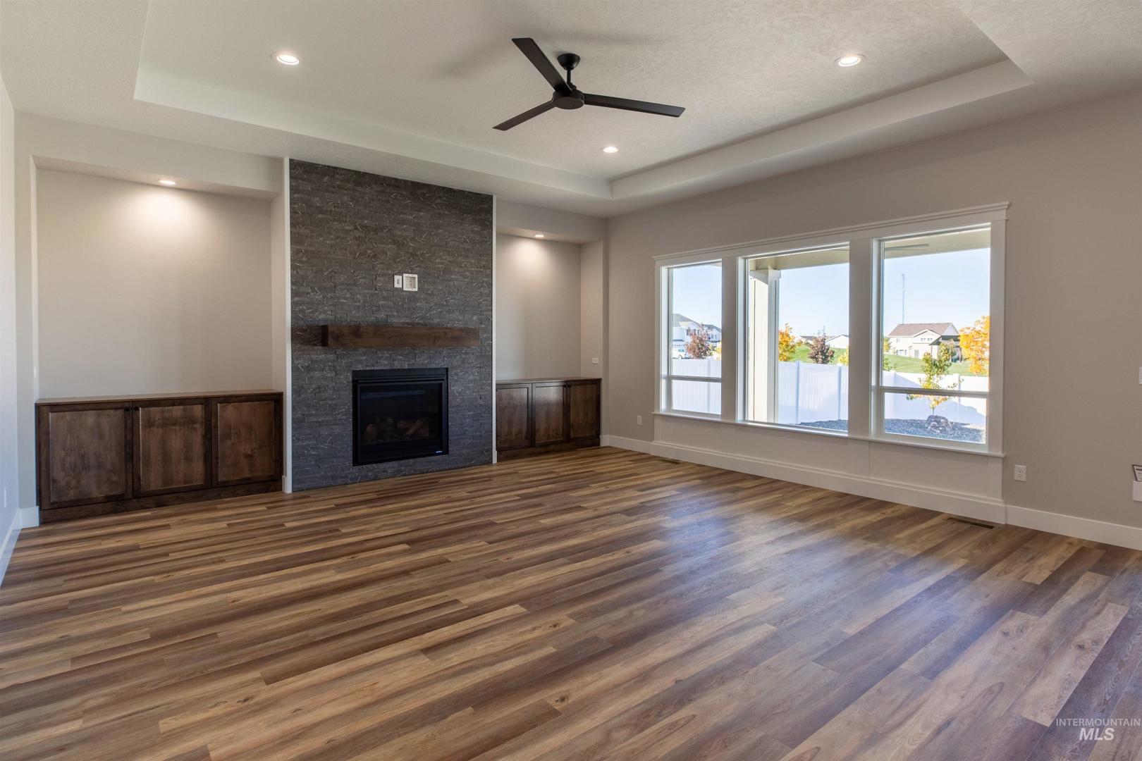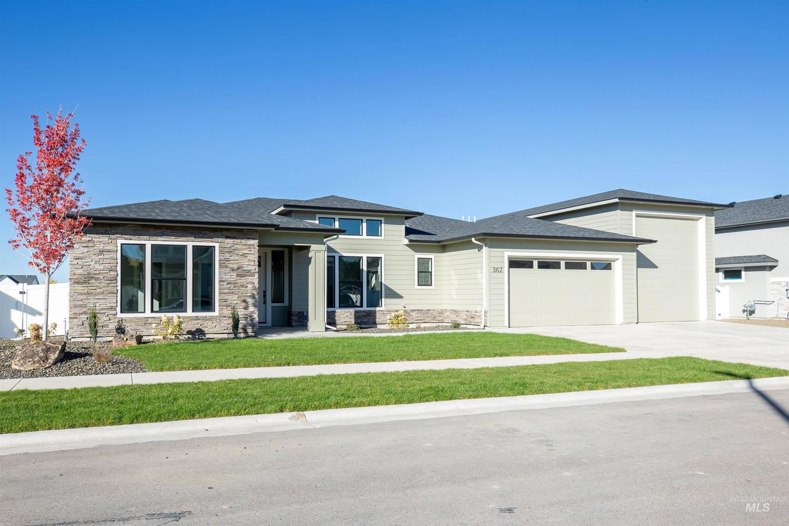 Awesome Jump Creek plan by Rugged Terrain Homes. This split bedroom plan boasts a beautiful primary retreat with a massive walk-in closet, his and hers vanities with tasteful colors and hard surfaces/quartz/tile throughout including the laundry room. Floor to ceiling custom kitchen cabinets with soft close drawers, undermount lighting and butler`s pantry. Living room features coffered ceiling and cozy fireplace flanked by built ins. Secondary bedrooms share a Jack & Jill full bath. Flex/media room w/insulated sound walls for tons of possibilities. Halo can lighting in Primary and Living Rm. AMAZING finished RV garage with fully insulated and separate tool room with own heater & circuit (plus pre-plumbed for sink), 4` LED lighting and tankless water heater. Garage loft has data wiring and views of the mountains. 36ft RV Garage w/work area, multiple circuits including 50Amp plug. Main portion of garage pre-plumbed & vented for gas heater. Good sized covered back patio, space for garden with separate sprinkler zone. New subdivision Shafer View Terrace-complete with tot play lot, pickleball court and picnic gazebo) along with views toward the foothills.