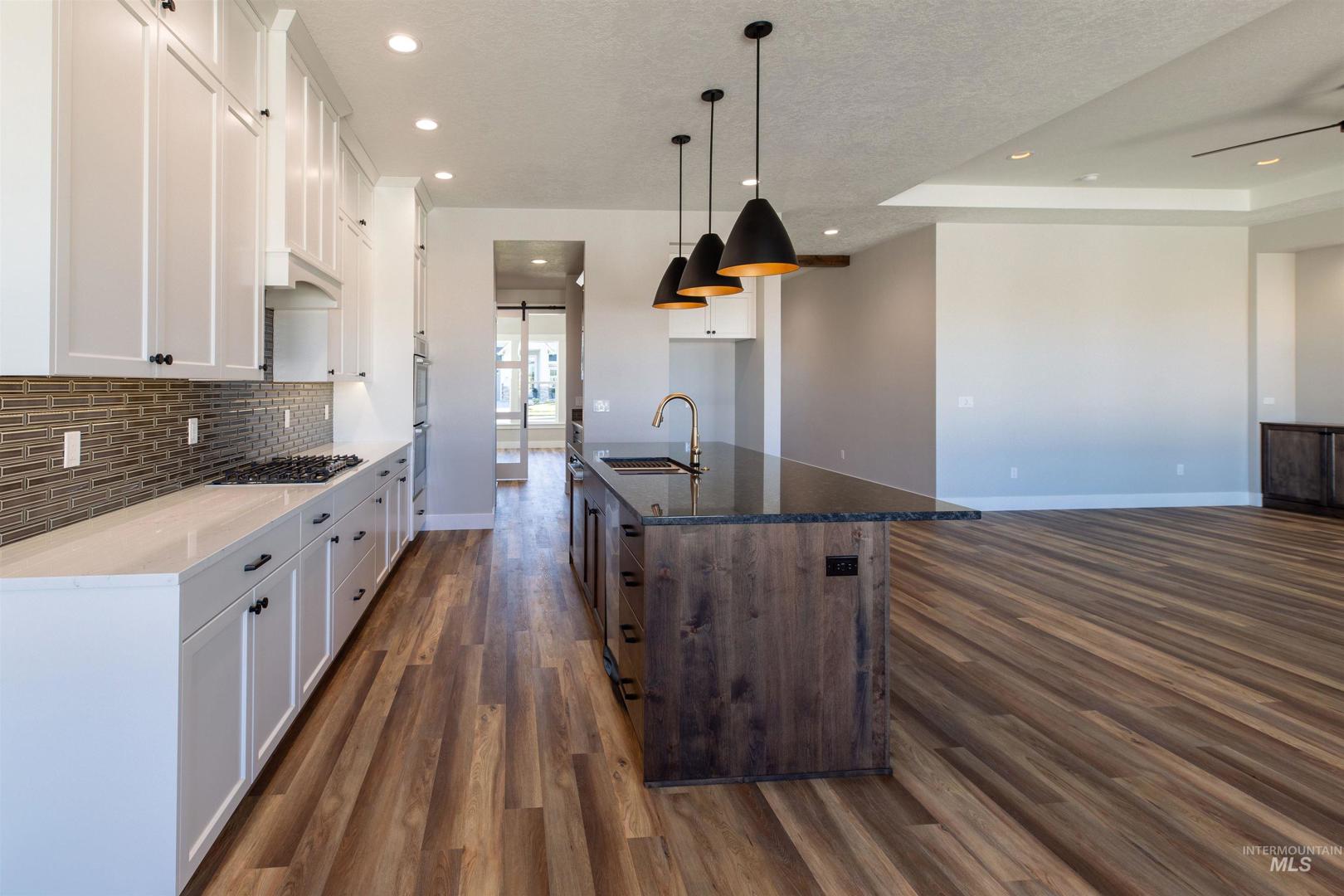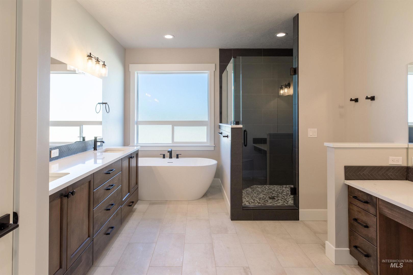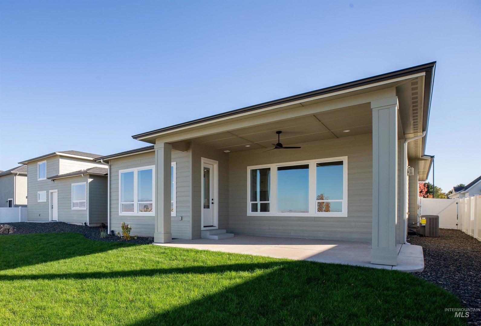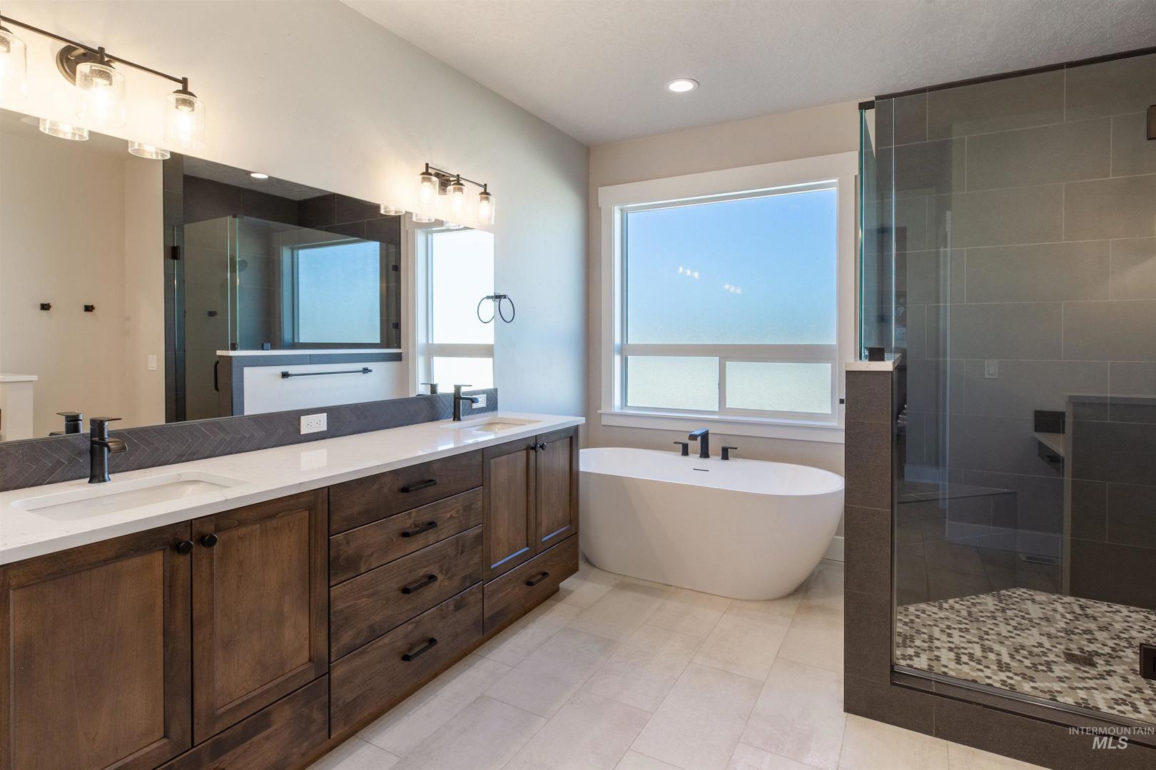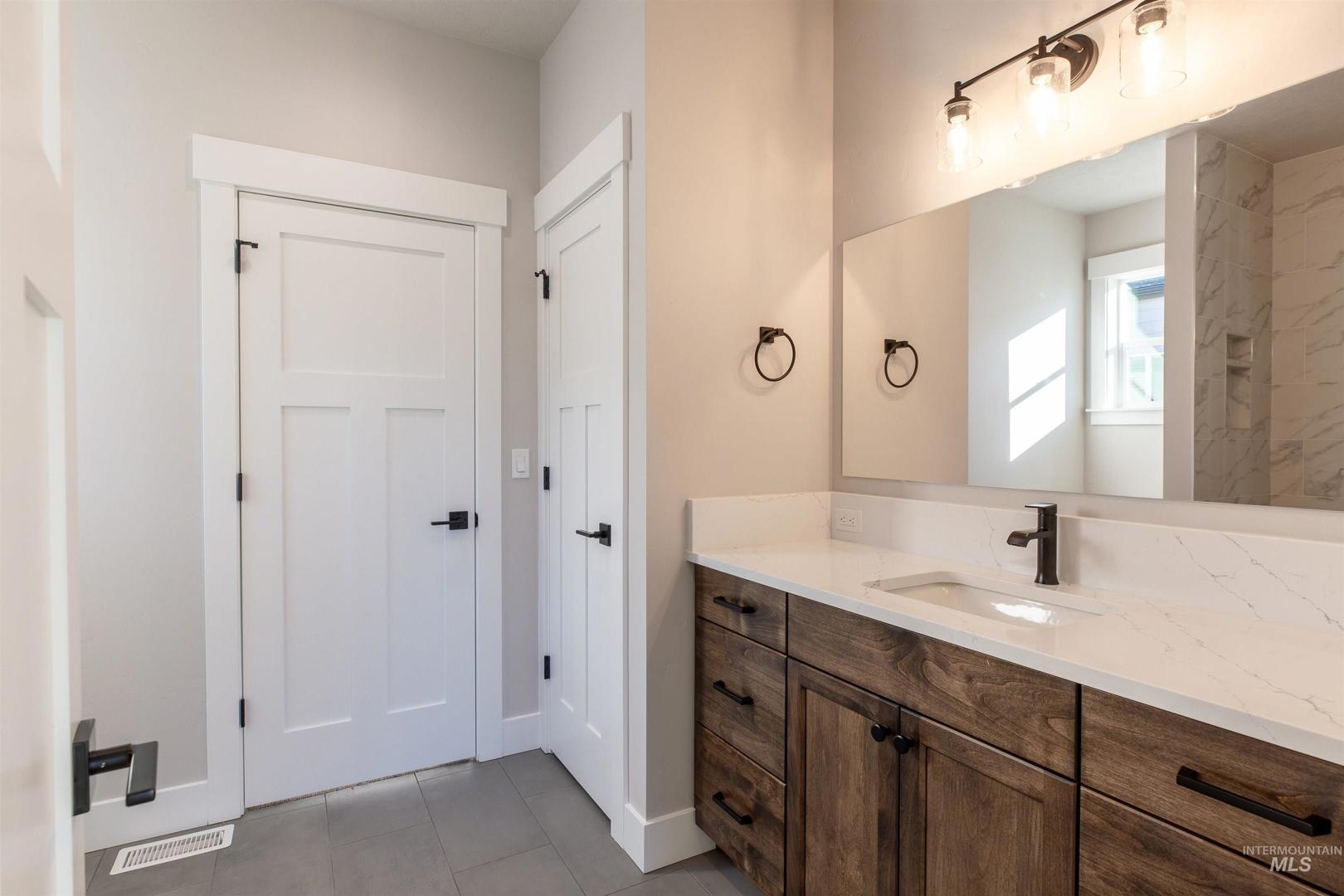 Awesome Jump Creek plan by Rugged Terrain Homes. This split bedroom plan boasts a beautiful primary retreat with a massive walk-in closet, his and hers vanities with tasteful colors and hard surfaces/quartz/tile throughout including the laundry room. Floor to ceiling custom kitchen cabinets with soft close drawers, undermount lighting and butler`s pantry. Living room features coffered ceiling and cozy fireplace flanked by built ins. Secondary bedrooms share a Jack & Jill full bath. Flex/media room w/insulated sound walls for tons of possibilities. Halo can lighting in Primary and Living Rm. AMAZING finished RV garage with fully insulated and separate tool room with own heater & circuit (plus pre-plumbed for sink), 4` LED lighting and tankless water heater. Garage loft has data wiring and views of the mountains. 36ft RV Garage w/work area, multiple circuits including 50Amp plug. Main portion of garage pre-plumbed & vented for gas heater. Good sized covered back patio, space for garden with separate sprinkler zone. New subdivision Shafer View Terrace-complete with tot play lot, pickleball court and picnic gazebo) along with views toward the foothills.