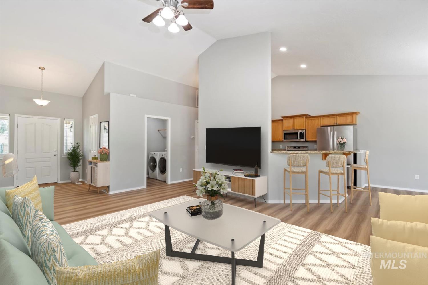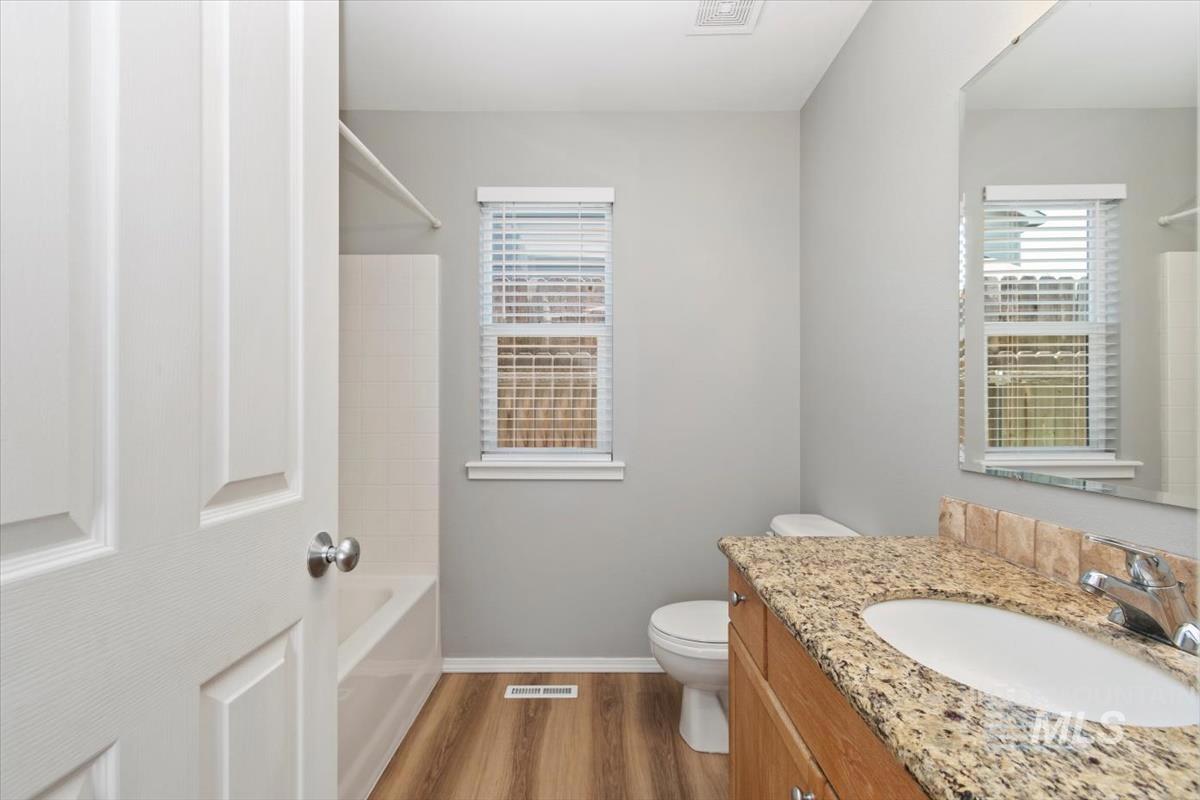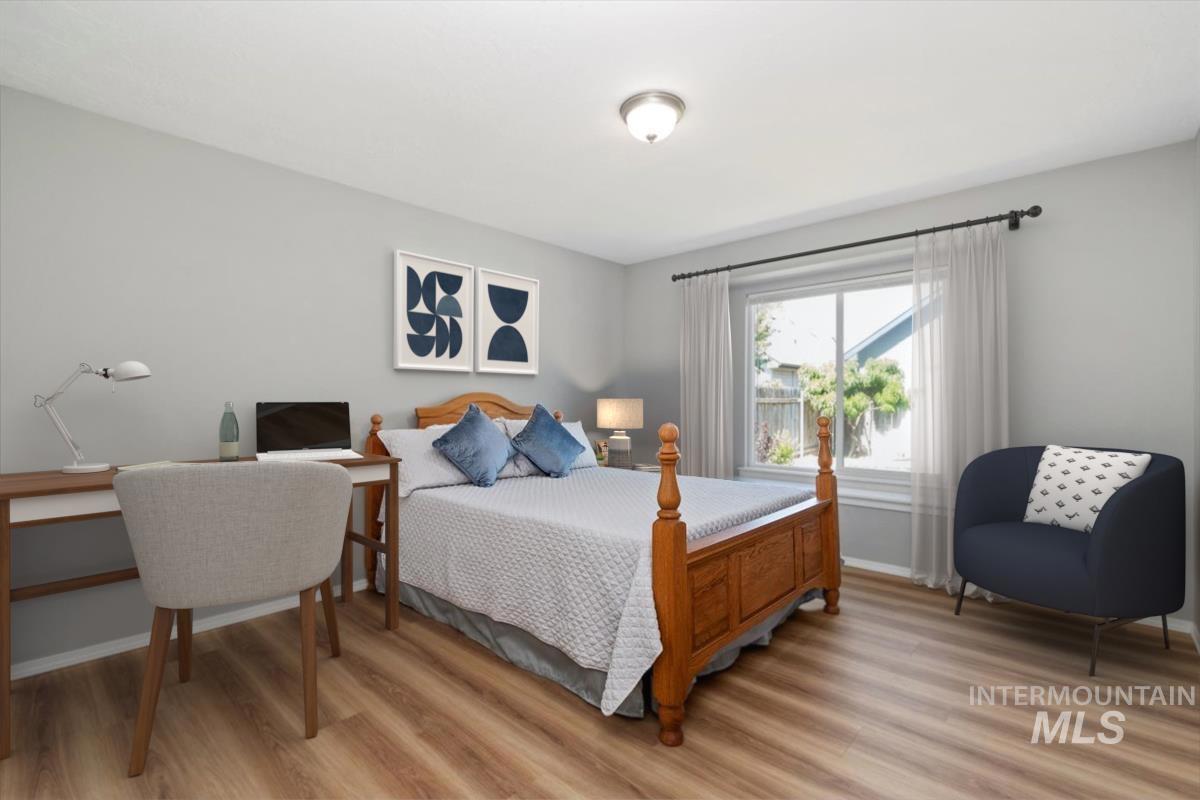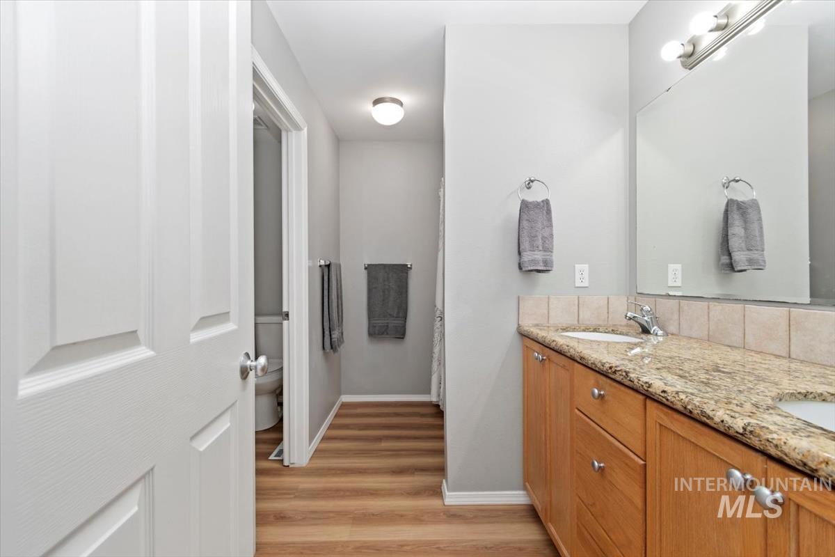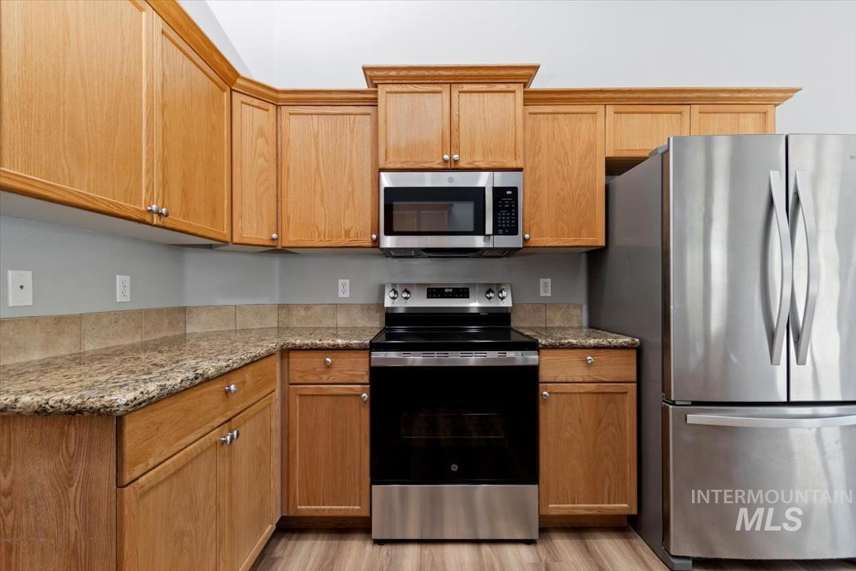 SELLER IS SUPER MOTIVATED! BRING US AN OFFER! Immaculate nearly 1500 square foot single level 3 bed / 2 bath home, with a large three car garage in an excellent, northwest Boise neighborhood. Tucked away, just off Hill Road--Near the foothills, Optimist Sports Complex and Old Town Eagle. Spacious, open living concept floor plan, with vaulted ceilings in the great room and split bedroom design for privacy. Also, brand new LVP flooring throughout. The kitchen features granite countertops, a pantry, breakfast bar, a new stove and microwave, and stainless steel refrigerator. Washer and dryer included as well. The spacious primary bedroom suite includes granite countertops, dual vanities, large walk-in closet and a separate water closet. The backyard features a covered patio, plus extended flagstone perfect for entertaining or raised garden beds, and a hot tub pad with hookup. The landscape has underground sprinklers with drip irrigation, plus there is a covered storage at the side of the house. Irrigation water included in the HOA dues. OPEN HOUSE SAT OCT 18th from 11am to 1pm. .