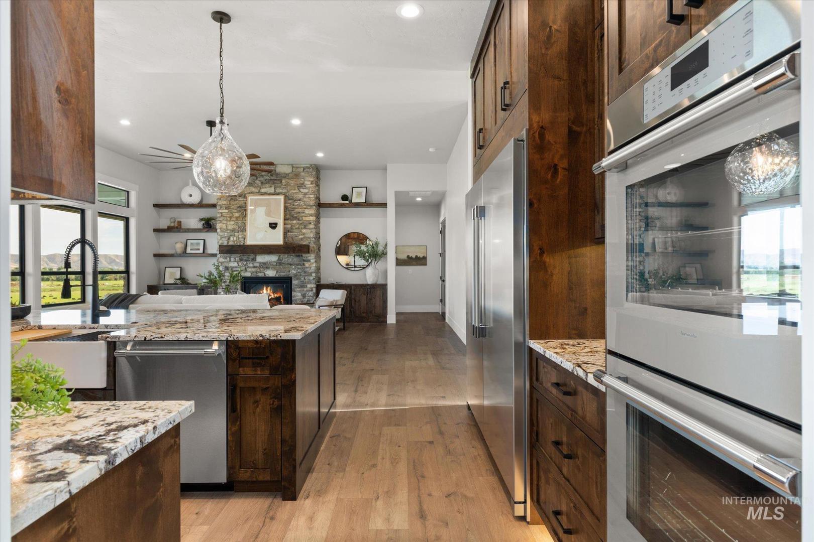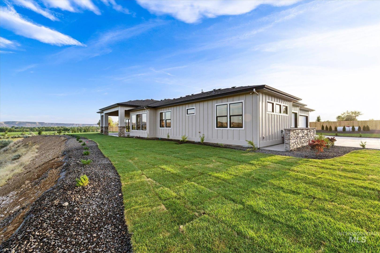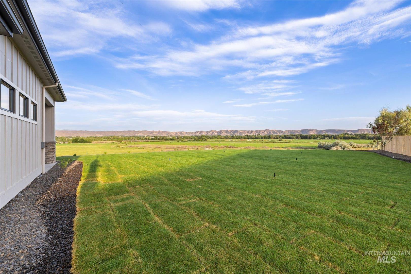 New construction perched on a bluff, surrounded by farmland w/ expansive mountain & valley views. 4-bedroom, 2.5-bath, 2,950 sqft single-level home blends quality craftsmanship w/ modern design. The gourmet kitchen features high-end built-in appliances, quartz countertops, a large center island, modern tile backsplash, walk-in pantry, & custom cabinetry. The split-bedroom floorplan offers privacy & function, w/ a luxurious primary suite including a spa-like bath, walk-in shower, dual vanities, & an oversized walk-in closet. On the opposite side of the home are two bedrooms & a private office that can serve as a fourth bedroom. LVP flooring runs throughout the kitchen, living, office, foyer and primary bedroom. Tons of natural light, this home includes soaring ceilings, a gas fireplace w/ floor-to-ceiling stone, a wall of windows w/ 8-ft doors, built-in shelving, & a extra-large slider leading to a covered patio & private, southeast-facing backyard. PLEASE GO SLOW ON GRAVEL ROAD - 5MPH- SMALL KIDS PLAY IN ROAD