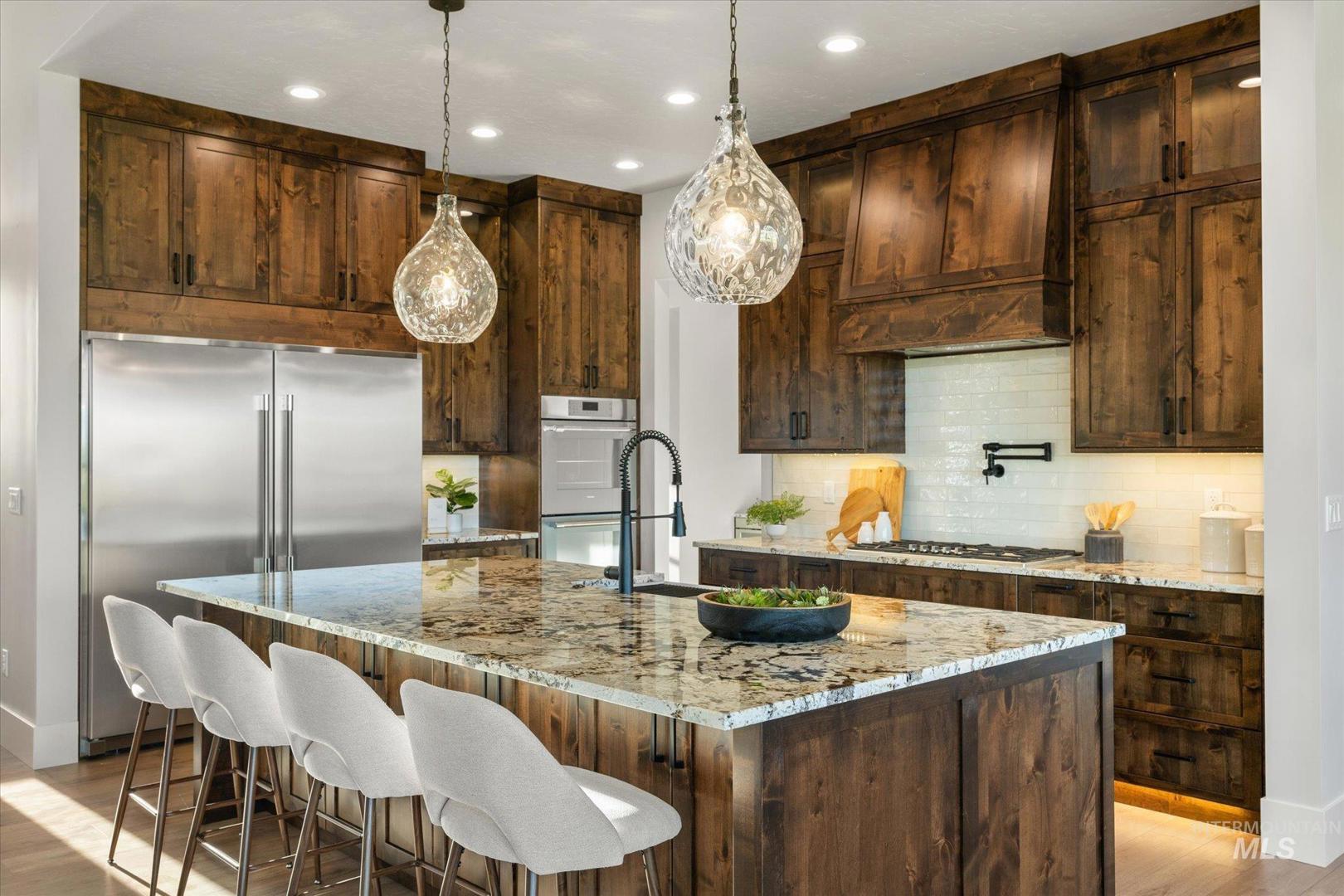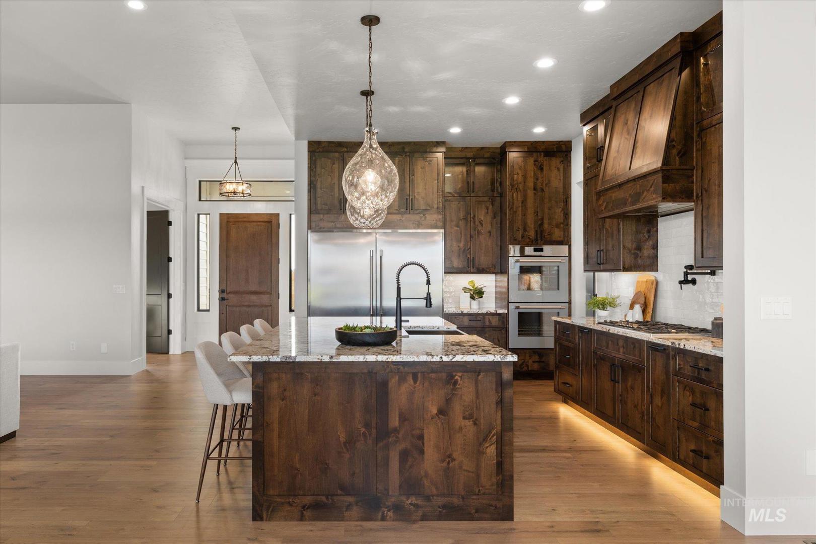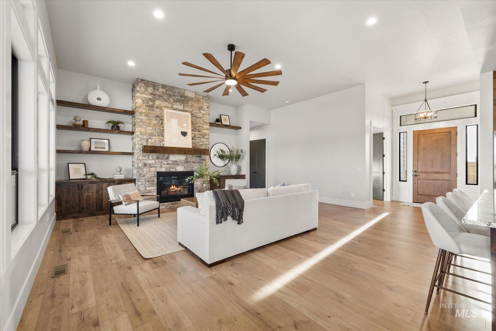 New construction perched on a bluff, surrounded by farmland w/ expansive mountain & valley views. 4-bedroom, 2.5-bath, 2,950 sqft single-level home blends quality craftsmanship w/ modern design. The gourmet kitchen features high-end built-in appliances, quartz countertops, a large center island, modern tile backsplash, walk-in pantry, & custom cabinetry. The split-bedroom floorplan offers privacy & function, w/ a luxurious primary suite including a spa-like bath, walk-in shower, dual vanities, & an oversized walk-in closet. On the opposite side of the home are two bedrooms & a private office that can serve as a fourth bedroom. LVP flooring runs throughout the kitchen, living, office, foyer and primary bedroom. Tons of natural light, this home includes soaring ceilings, a gas fireplace w/ floor-to-ceiling stone, a wall of windows w/ 8-ft doors, built-in shelving, & a extra-large slider leading to a covered patio & private, southeast-facing backyard. PLEASE GO SLOW ON GRAVEL ROAD - 5MPH- SMALL KIDS PLAY IN ROAD