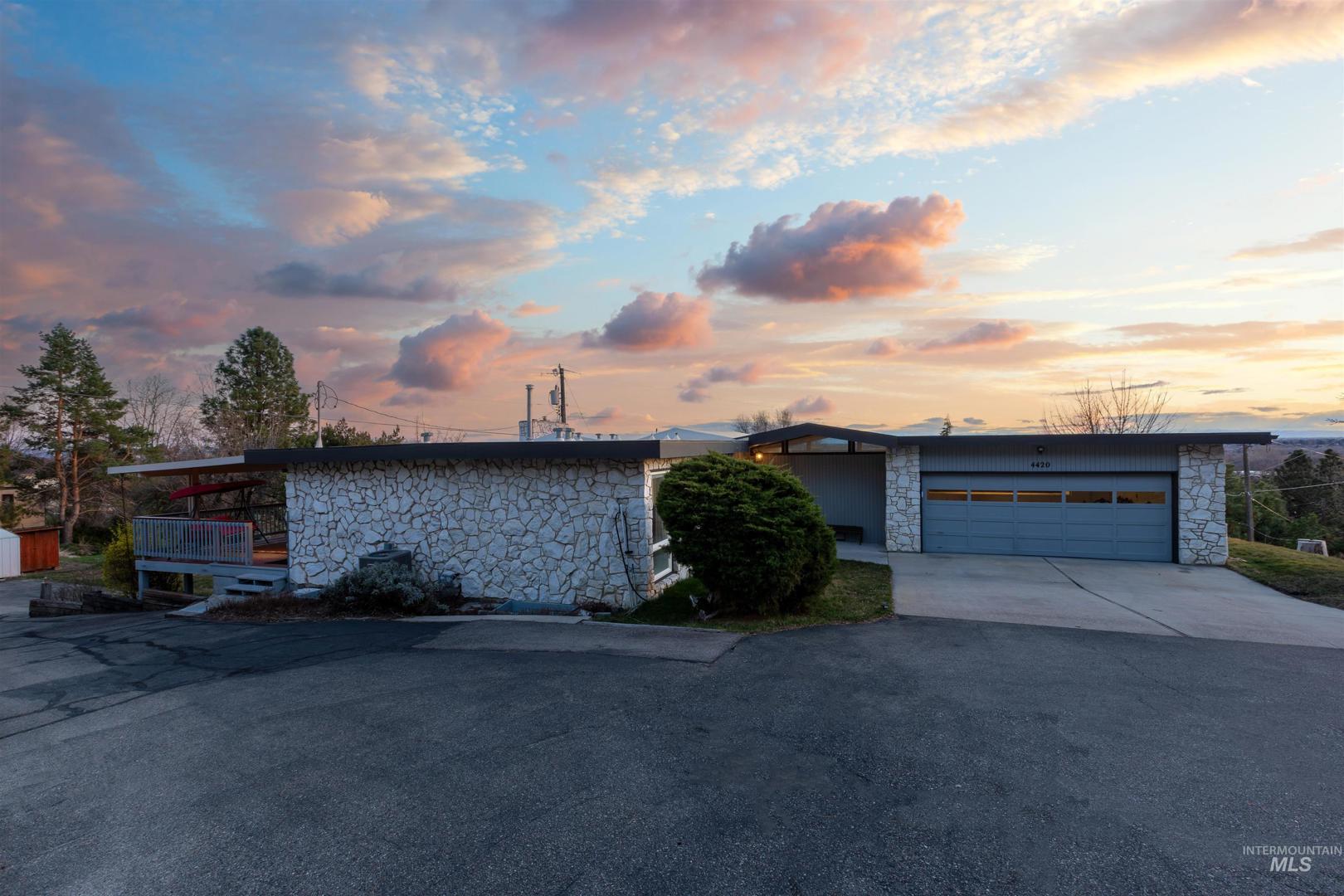 Stunning multi-generational North Boise Foothills home with sweeping panoramic views of downtown Boise and the Owyhee Mountains. This Mid-Century Modern gem features striking architecture, a distinctive roofline, and rare white onyx exterior stonework. Spacious living areas include separate quarters with private entrance in the daylight basement. Ideal for extended family or potential rental income. Enjoy year-round entertaining on the expansive wraparound deck, offering both covered and sunlit spaces to soak in the incredible views. Recent upgrades include a newer roof, new AC and coil, and a new water heater—leaving the heavy lifting done and ready for your finishing touches to restore this Boise masterpiece. Appliances include 2 refrigerators, 2 washer/dryer sets, 2 dishwashers, and 2 stoves—perfectly set up for multi-generational living or a private downstairs unit with its own carport.
