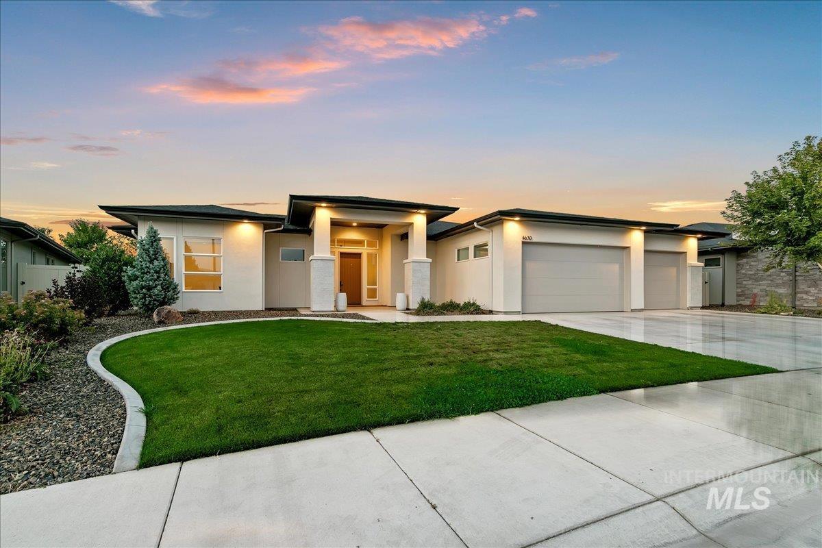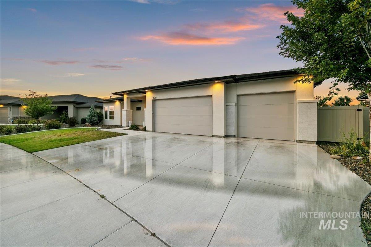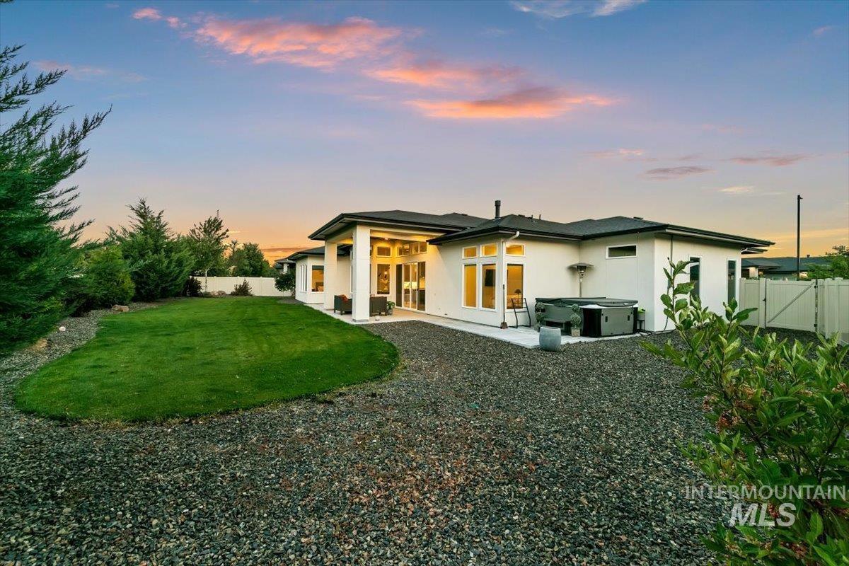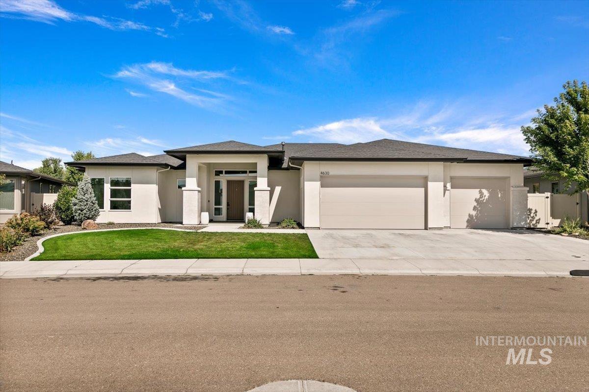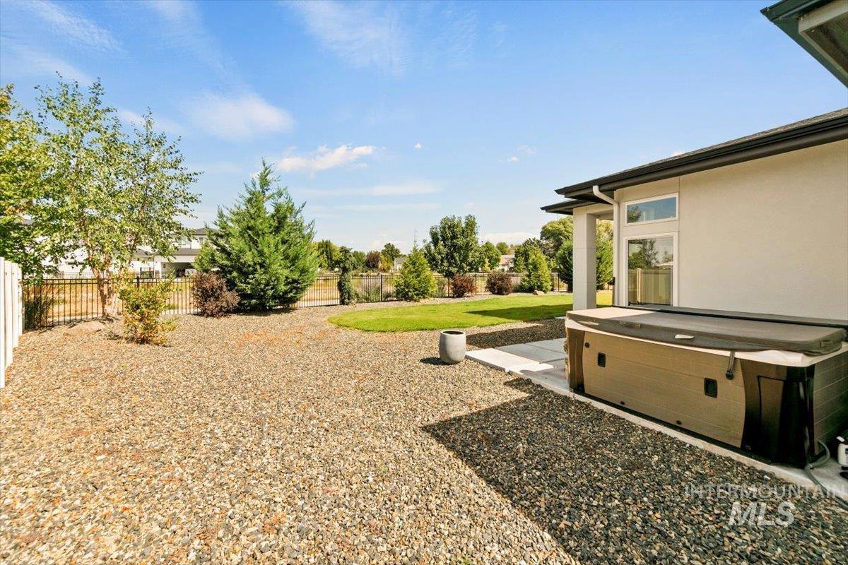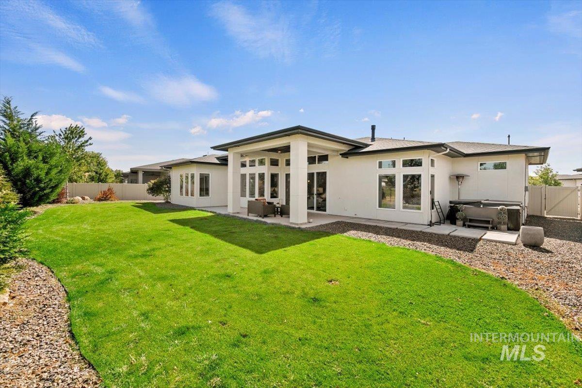 Welcome to this beautiful ZEC home in the highly desirable Movado Estates community, where thoughtful design meets luxury, comfort, and functionality. Inside, soaring 12’ and 10’ ceilings, transom windows, and an open-concept layout create a bright, inviting atmosphere. The chef-inspired kitchen features a Bosch 5-burner cooktop, Bosch chimney hood, and sleek quartz countertops, opening to a spacious living area centered around a cozy gas fireplace. The luxury primary suite is designed as a retreat, complete with a soaking tub, dual vanities, walk-in shower, and generous walk-in closet. Step outside to your private backyard oasis with full landscaping, a covered patio, hot tub, and no rear neighbors. An attached 3-car garage with epoxy-coated floors provides both storage and convenience, while community amenities include a pool, park, and walking paths, all just minutes from shopping, dining, and freeway access. This is Idaho living at its finest.